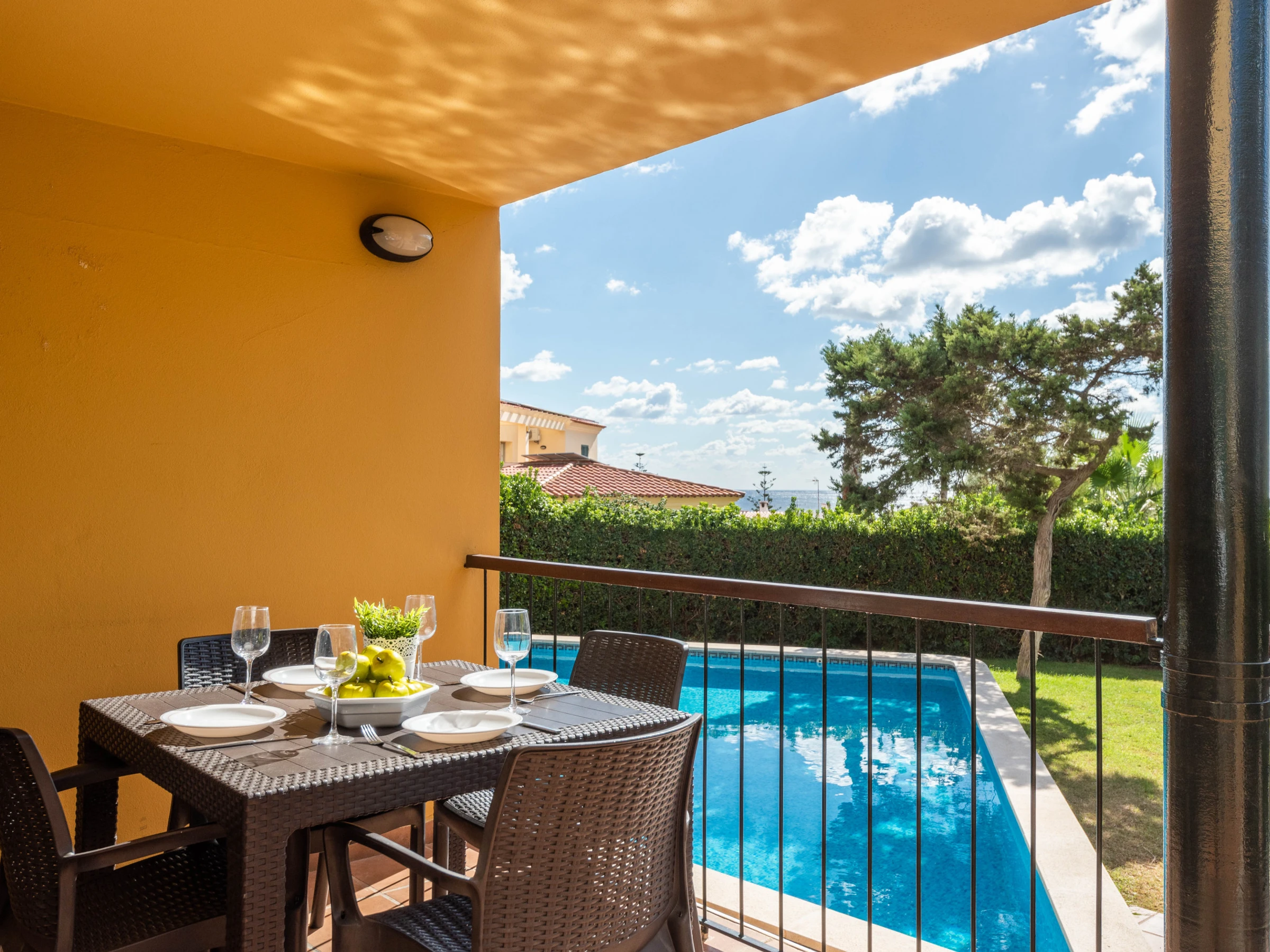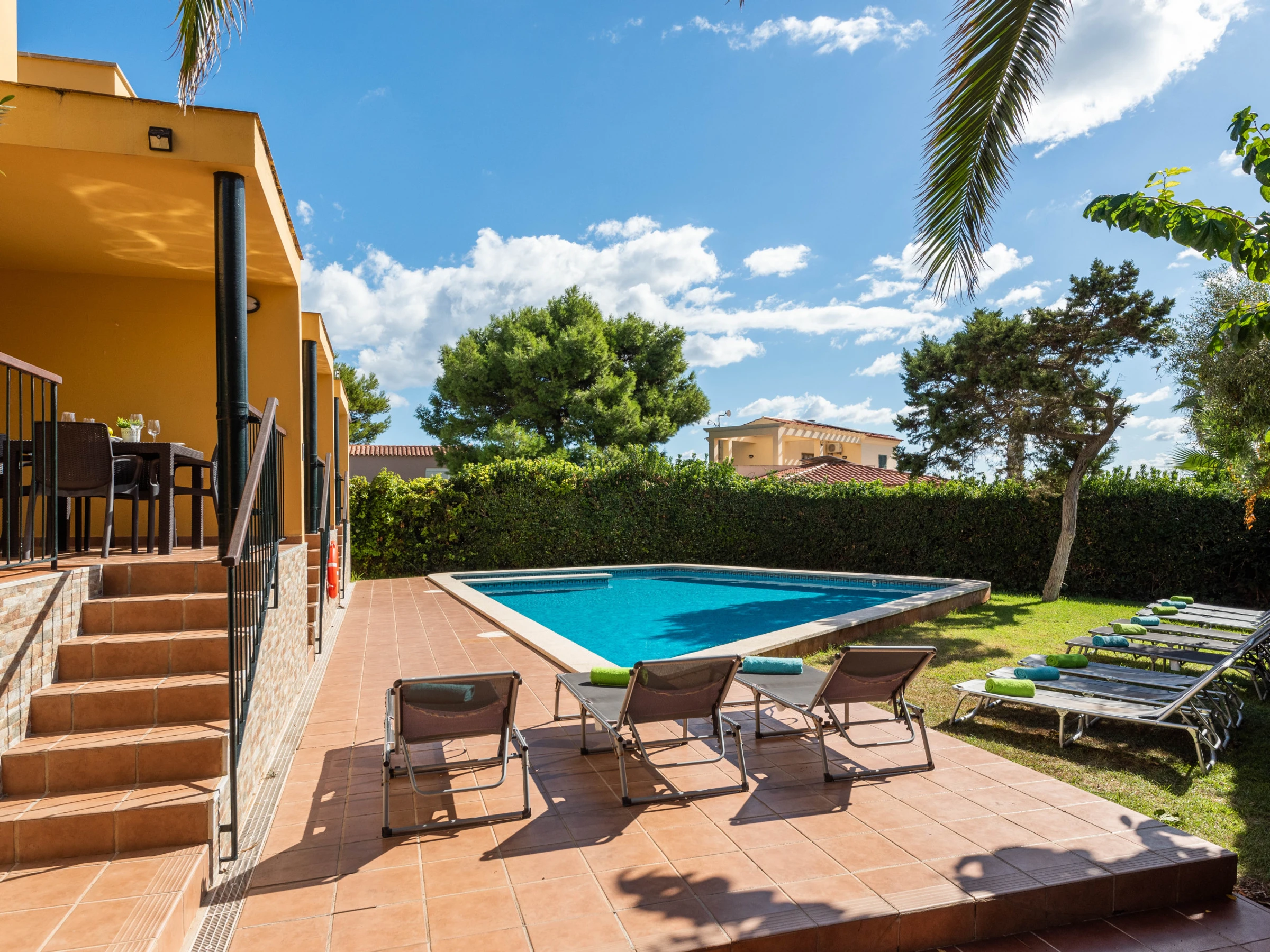 The interior of the house is accessed from a terrace, with table and chairs furniture and built-in BBQ with views of the pool and garden where you can prepare tasty barbecues and enjoy long summer days with the family.