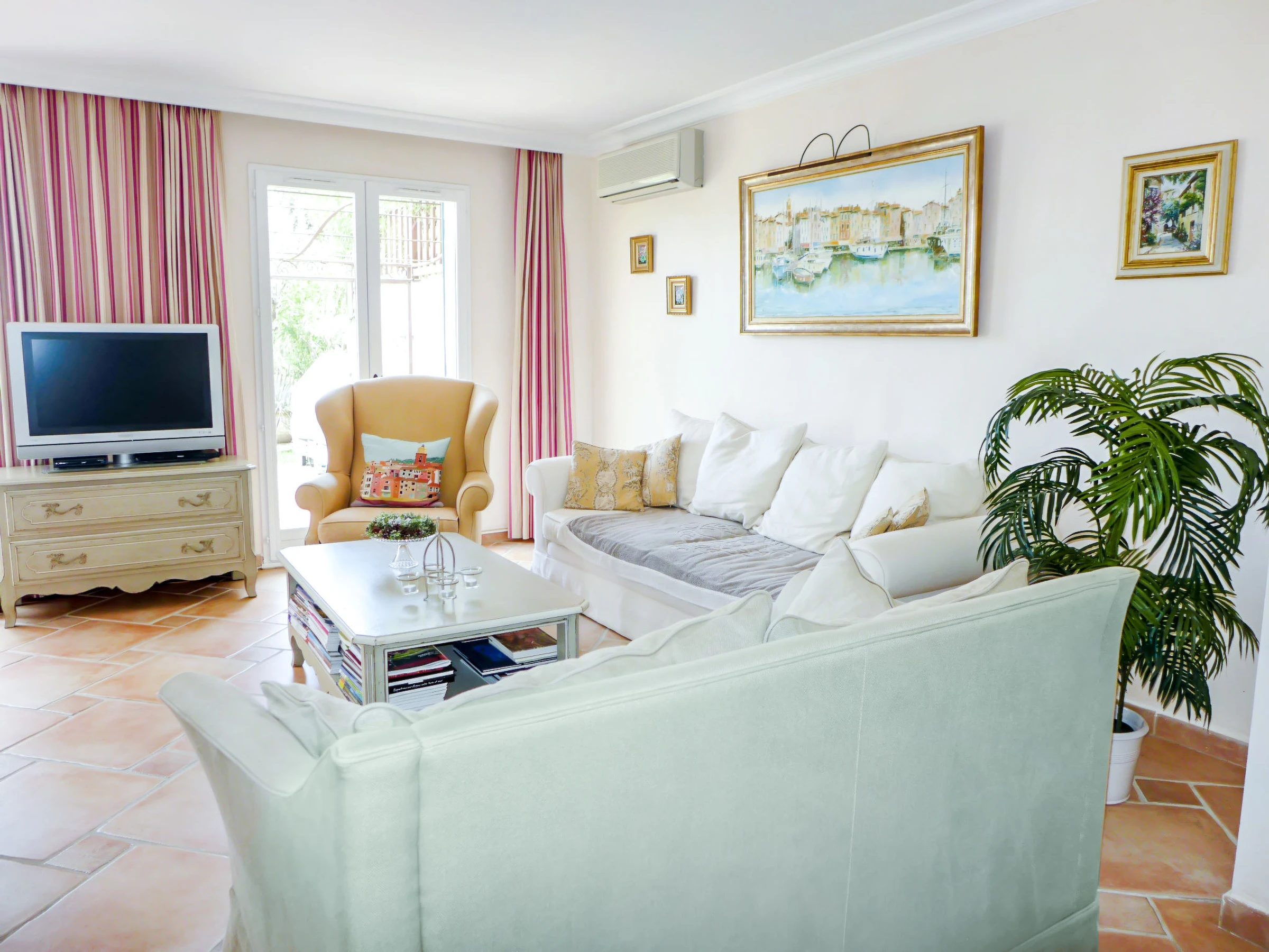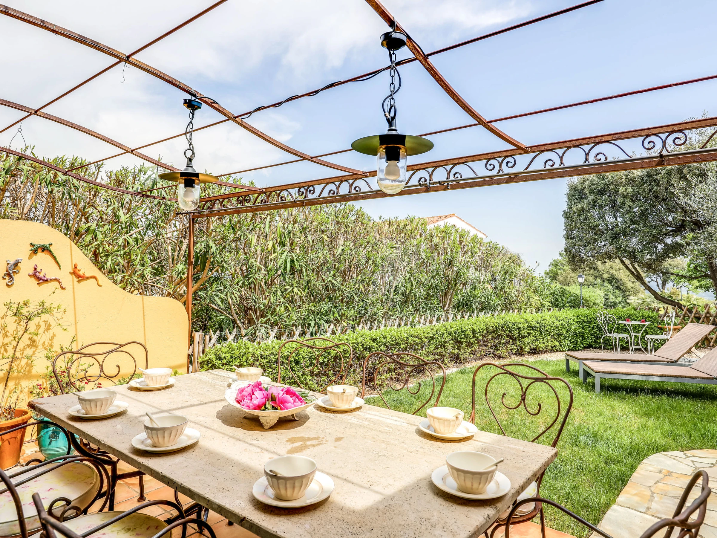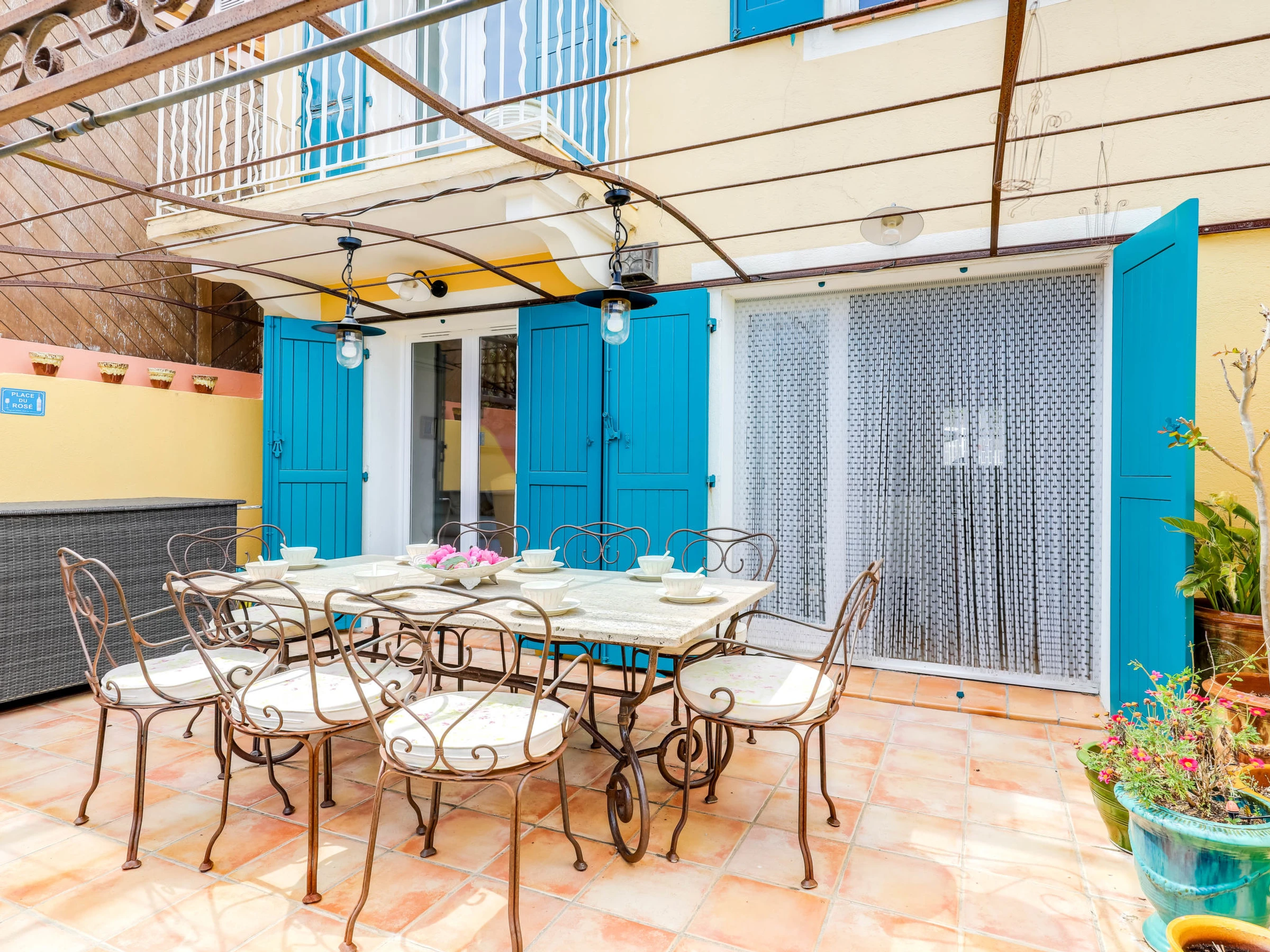 5-room terraced house 130 m2 on 3 levels. Comfortable and beautiful furnishings: living/dining room with TV (flat screen), air conditioning. Exit to the garden, to the terrace. Open kitchen (oven, dishwasher, 4 ceramic glass hob hotplates, toaster, kettle, microwave, freezer, electric coffee machine). Sep. WC. Upper floor: 1 room with 1 french bed (1 x 160 cm, length 200 cm), fan. Exit to the balcony. 1 room with 1 french bed (1 x 160 cm, length 200 cm), shower/WC. Bathroom. 2nd upper floor: 1 room with 1 french bed (1 x 160 cm, length 200 cm), shower/WC and fan. 1 room with 1 french bed (1 x 160 cm, length 200 cm), shower/WC. Exit to the terrace. Balcony 2 m2, terrace 9 m2, roofed terrace 18 m2, roofed, patio 40 m2. Terrace furniture, barbecue, deck chairs (2). View of the sea. Facilities: washing machine, iron, hair dryer. Internet (WiFi, free). Please note: 1 pet/ dog allowed. Smoke alarm. [hidden]