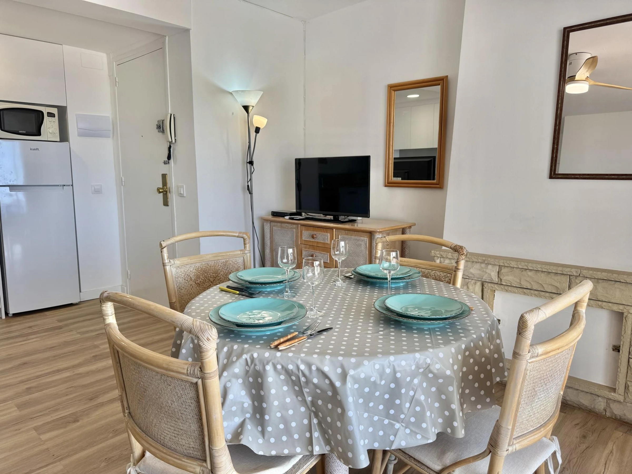 * Bright living-dining room with sofa, TV with TNT SAT (French channels), and Wifi.