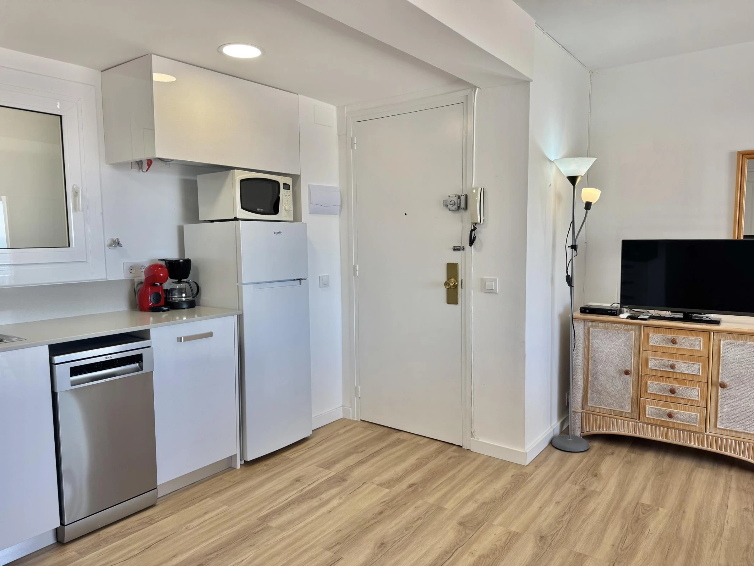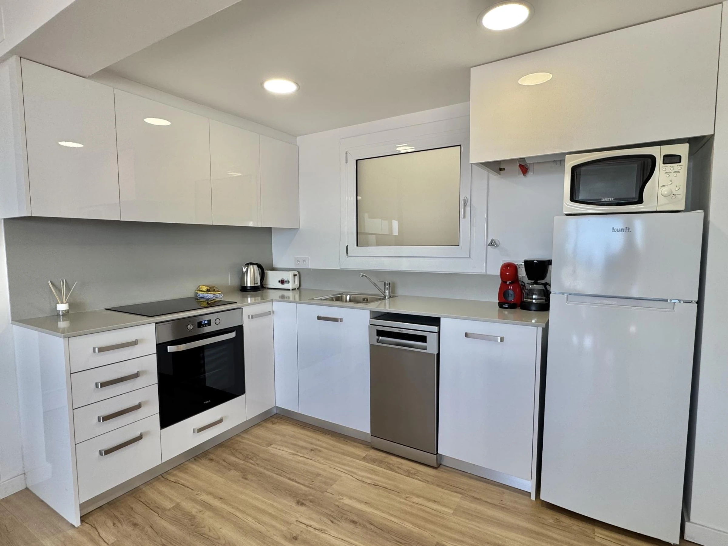 * Recently renovated and fully equipped kitchen with fridge, freezer, dishwasher, oven, Dolce Gusto coffee machine, microwave, toaster, and kettle.