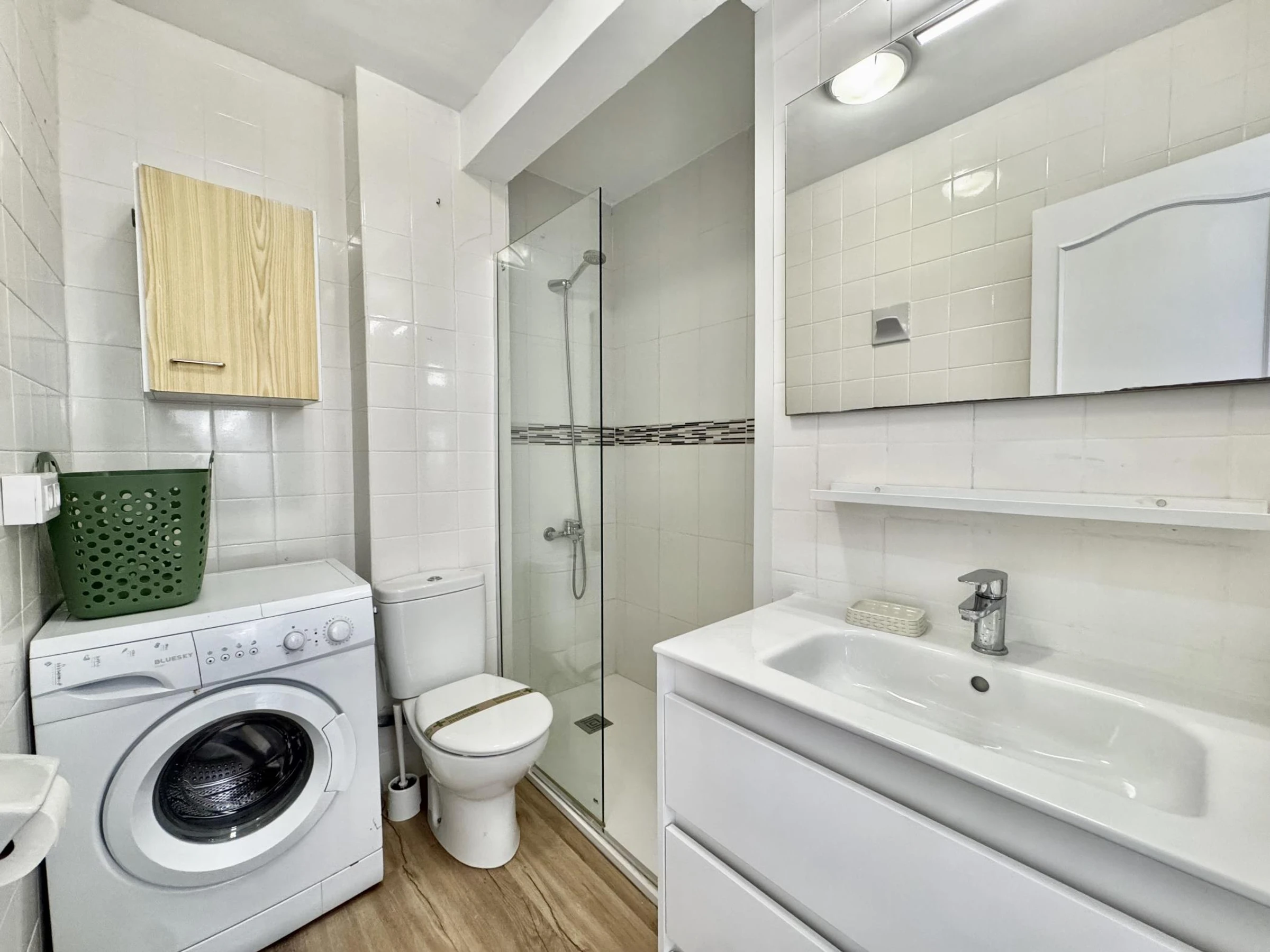 * Full bathroom with shower and washing machine.