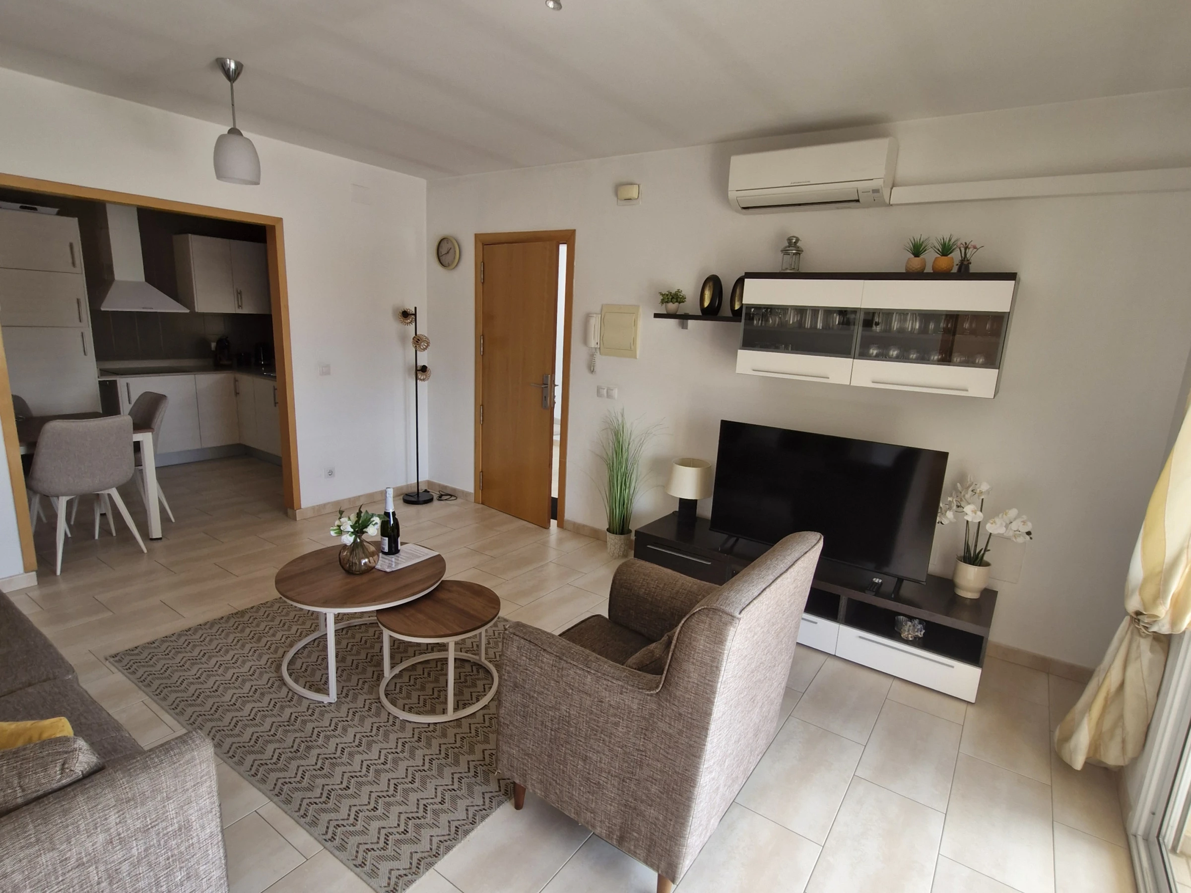 The interior of the apartment has been designed to combine functionality and elegance. The open-concept kitchen is fully equipped with a dishwasher, coffee maker, toaster, kettle, tableware, and all the necessary utensils to prepare your favorite meals with ease. The seamless layout leads to the living room, which features a Smart TV with high-speed WiFi to ensure entertainment and connectivity at all times.