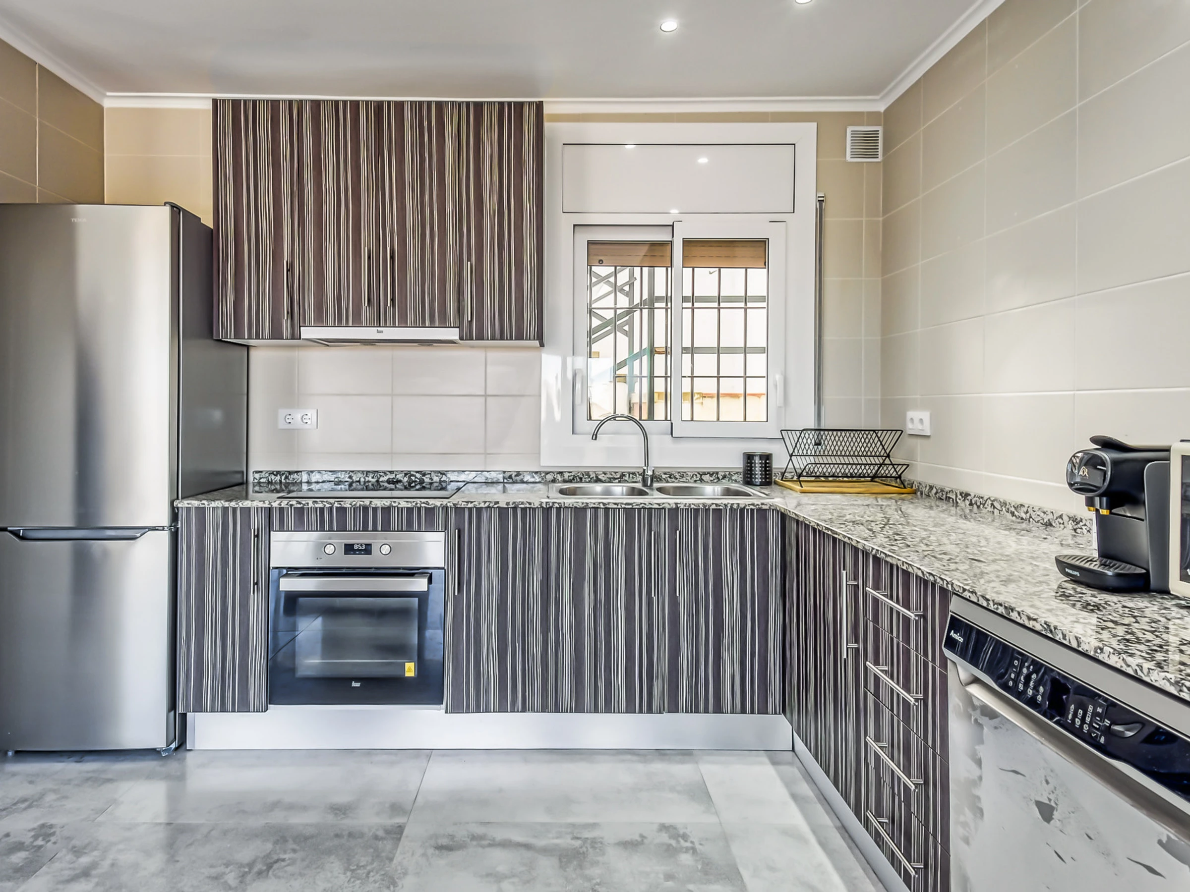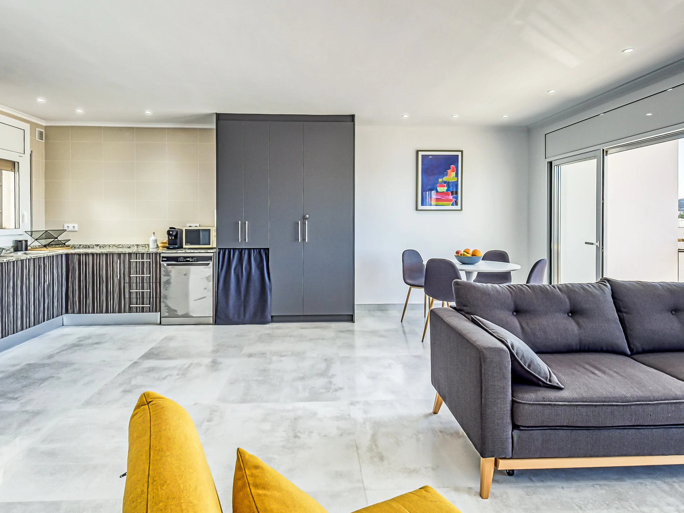 The open-plan kitchen, with a ceramic hob, is equipped with a fridge, microwave, oven, freezer, crockery/cutlery, cooking utensils, coffee maker and toaster.