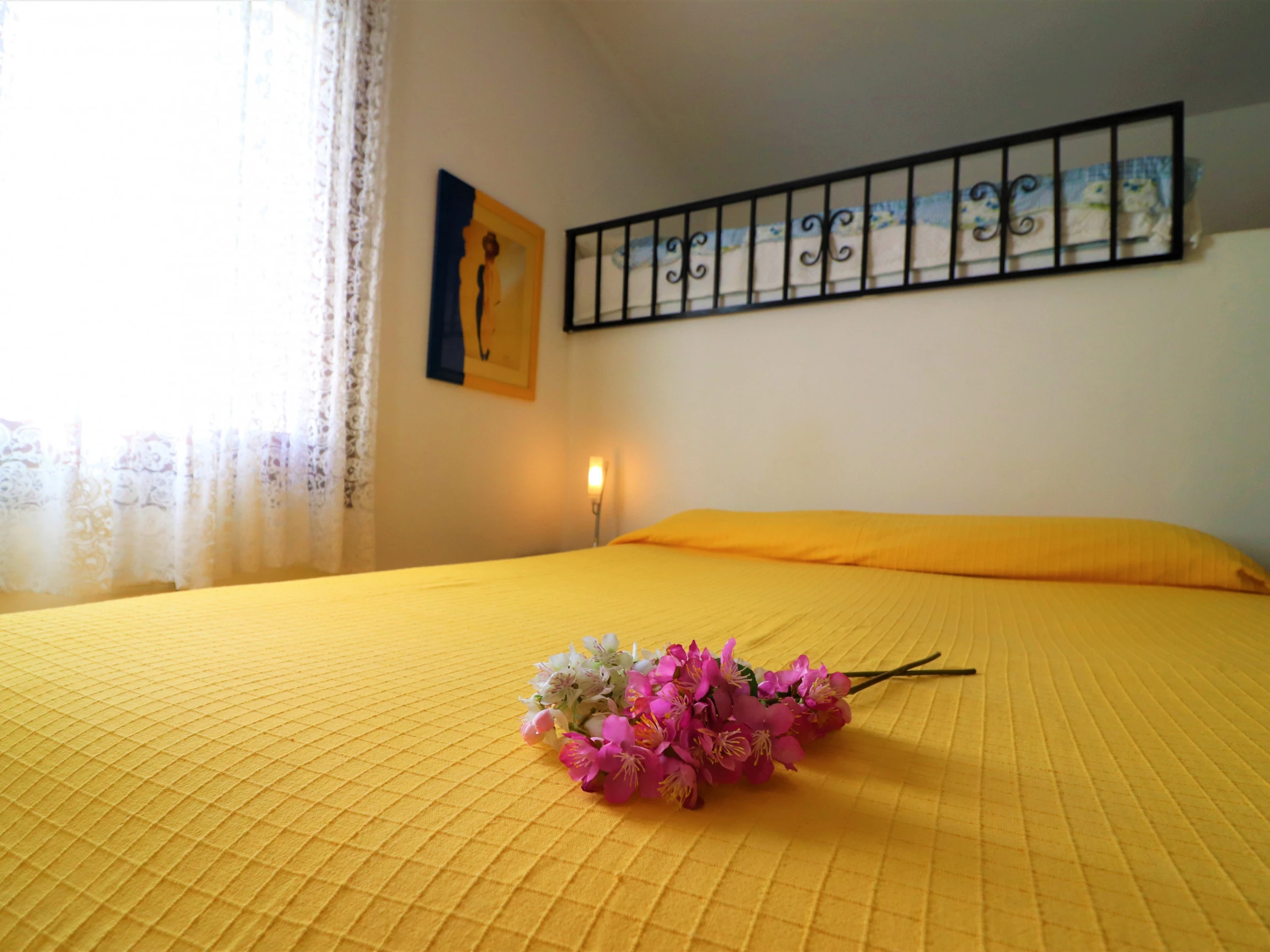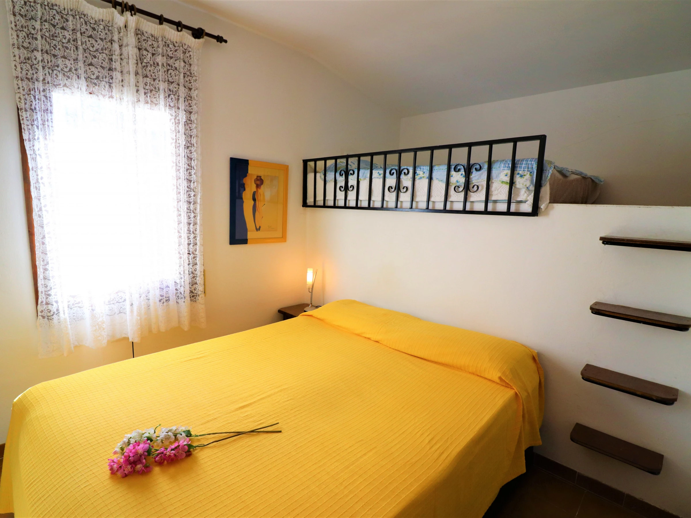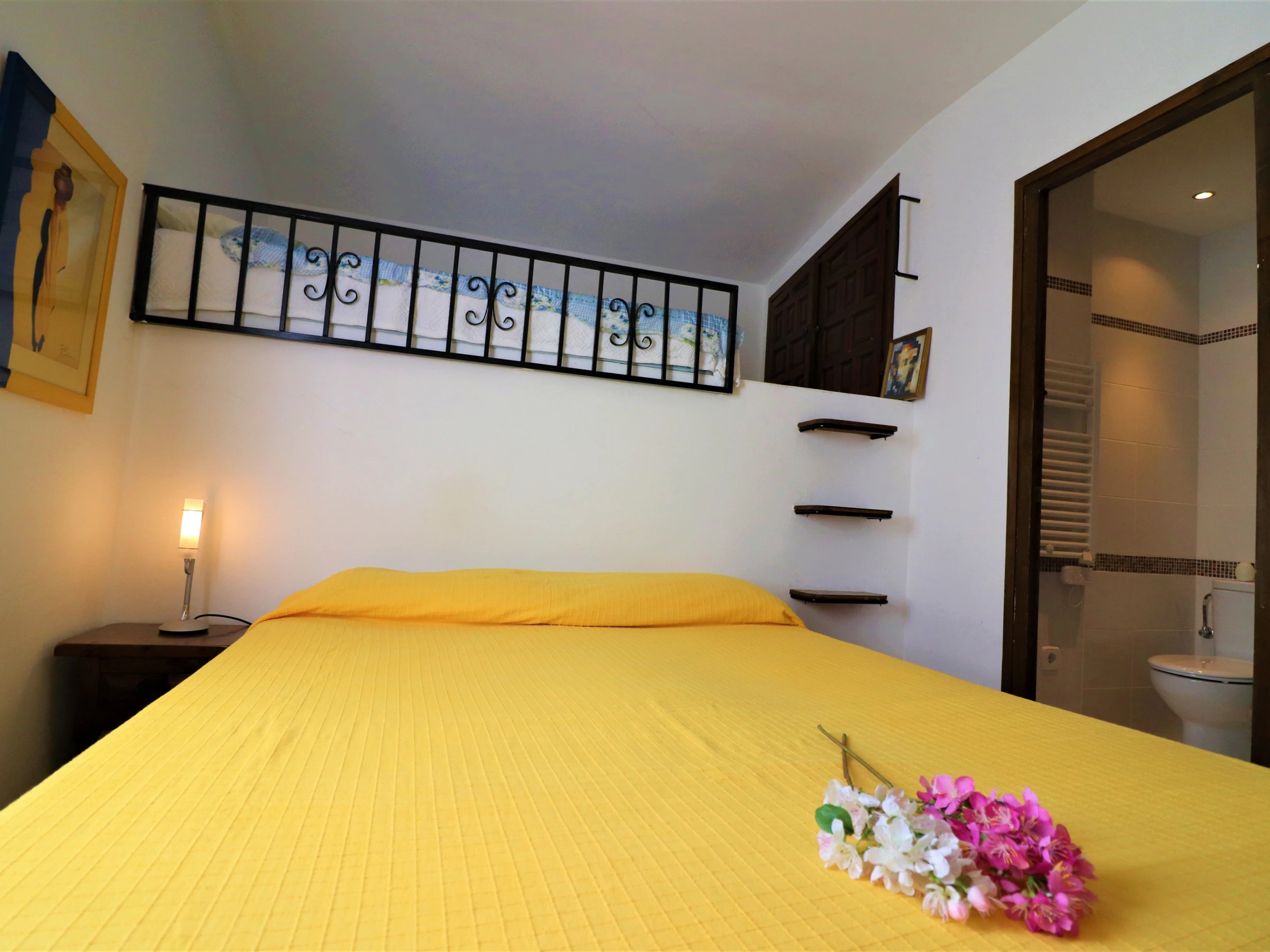 - A bedroom with one large bed and an extra bed on the mezzanine level, bedside tables, chest of drawers.