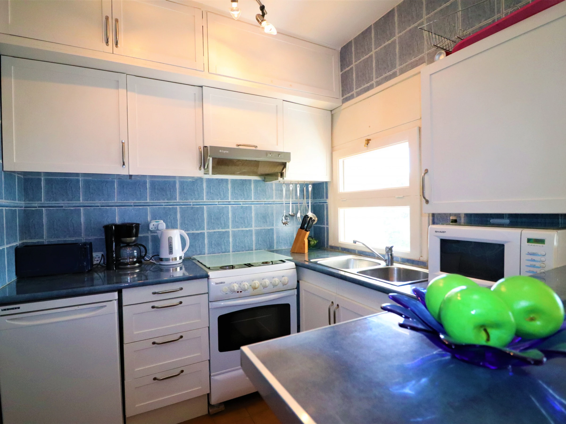 - Fully equipped American kitchen, with hob, oven, microwave, fridge / freezer, all necessary utensils and cupboards at the top and bottom.