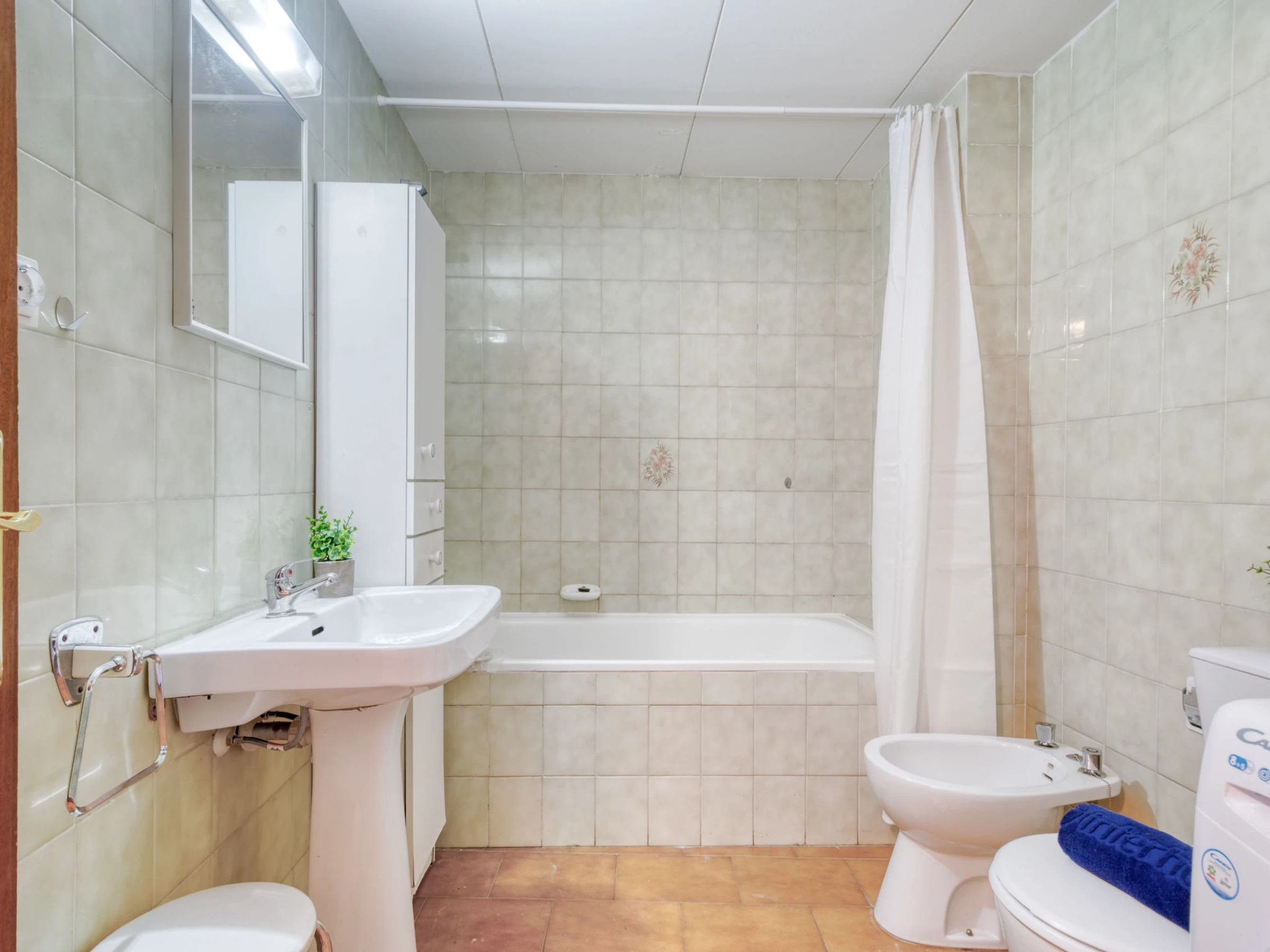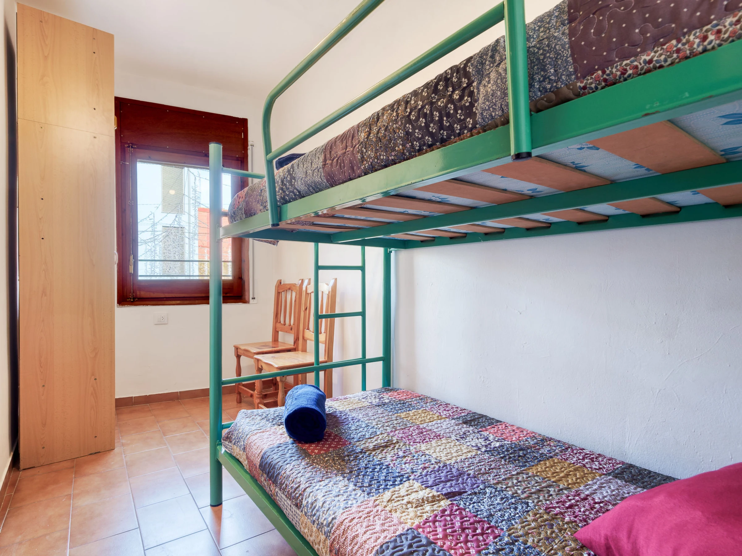 4-room apartment 70 m2 on 2nd floor. Simple and comfortable furnishings: living/dining room with dining table, digital TV, air conditioning and forced-air heating. 1 room with 1 french bed (140 cm, length 190 cm). 1 room with 1 bed (90 cm, length 190 cm). 1 room with 1 x 2 bunk beds (90 cm, length 190 cm). Small, open kitchen (dishwasher, 2 ceramic glass hob hotplates, toaster, kettle, microwave, freezer, electric coffee machine). Bath/bidet/WC. Boiler (100 litres). View of the resort. Facilities: washing machine, iron, hair dryer. Internet (WiFi, free). Please note: non-smokers only. No lift. [hidden] // Reg. Nr.: ESFCTU00001701900008774400000000000000000[hidden]9