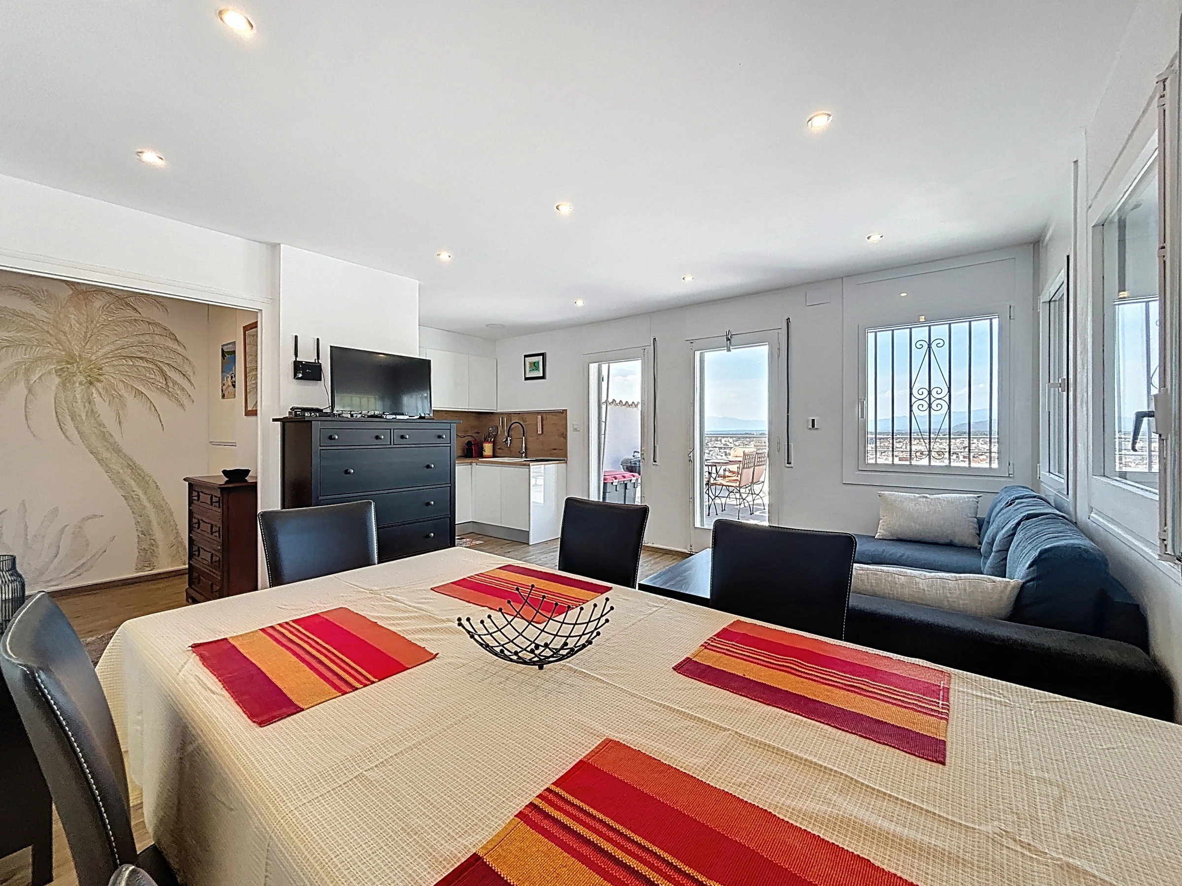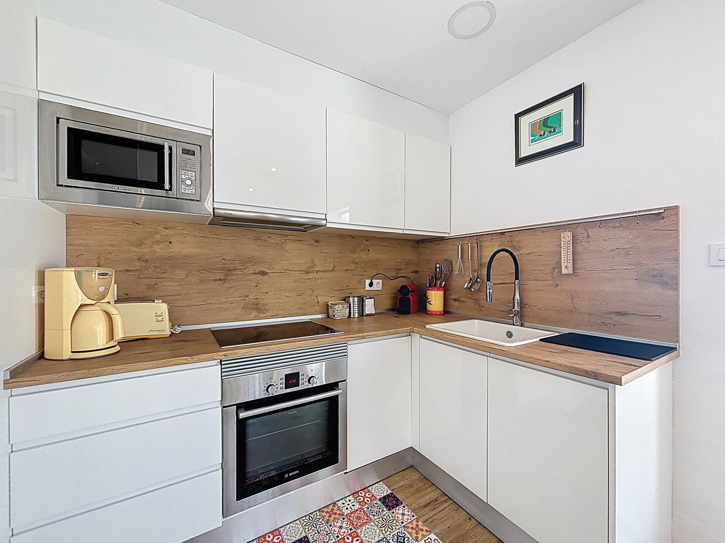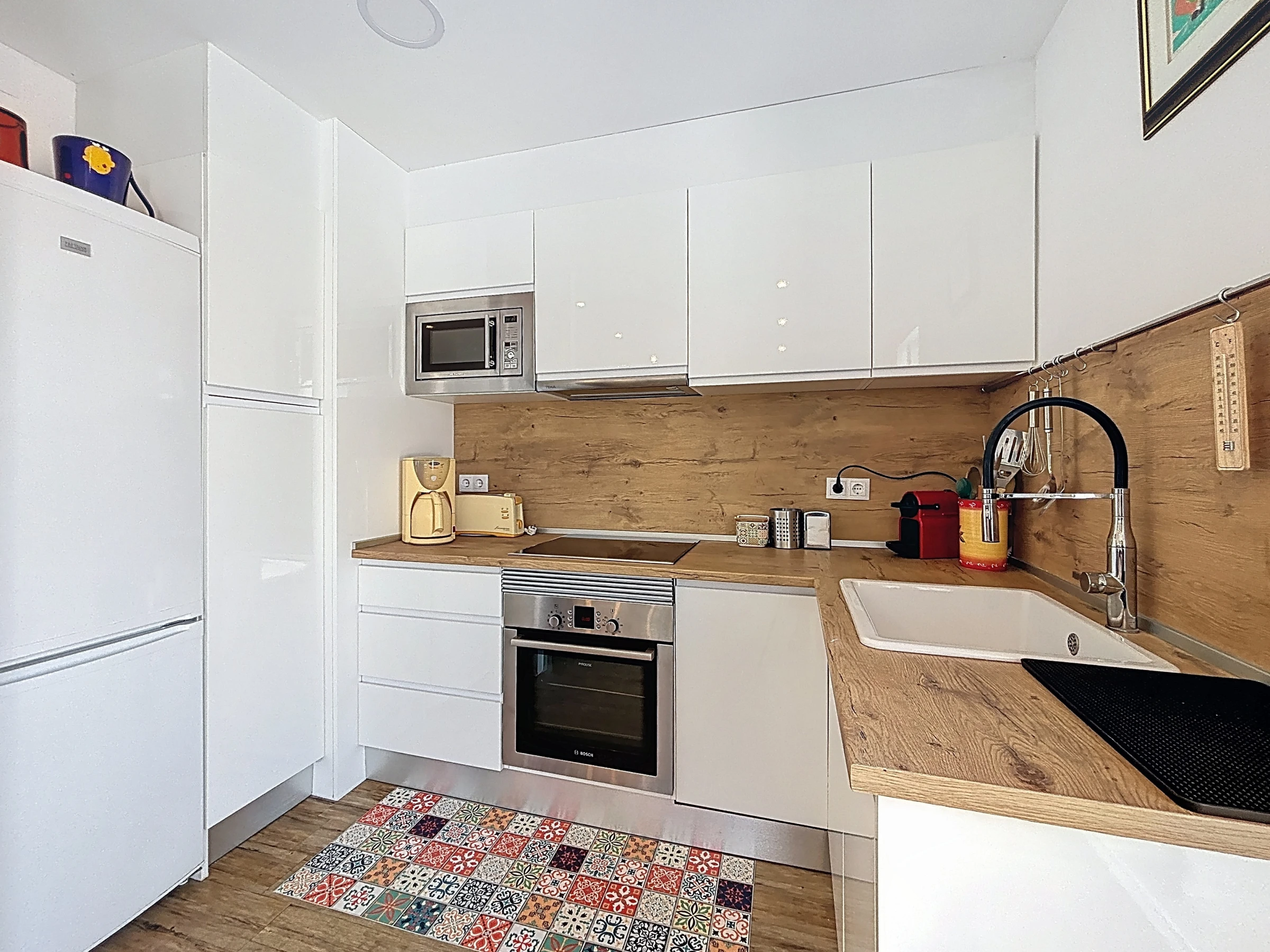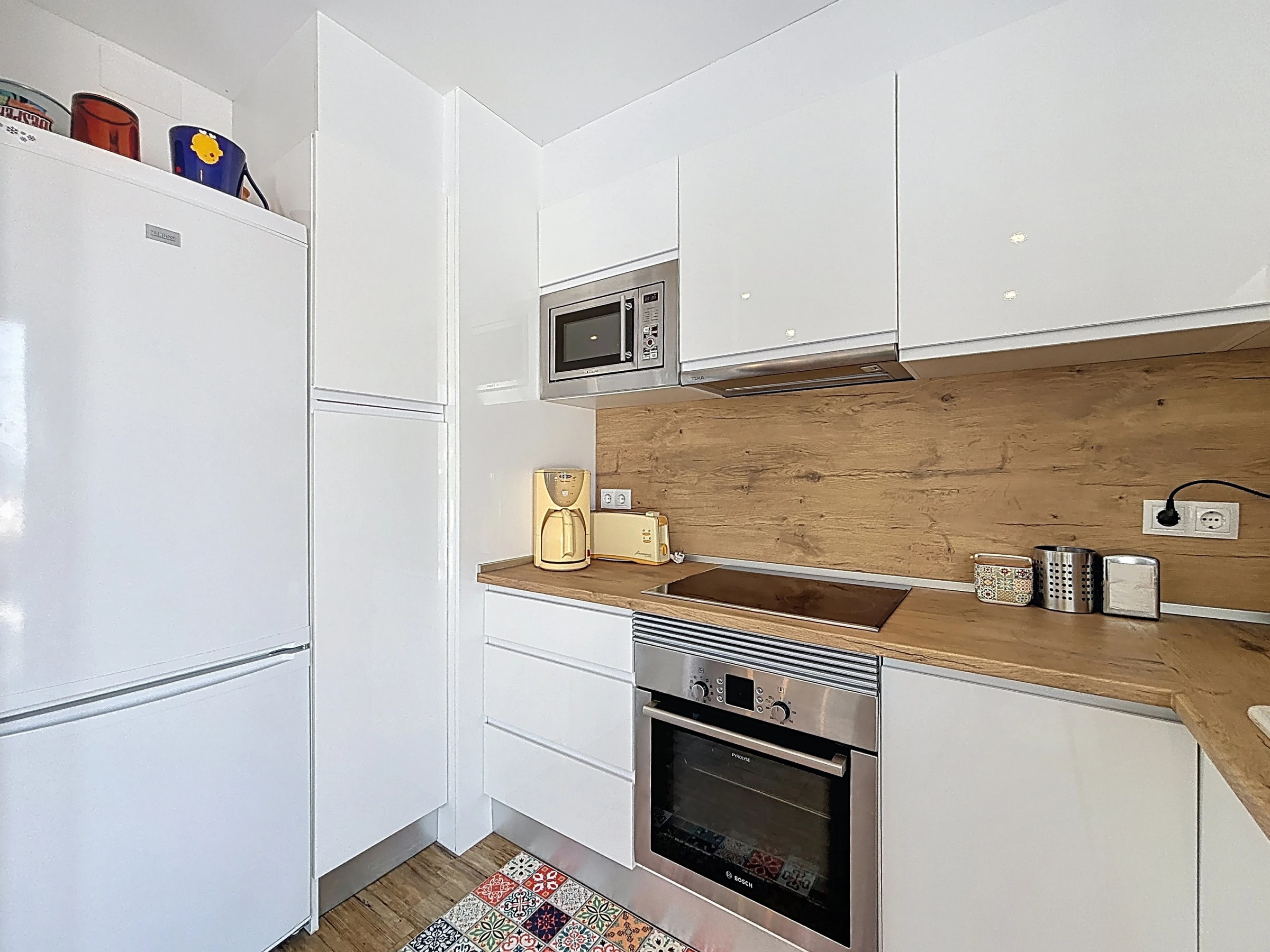 The apartment has two pleasant bedrooms, with a total of three sleeping spaces: two double beds and a sofa bed, offering great flexibility for all travellers. The fully equipped open-plan kitchen will allow you to easily prepare your meals thanks to its many appliances: refrigerator, freezer, dishwasher, oven, microwave, coffee machine, kettle and toaster.