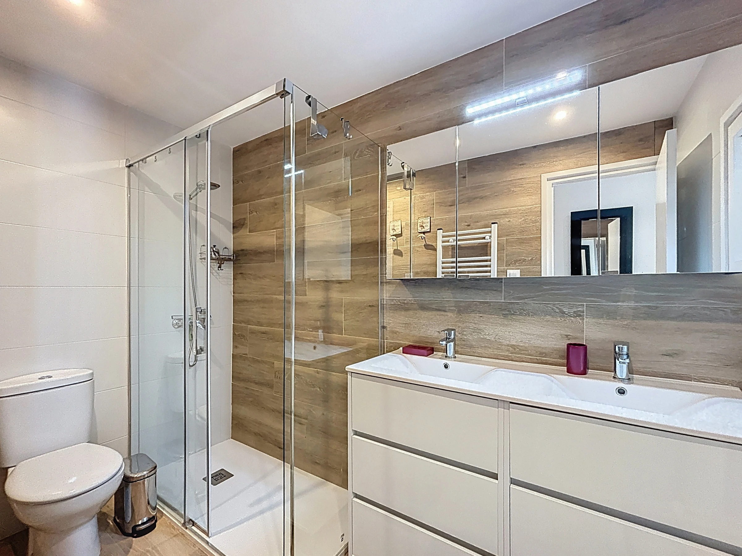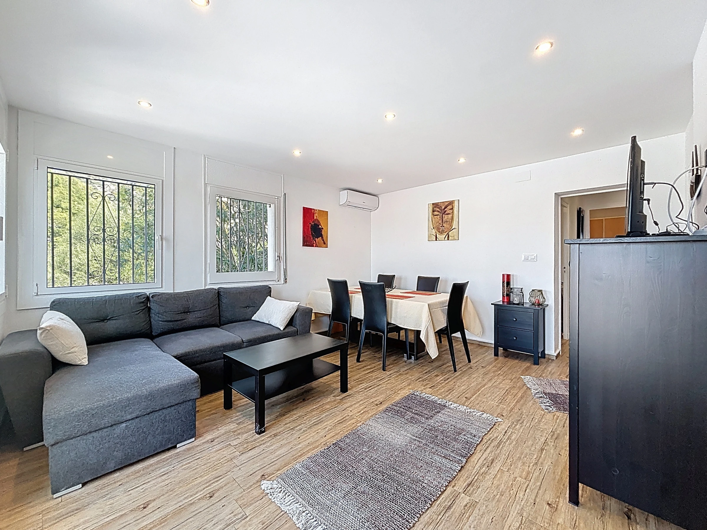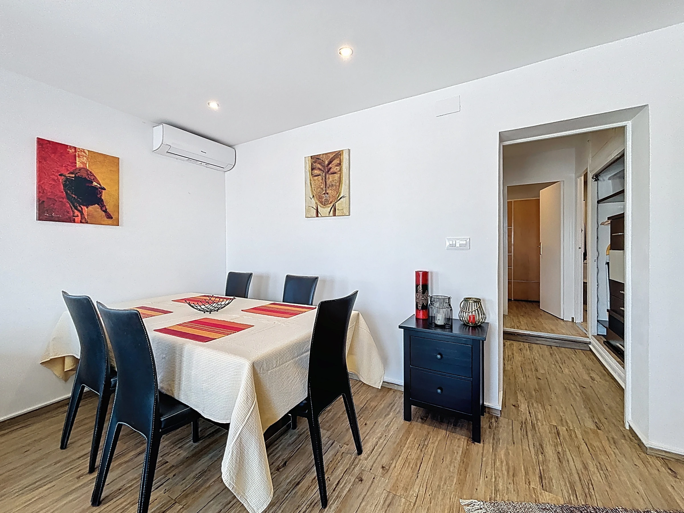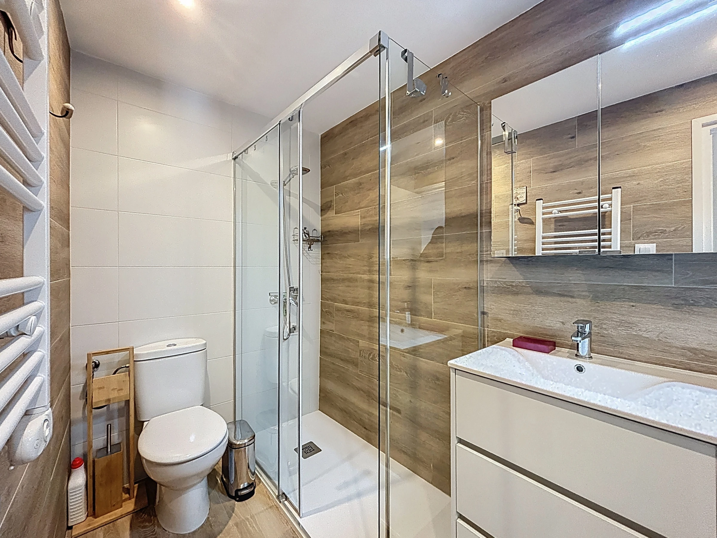 The apartment has two pleasant bedrooms, with a total of three sleeping spaces: two double beds and a sofa bed, offering great flexibility for all travellers. The fully equipped open-plan kitchen will allow you to easily prepare your meals thanks to its many appliances: refrigerator, freezer, dishwasher, oven, microwave, coffee machine, kettle and toaster.
