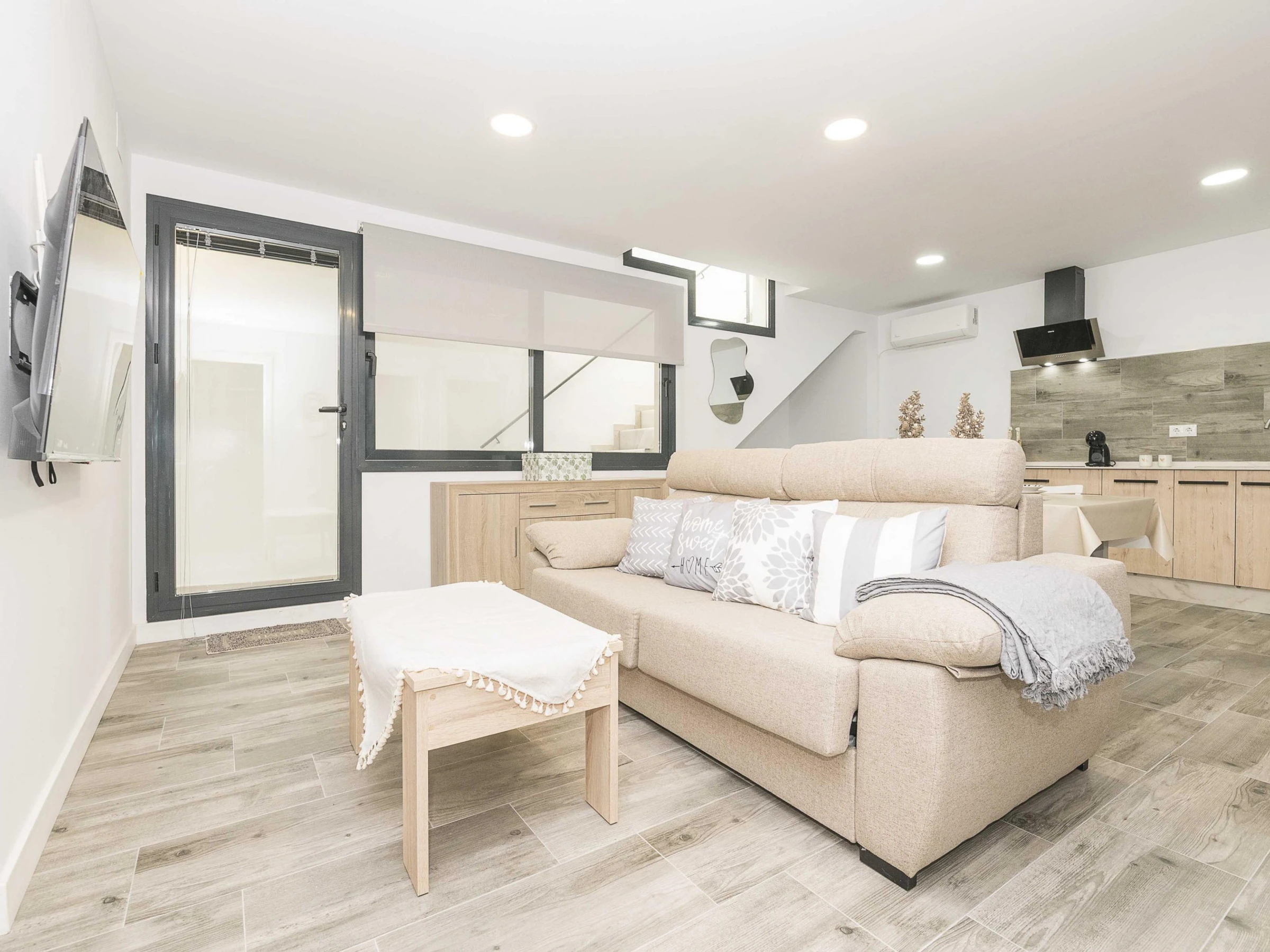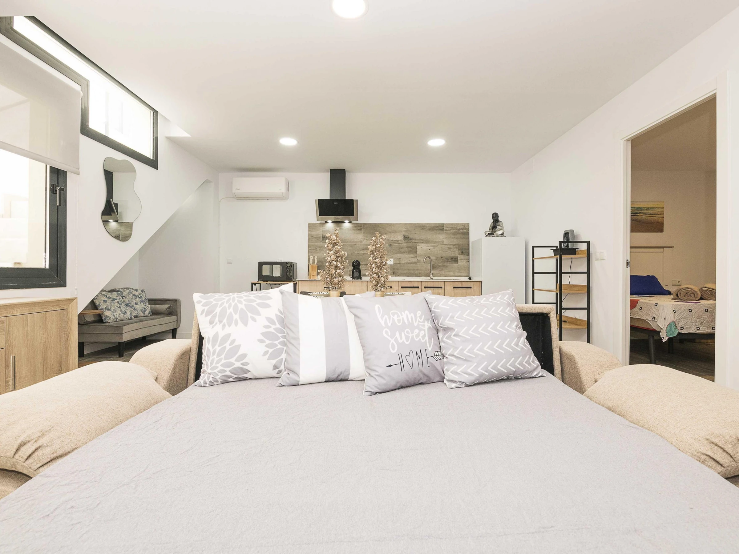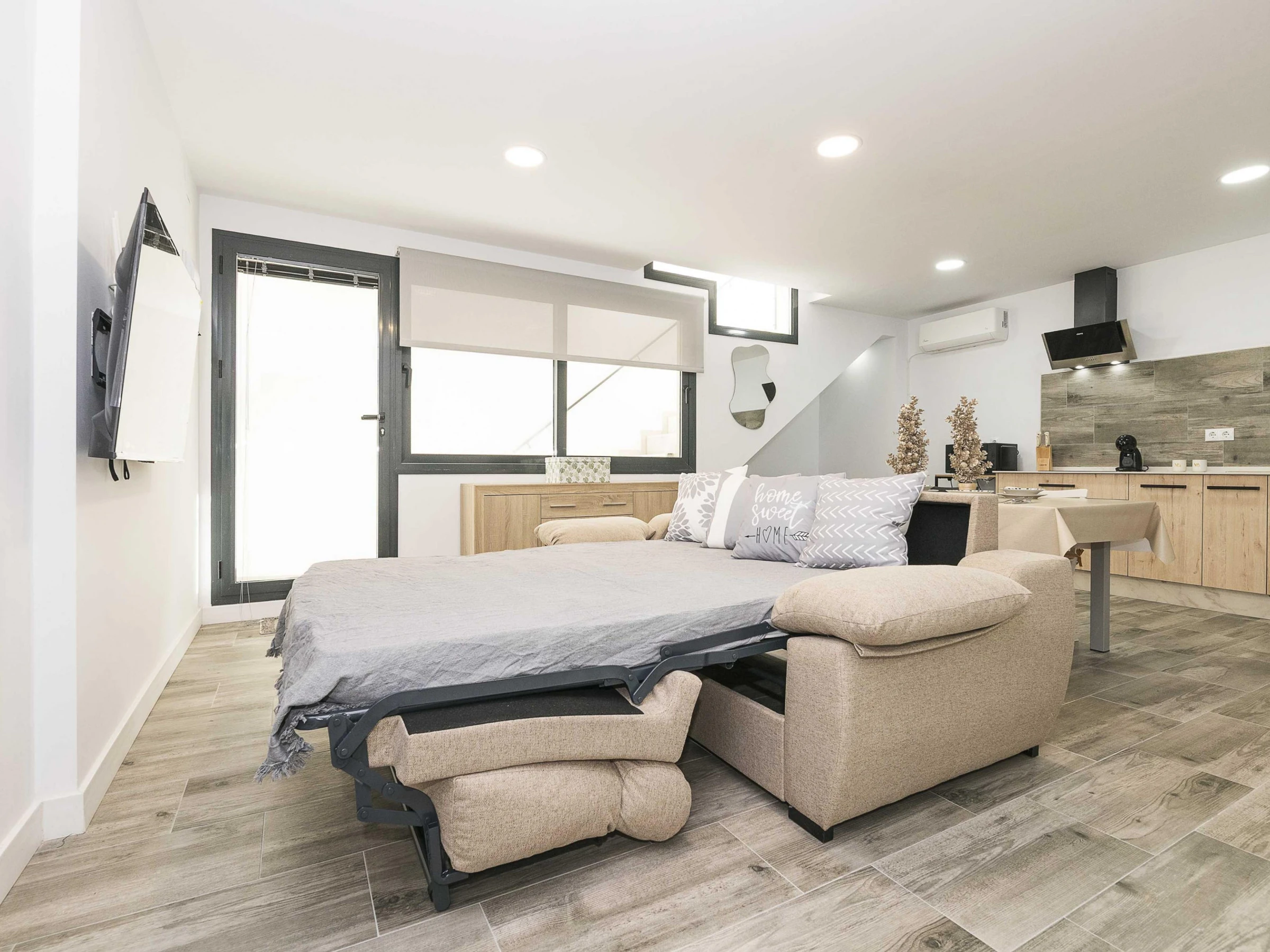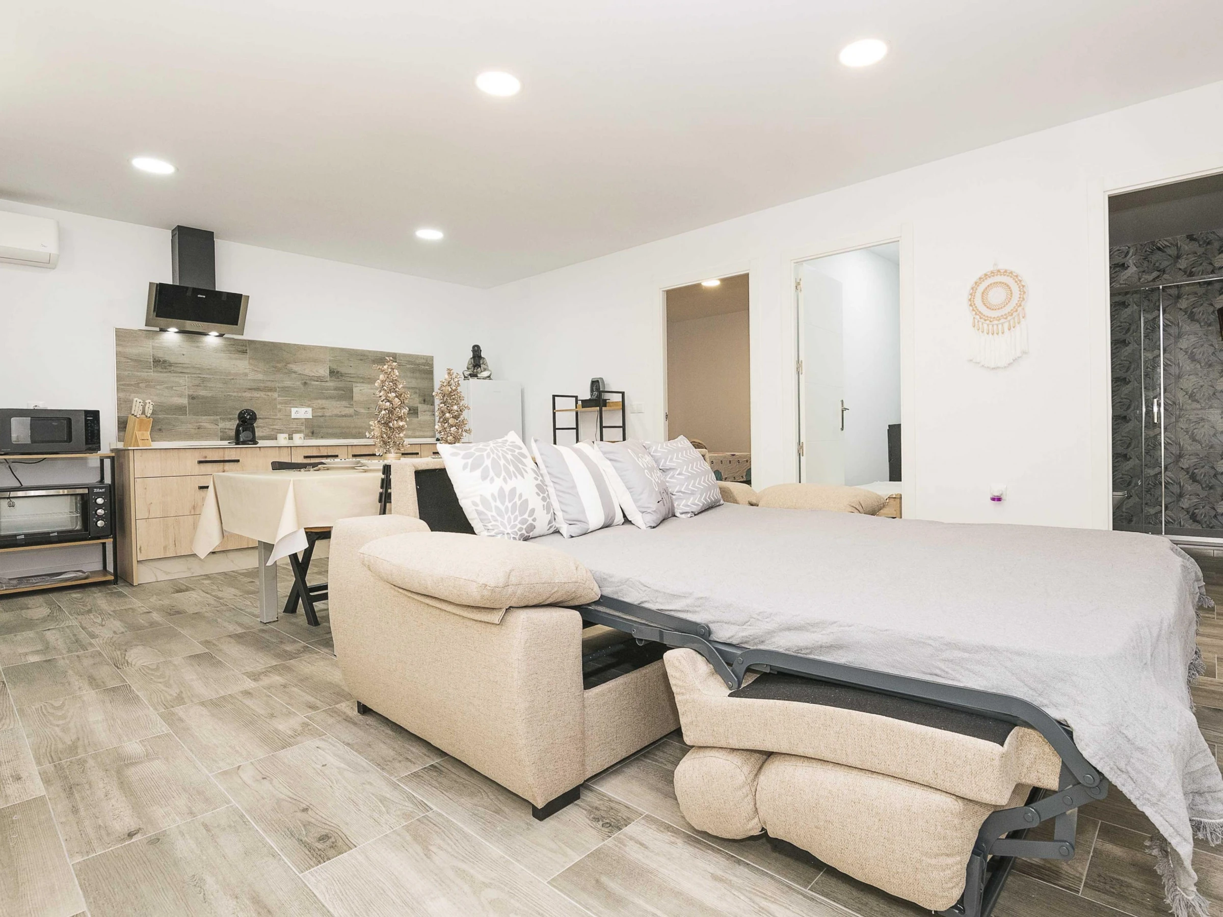 Inside, the flat offers an open-plan space that integrates kitchen, living room and dining room, designed to guarantee a functional stay. The kitchen is equipped with a ceramic hob and all the necessary utensils that will allow you to prepare your favourite dishes. The dining area has a main table to enjoy your meals and the living room has a double sofa bed and air conditioning, ideal for relaxing after a day at the beach. There is also a washing machine, tumble dryer, iron and ironing board. The bedroom has a comfortable double bed and has no windows. There is a bathroom with shower to complete the stay. Please note that there is no cot or highchair available.