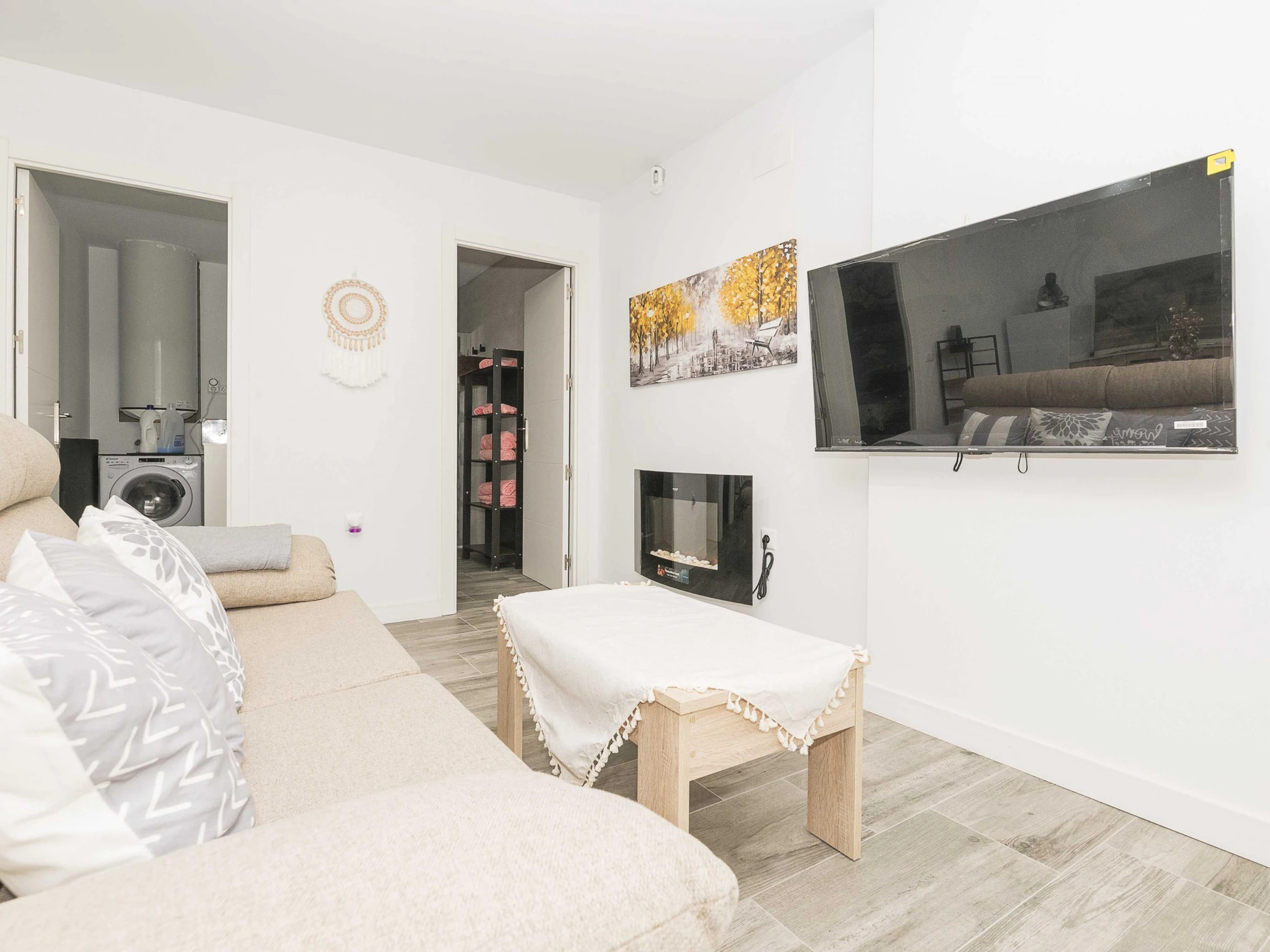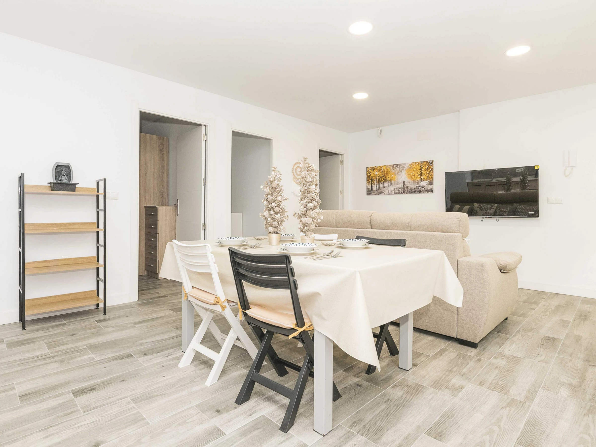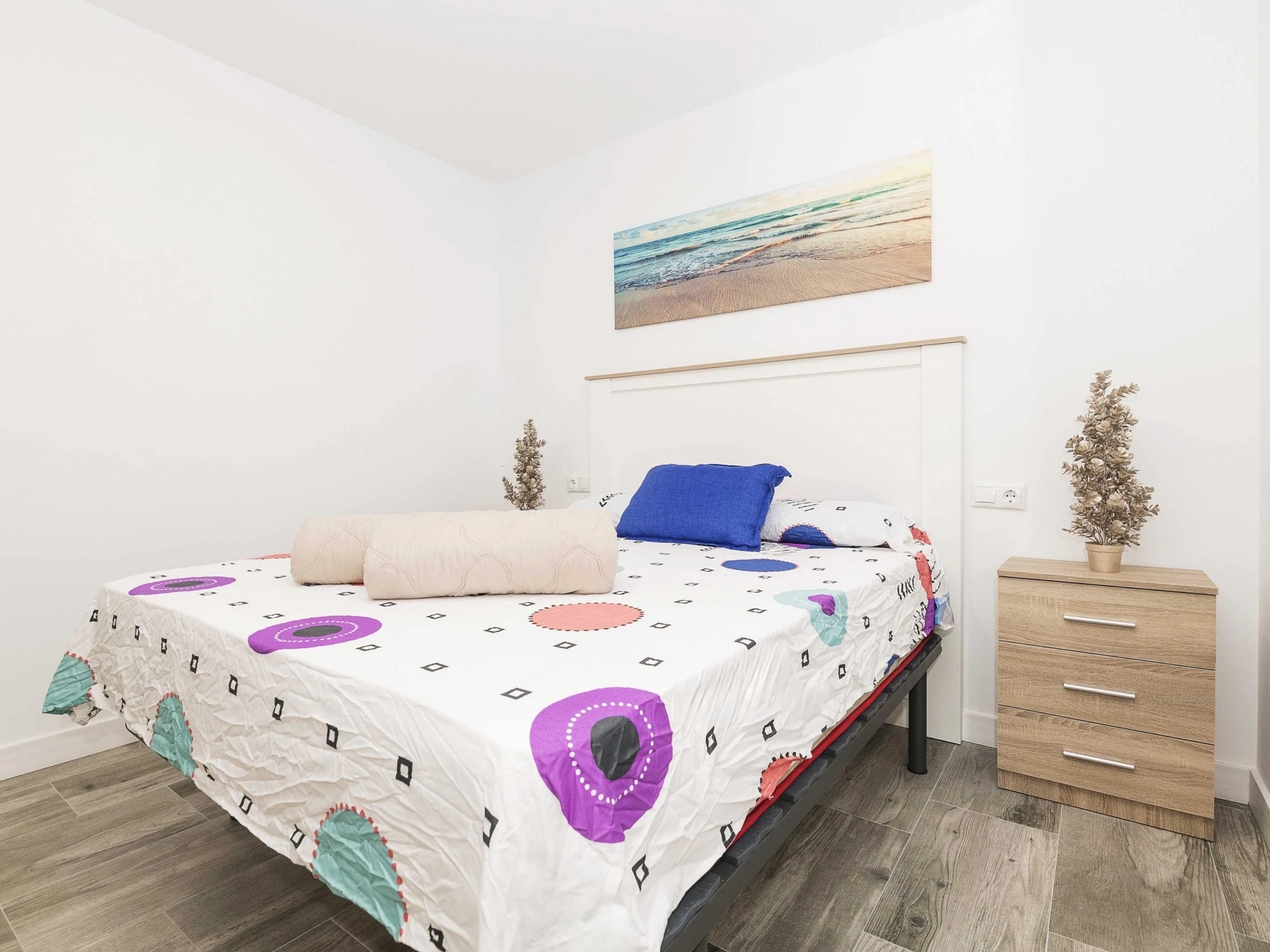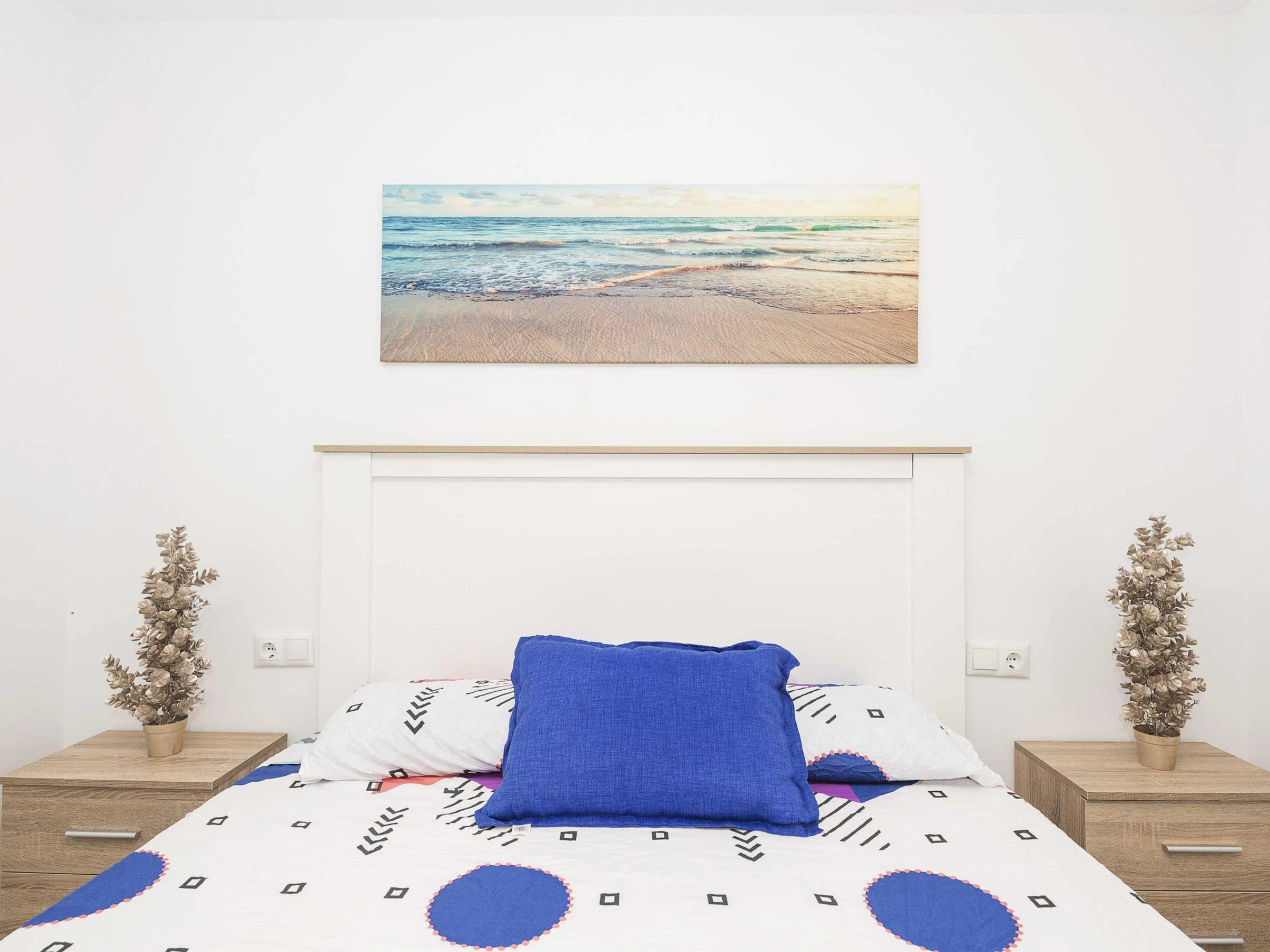 Inside, the flat offers an open-plan space that integrates kitchen, living room and dining room, designed to guarantee a functional stay. The kitchen is equipped with a ceramic hob and all the necessary utensils that will allow you to prepare your favourite dishes. The dining area has a main table to enjoy your meals and the living room has a double sofa bed and air conditioning, ideal for relaxing after a day at the beach. There is also a washing machine, tumble dryer, iron and ironing board. The bedroom has a comfortable double bed and has no windows. There is a bathroom with shower to complete the stay. Please note that there is no cot or highchair available.