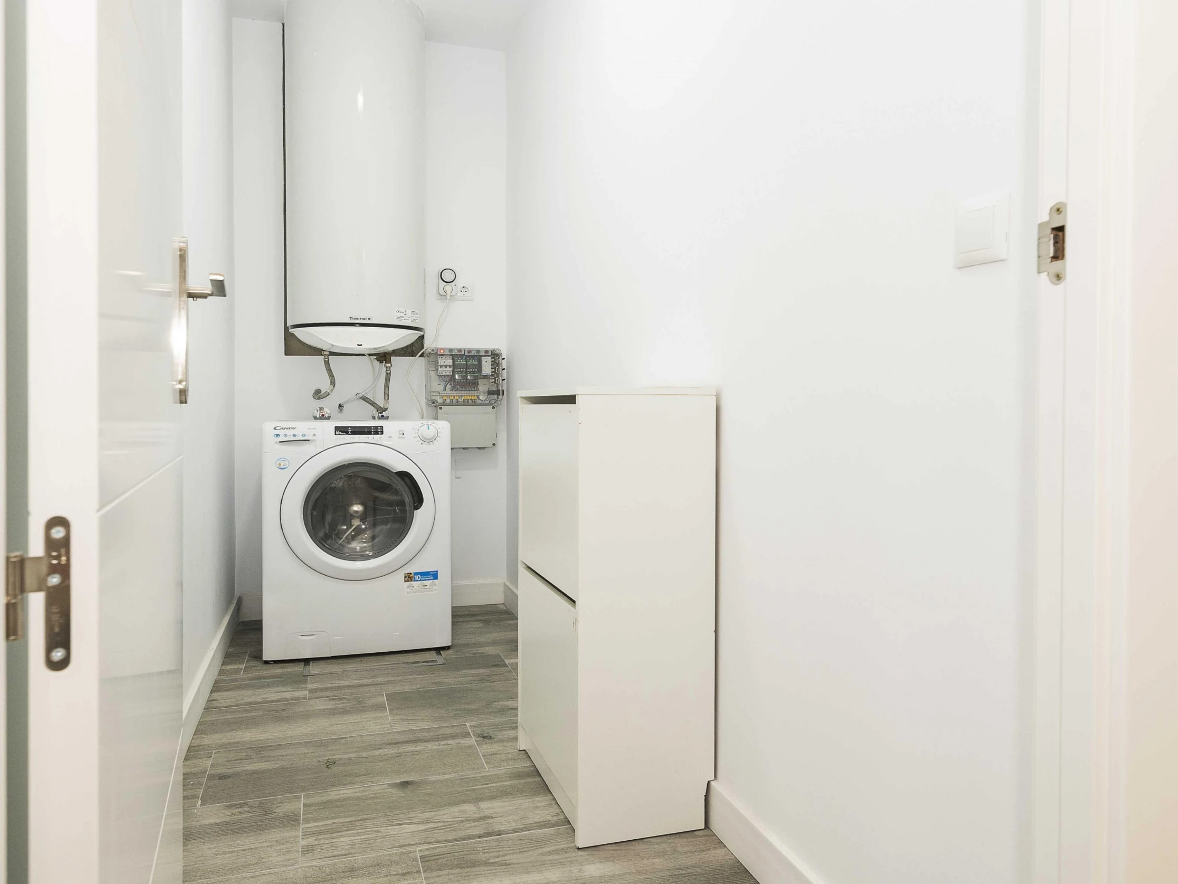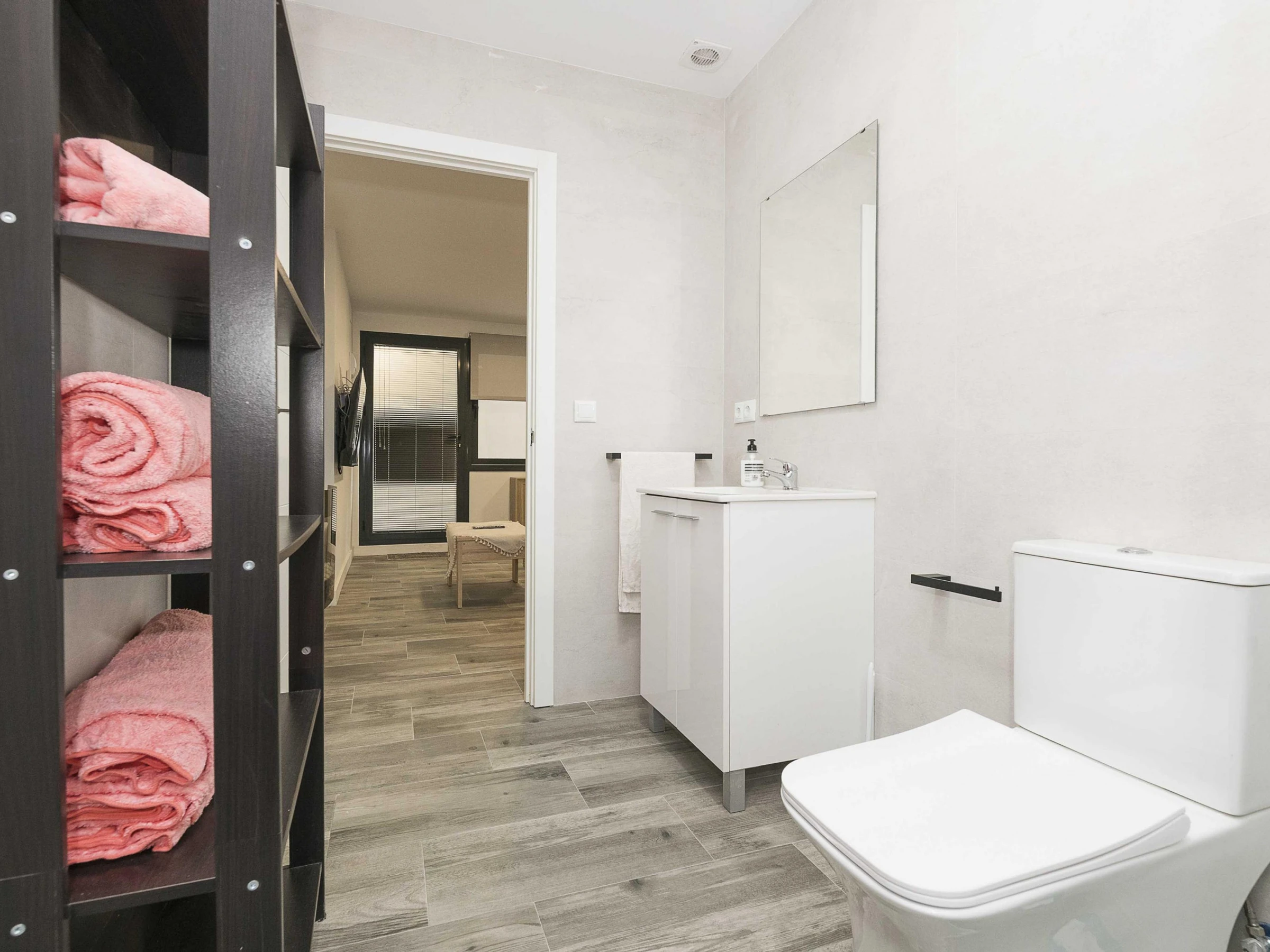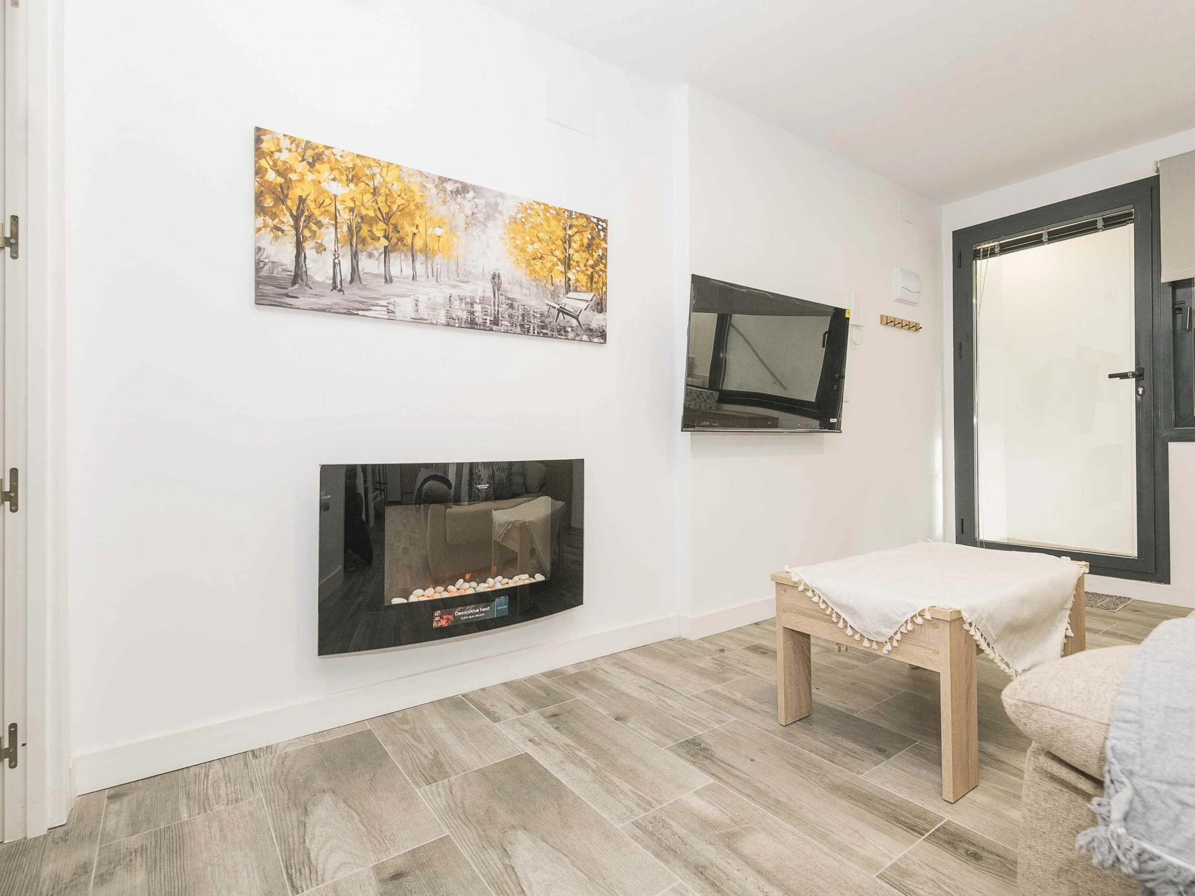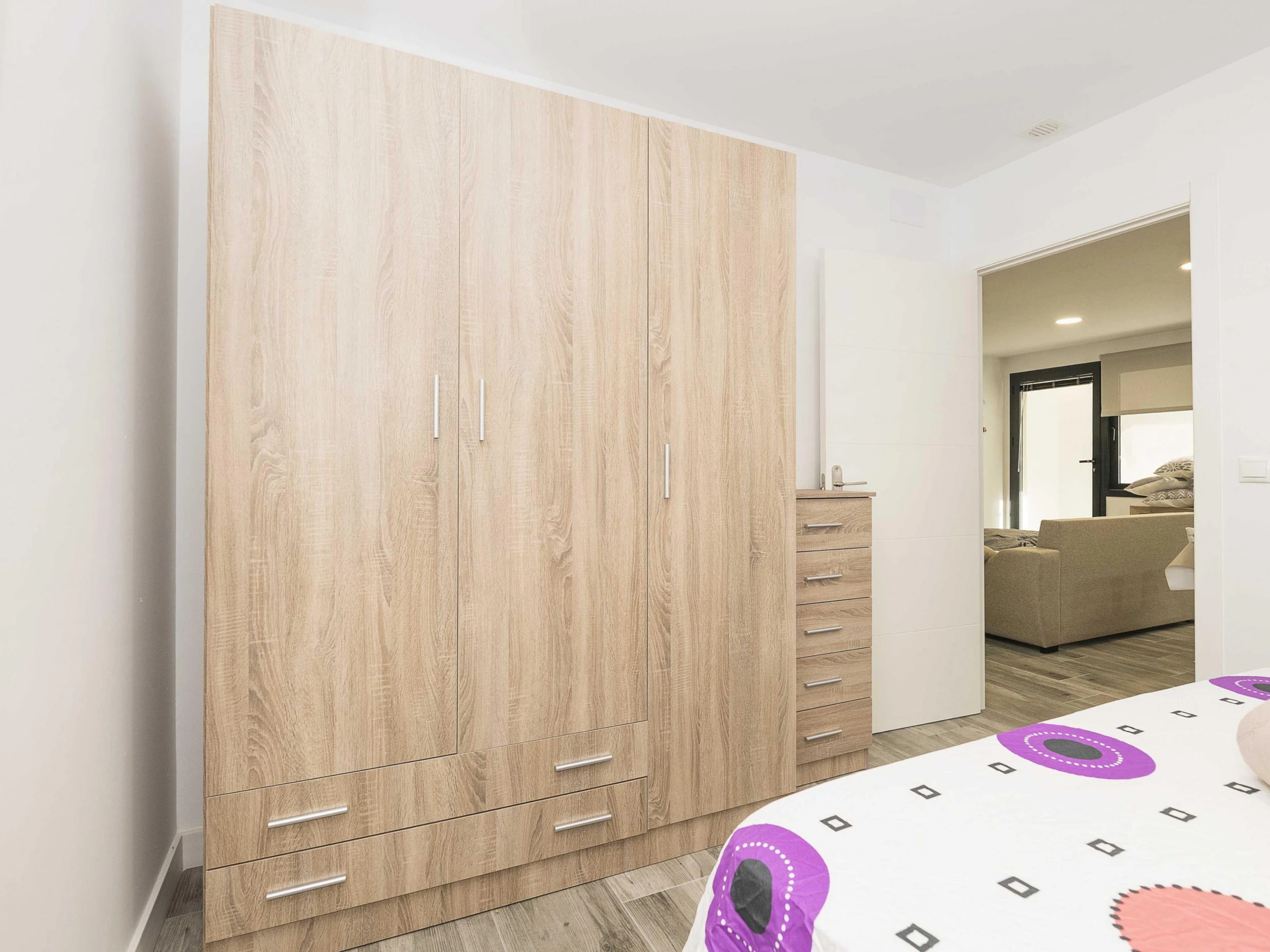 Inside, the flat offers an open-plan space that integrates kitchen, living room and dining room, designed to guarantee a functional stay. The kitchen is equipped with a ceramic hob and all the necessary utensils that will allow you to prepare your favourite dishes. The dining area has a main table to enjoy your meals and the living room has a double sofa bed and air conditioning, ideal for relaxing after a day at the beach. There is also a washing machine, tumble dryer, iron and ironing board. The bedroom has a comfortable double bed and has no windows. There is a bathroom with shower to complete the stay. Please note that there is no cot or highchair available.