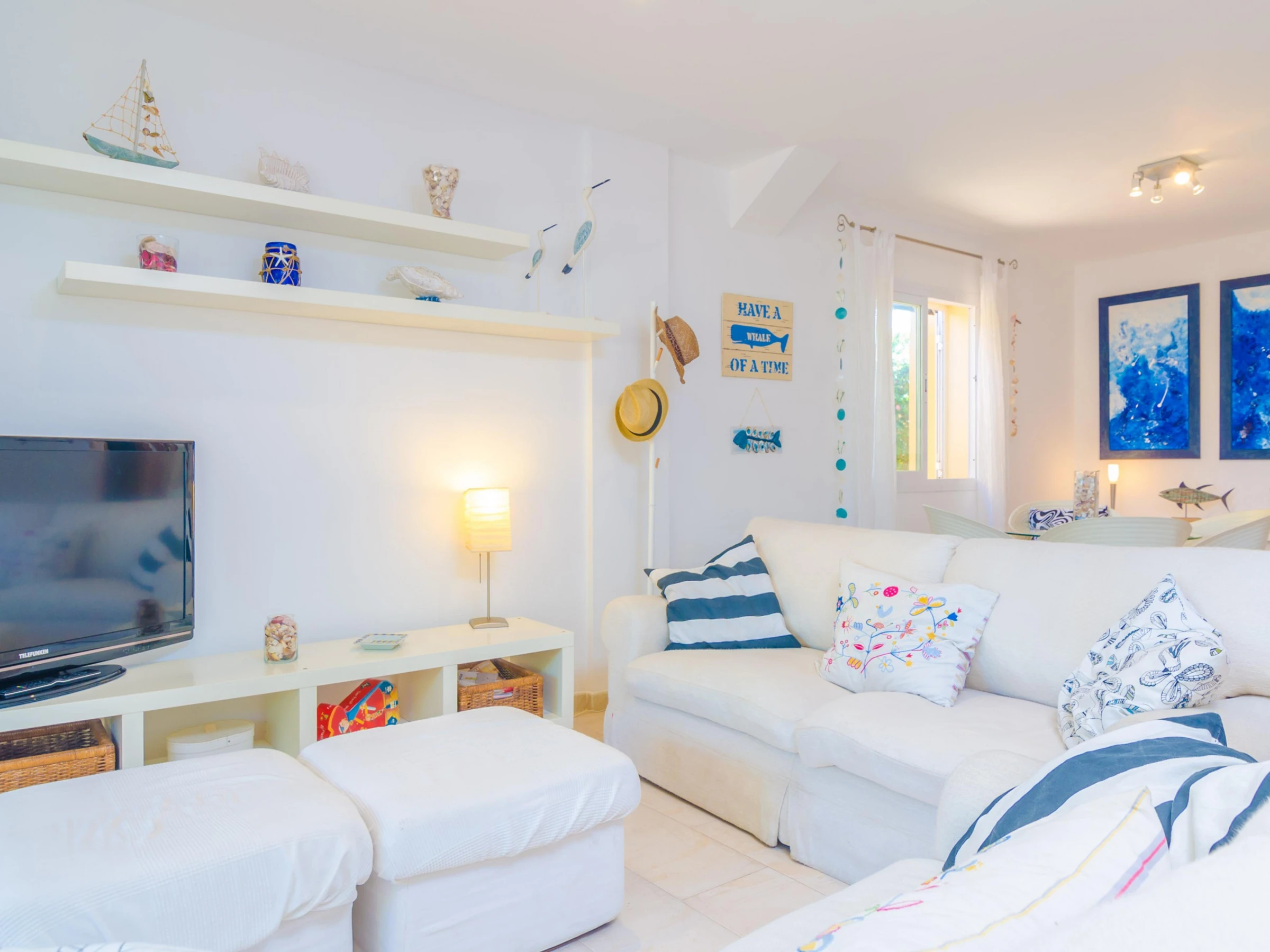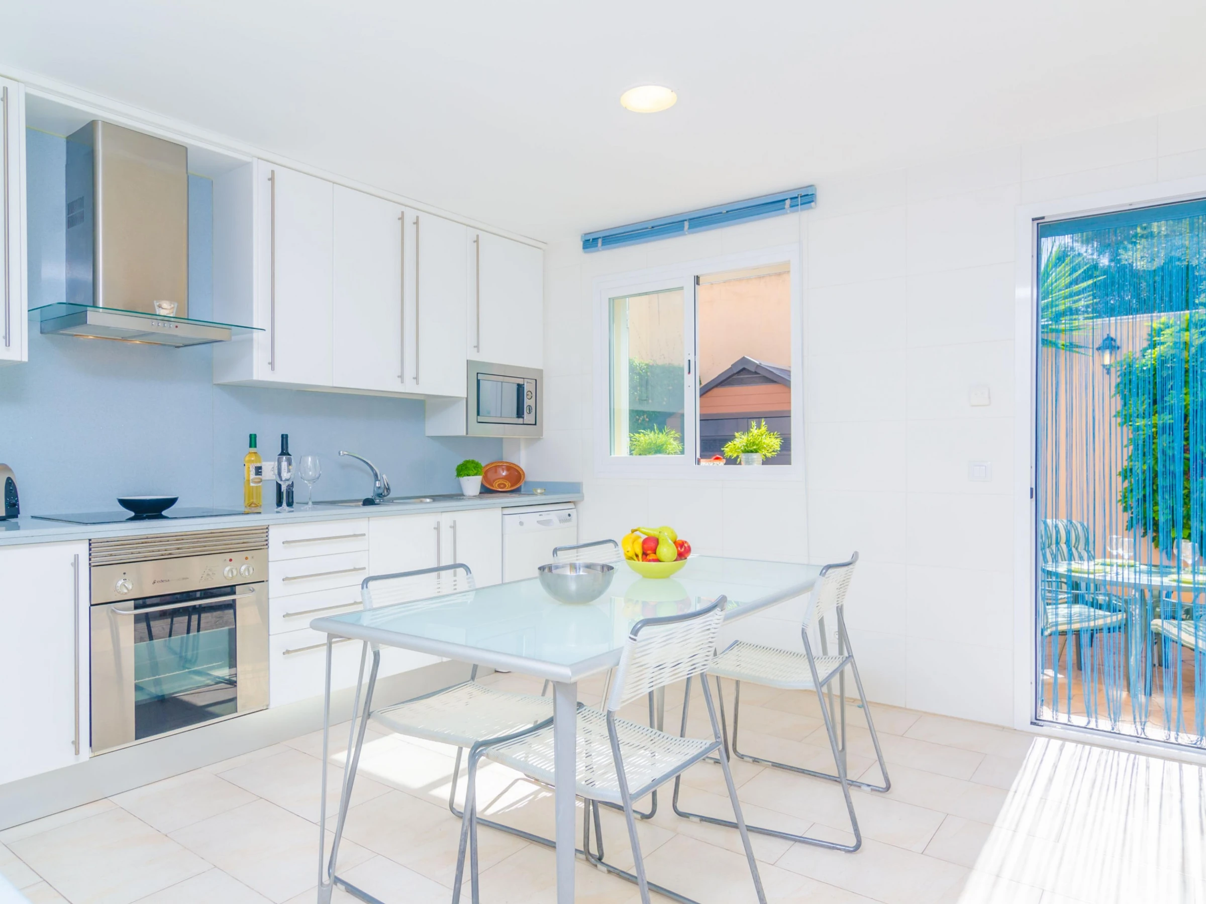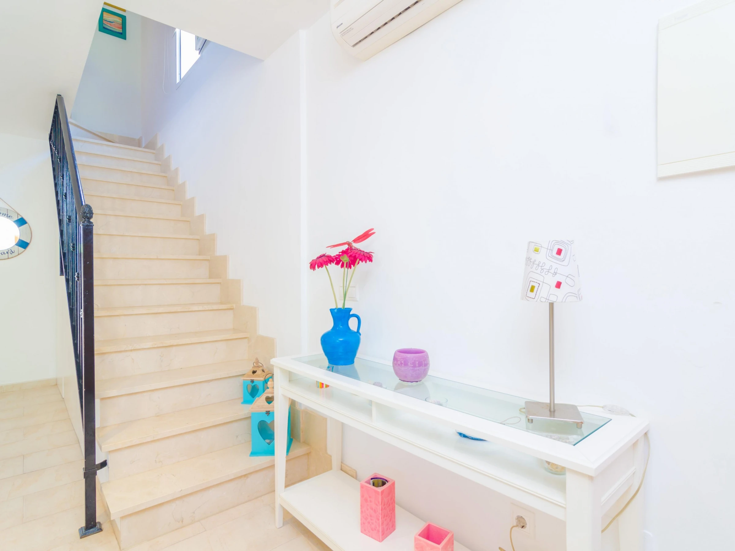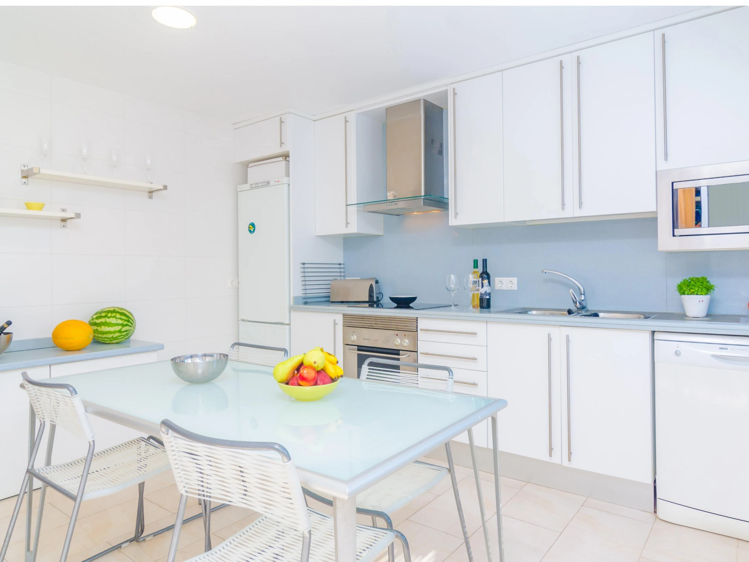 The two storey 120 m2 house has a comfortable, refreshing and Mediterranean style which will make you feel at home. On the ground floor you will find the living and dining room where you can watch TV or simply have a rest on the sofa while refreshing with the air-conditioning. Then the beautiful and Mediterranean dining area with capacity for 4 people. The kitchen is independent and fully equipped, with a ceramic hob and dishwasher, and also a table for 4 people. From the kitchen we have access to the back terrace of the house. It also has a laundry area with a washing machine, a tumble dryer, an iron and an ironing board. A shower bathroom completes this floor. Upstairs you will find the three bedrooms. Two of them feature a double bed and the last one has twin beds. All are air-conditioned and with a closet. From one of the double bed bedrooms we have access to the first floor terrace. Another shower bathroom completes this floor. We can prepare a cot and a high chair if you are coming with a baby.