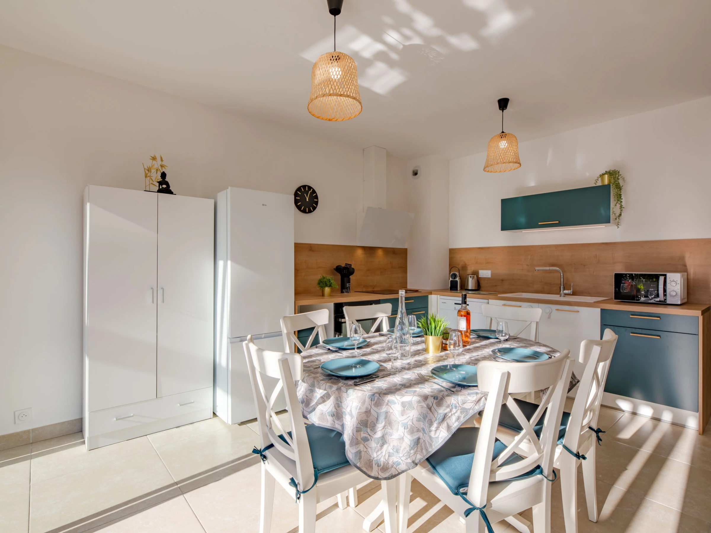 4-room house 89 m2 on 2 levels. Spacious, modern and tasteful furnishings: living/dining room 37 m2 with TV (flat screen), electric shutters. Exit to the terrace, to the patio. Open kitchen (oven, dishwasher, 4 induction hot plates, toaster, kettle, microwave, freezer, electric coffee machine, Capsules for coffee machine (NESPRESSO) extra). Shower/WC. Upper floor: 2 rooms 13 m2 with Dressing room, each room with 1 french bed (1 x 140 cm, length 200 cm). 1 room 13 m2 with Dressing room with 2 beds (90 cm, length 200 cm). Bathroom, sep. WC. Electric heating. Large terrace, patio. Terrace furniture, deck chairs (2). Facilities: washing machine, hair dryer. Internet (WiFi). Parking. Please note: maximum 1 pet/ dog allowed. Smoke alarm. Offer by a private individual according to Art. 155, IV of CGI. [hidden]