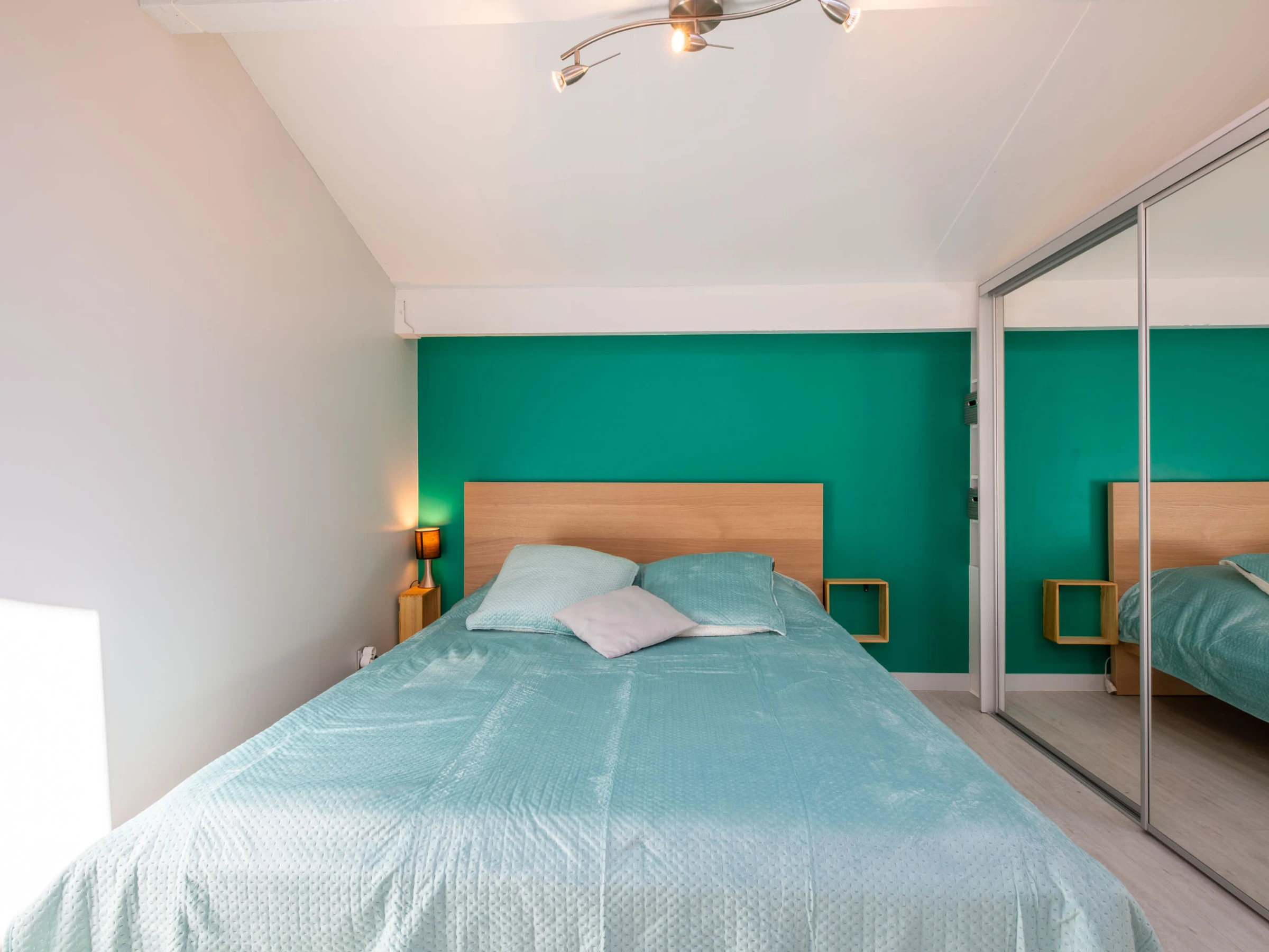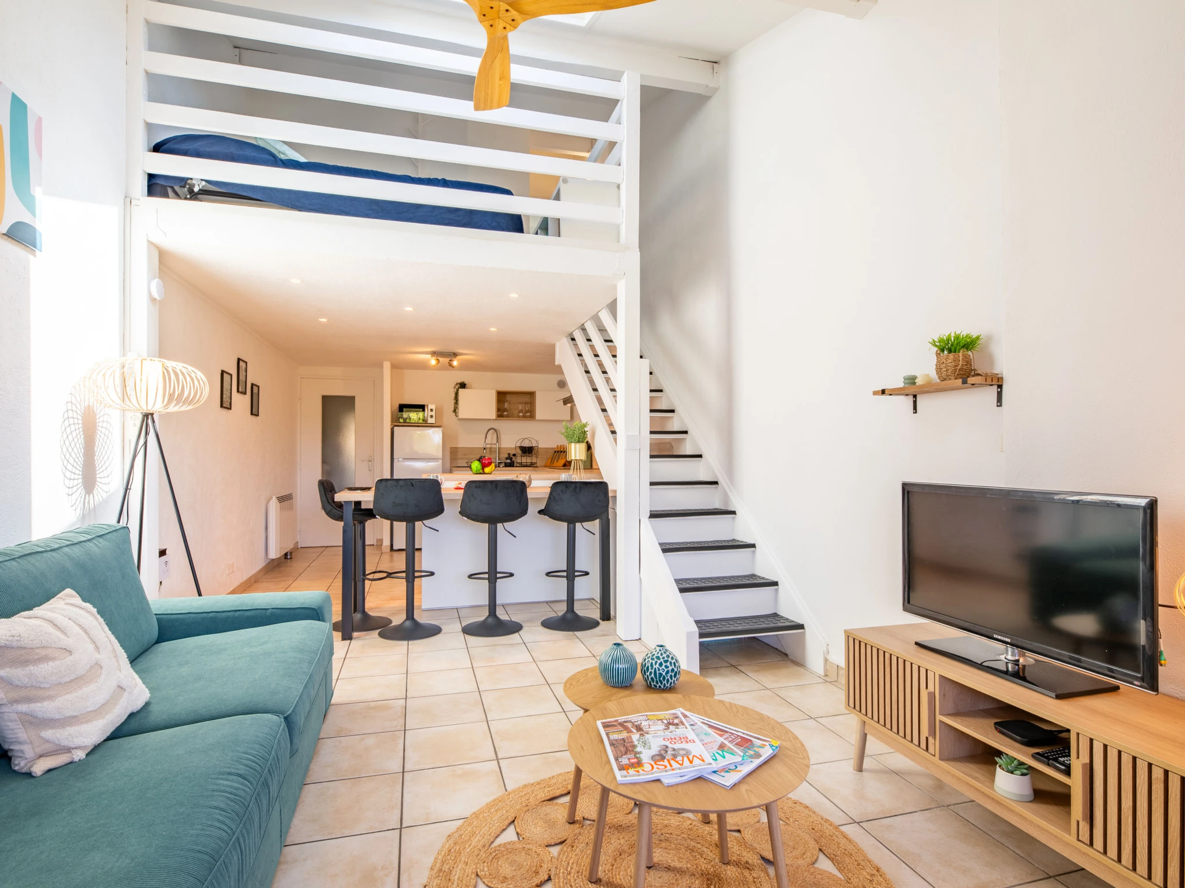 2-room apartment 54 m2 on 3rd floor. Fully renovated in 2025, modern furnishings: lounge with TV and international TV channels (flat screen), fan. Exit to the balcony. Large, open kitchen (oven, dishwasher, 3 induction hot plates, toaster, kettle, microwave, freezer, electric coffee machine, Capsules for coffee machine (Dolce gusto) extra) with dining nook. Sep. WC. Upper floor: gallery with 1 double sofabed (1 x 140 cm, length 190 cm), fan. 1 room with Dressing room with 1 french bed (1 x 160 cm, length 200 cm). Shower/WC. Electric heating. Balcony 8 m2, west facing position. Balcony furniture. Partial view of the sea. Facilities: iron, hair dryer. Internet (WiFi, free). Please note: maximum 1 pet/ dog allowed. TV only FR. Smoke alarm. Offer by a private individual according to Art. 155, IV of CGI. [hidden]