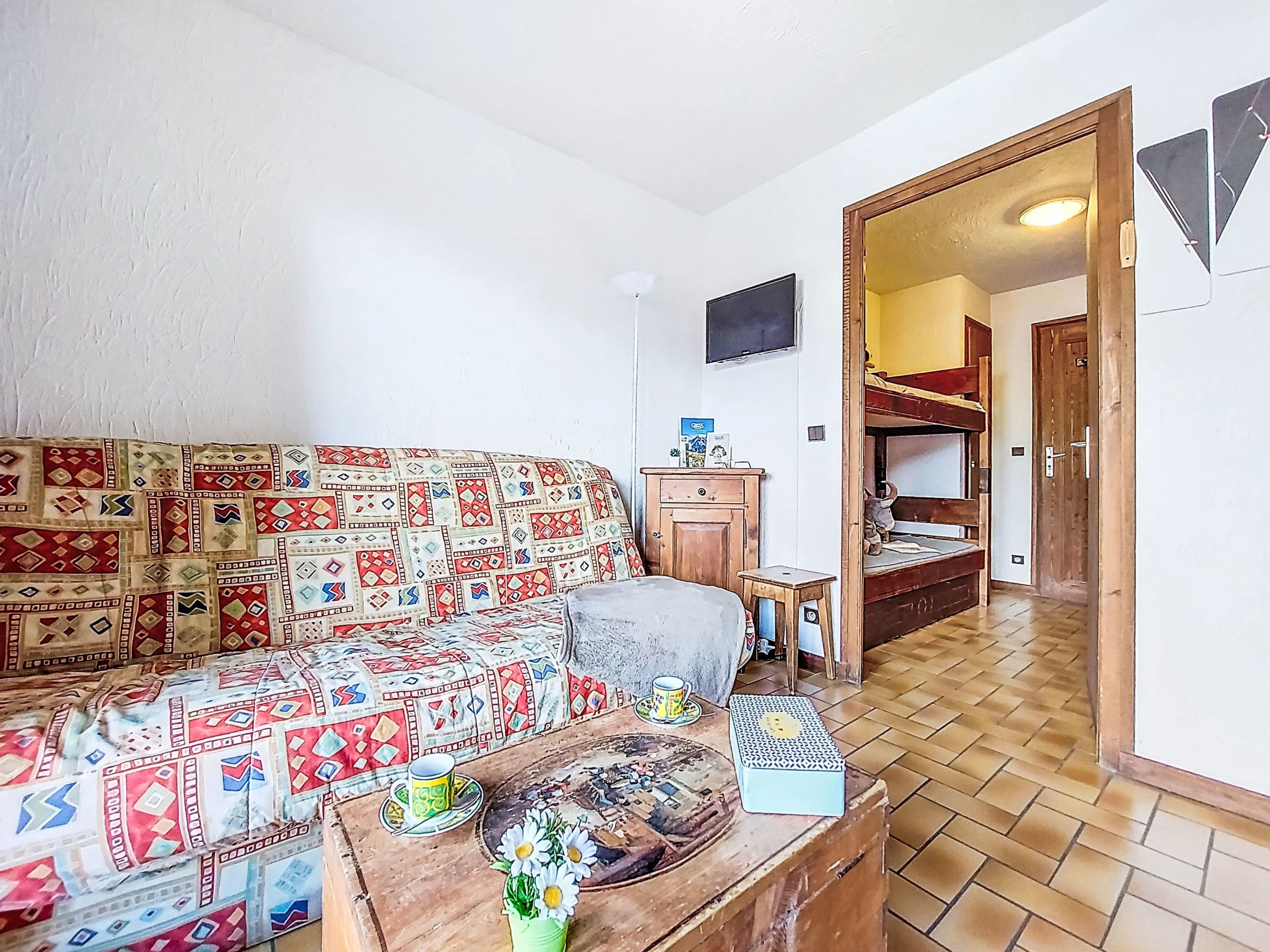 "Les Grets", 1-room studio 27 m2. Entrance hall with 1 x 2 bunk beds (80 cm, length 190 cm). Living/dining room with 1 sofabed (140 cm, length 190 cm), TV (flat screen). Exit to the balcony. Kitchenette (2 hot plates, toaster, kettle, microwave, electric coffee machine, raclette grill, fondue Set (cheese)). Bath/WC. Electric heating. Small balcony 3 m2, east facing position. Balcony furniture. Very beautiful view of the mountains and the swimming pool. Facilities: Internet (WiFi, extra). Please note: maximum 1 small pet/ dog allowed. TV only FR. Smoke alarm, no lift. Offer by a private individual according to Art. 155, IV of CGI.
