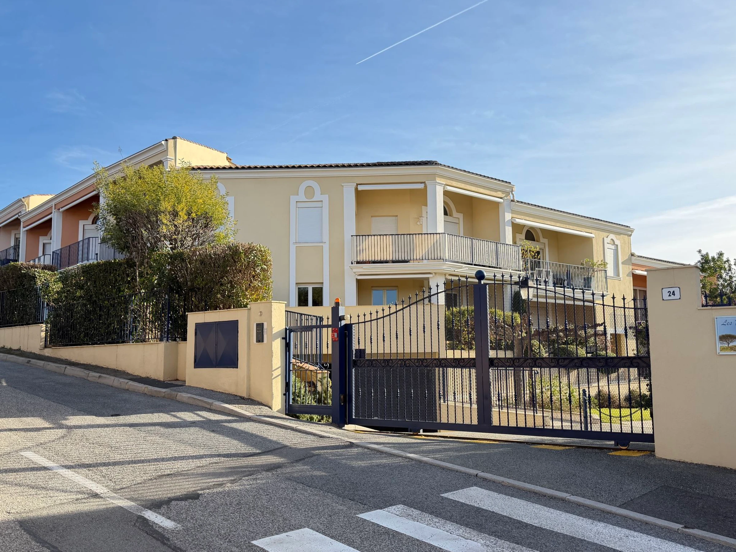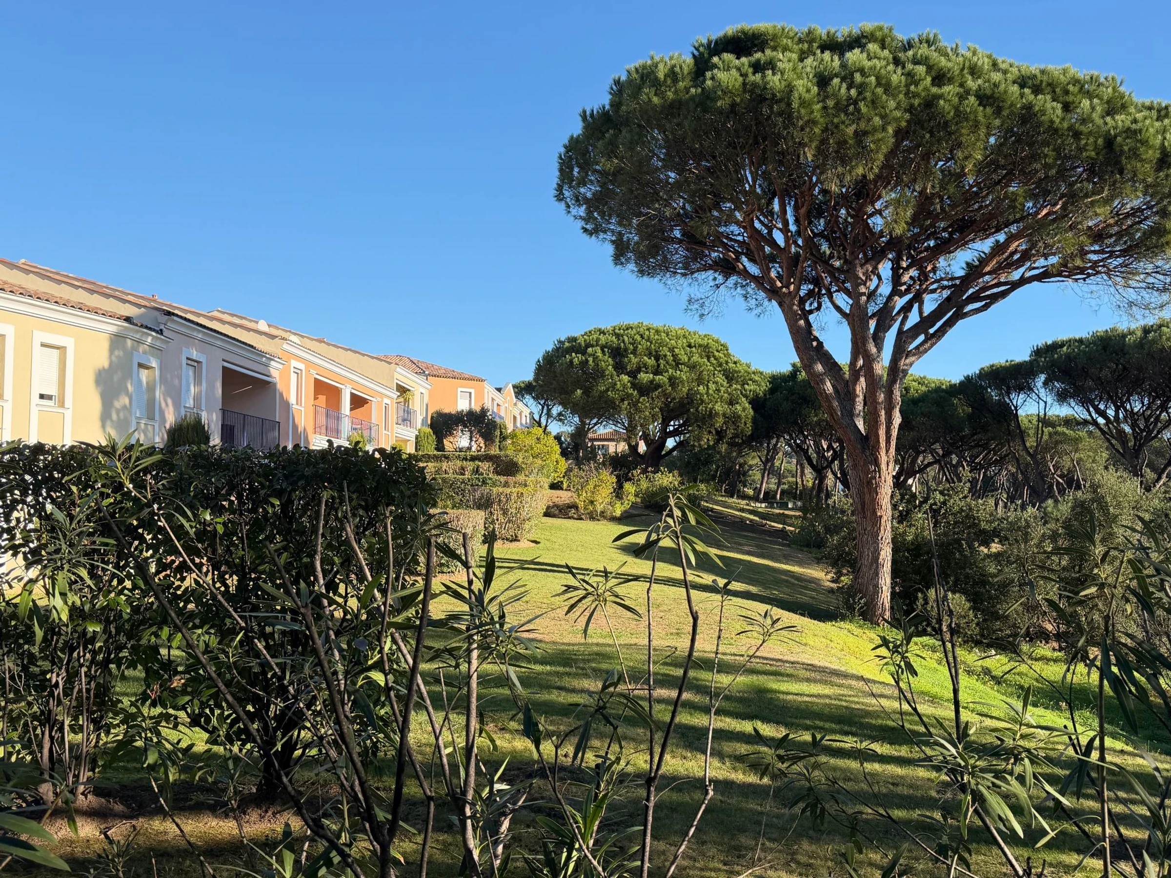 Beautiful residence "les Pins Bleus", 2 storeys, surrounded by trees. In the district of Saquèdes, on the outskirts, 1 km from the centre of Sainte-Maxime, in a quiet position on top of a hill, in the residential district, 1.5 km from the sea, 1.5 km from the beach, in the countryside, south-west facing position. For shared use: property 3 ha (fenced), well-kept garden, swimming pool angular fenced (14 x 7 m, depth 110 - 200 cm, seasonal availability: [hidden] - [hidden] with internal staircase. Grocery 400 m, supermarket 1.8 km, bakery 400 m, 15 minute walk to the centre, bus stop 450 m, sandy beach "centre ville" 1.5 km, thermal baths "Thalasso Spa Les Issambres" 7 km. Sports harbour 1.5 km, golf course (18 hole) 4 km, tennis 3 km. Nearby attractions: Aqualand Waterpark 2 km, Navette/Shuttle boat St Tropez 20min 1.5 km, St Tropez / Ramatuelle 17 km, Port-Grimaud 10 km, Gorges du Verdon 80 km. Hiking paths: Massif des Maures 5 km, Massif de l'Esterel 25 km, Pas d'animaux admis. No Pet. Please note: car recommended. Residence with electric gates. The keys‘ handover takes place by the agency in Sainte-Maxime, 2 km. The swimming pool is located 200m away on foot via a path with wide steps. It is also possible to reach the swimming pool by car.
