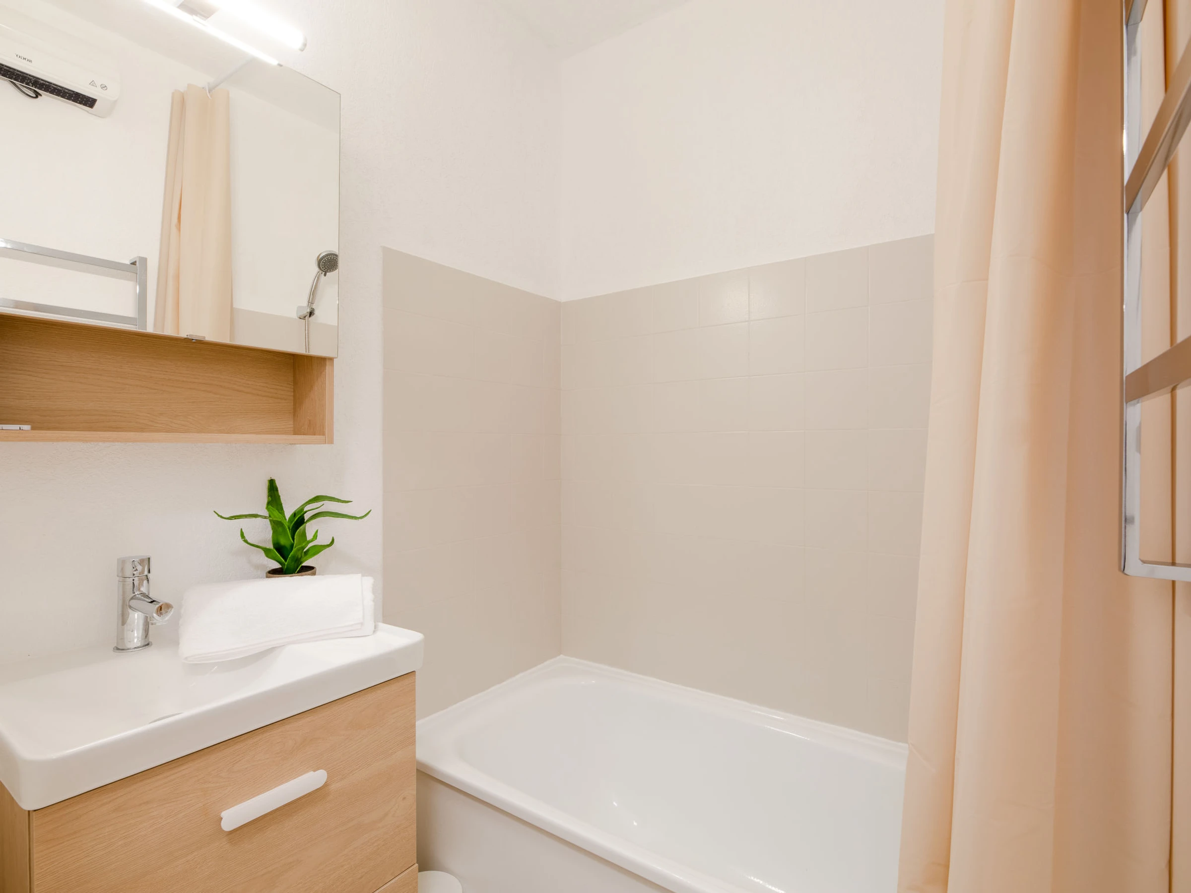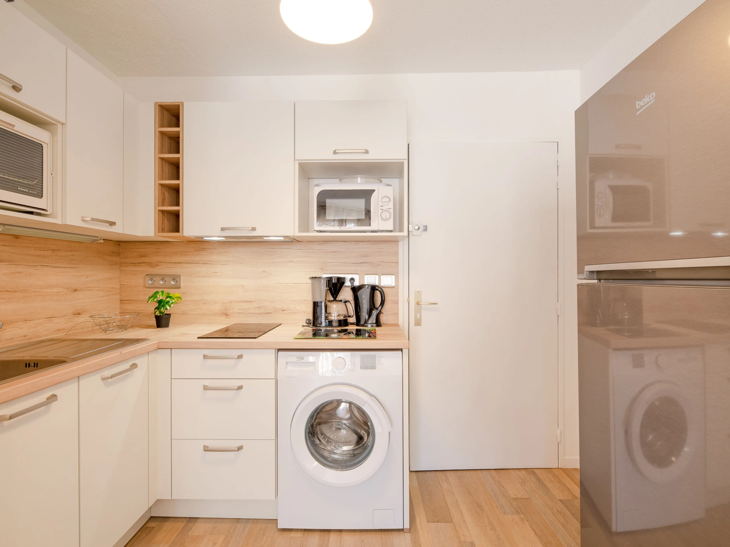 2-room apartment 29 m2 on 3rd floor. Comfortable furnishings: living/dining room with 1 double sofabed (140 cm, length 190 cm), TV. Exit to the terrace. 1 small room with sliding door with 1 french bed (140 cm, length 190 cm). Kitchenette (2 hot plates, oven, toaster, kettle, microwave, electric coffee machine). Bathroom, sep. WC. Electric heating, air-conditioning. Terrace, east facing position. Terrace furniture. Facilities: washing machine. Internet (WiFi, extra). Garage space n 77, height 192 cm, width 235 cm. Please note: non-smokers only, parking space for small car only. Smoke alarm. [hidden]