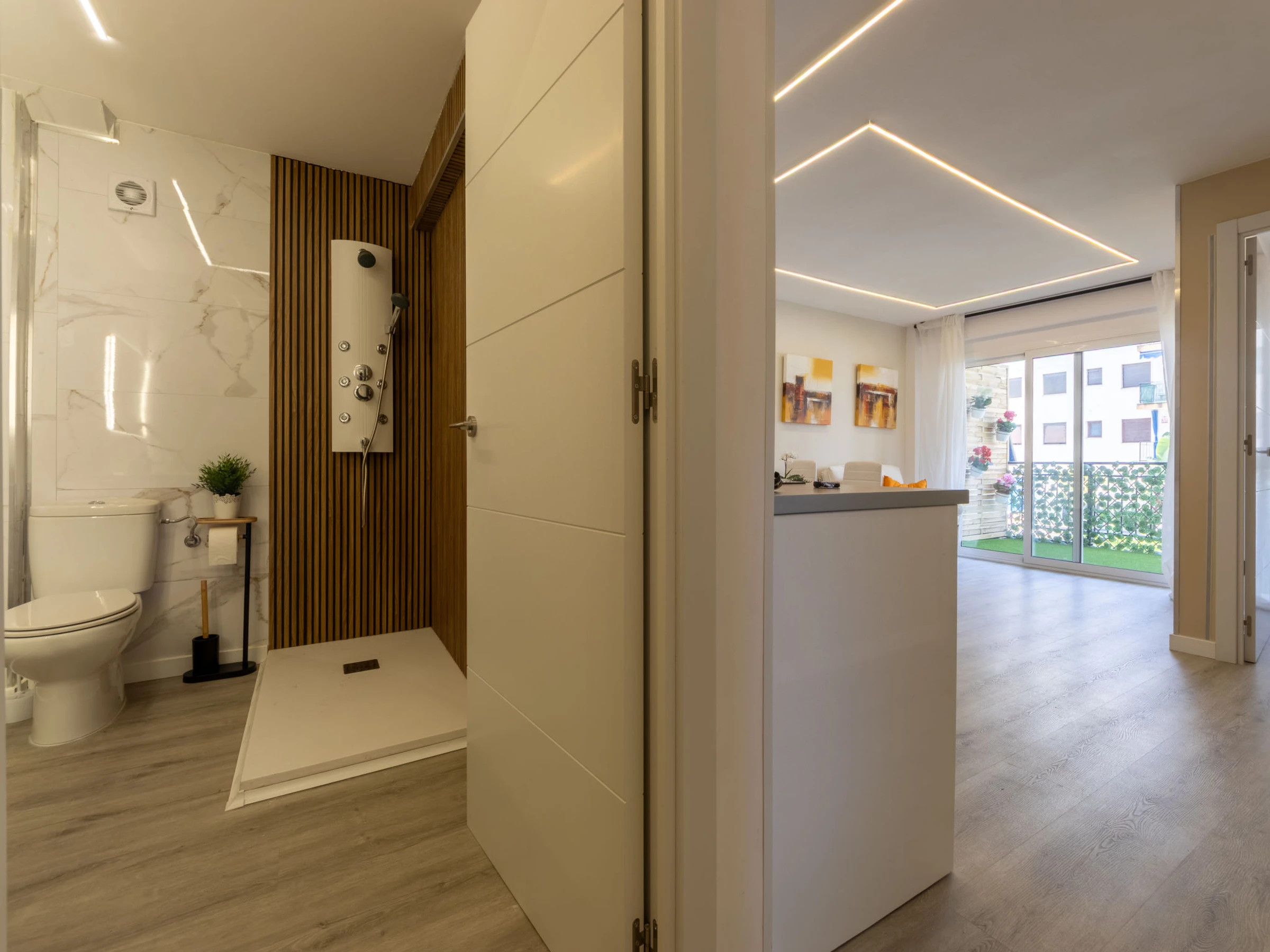 "Rosana", 4-room apartment 60 m2 on 1st floor. Bright, fully renovated in 2025, practical and cosy furnishings: living/dining room with digital TV and air conditioning. Exit to the terrace. 1 room with 1 french bed (160 cm, length 200 cm). 1 room with 1 bed (90 cm, length 200 cm). 1 room with 1 bed (90 cm, length 200 cm). Open kitchen (oven, dishwasher, 3 ceramic glass hob hotplates, kettle, microwave, electric coffee machine). Exit to the terrace. Shower/WC. Forced-air heating (100 litres). Large balcony. Terrace furniture. View of the resort. Facilities: washing machine, hair dryer. Internet (WiFi, free). Please note: non-smokers only. TV only ES. [hidden] // Reg. Nr.: ESFCTU000043024000080690000000000000000[hidden]059