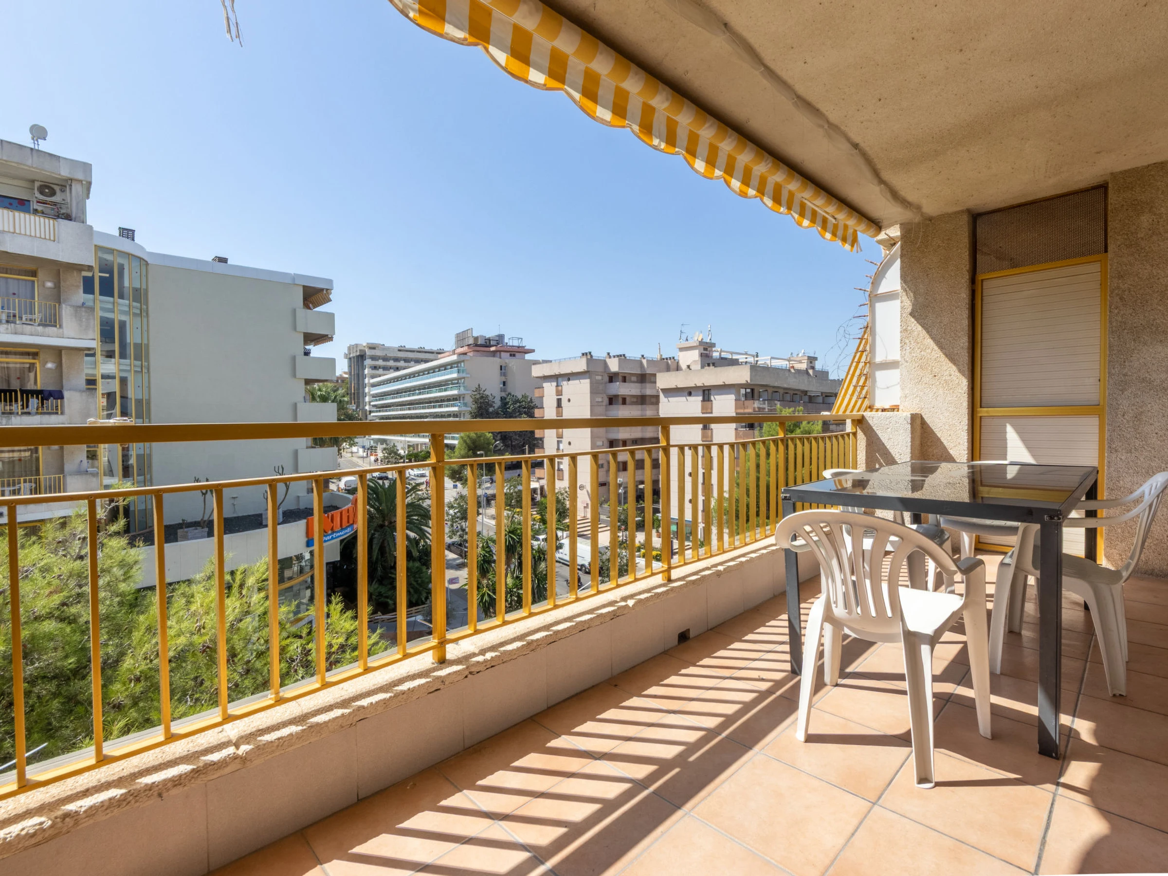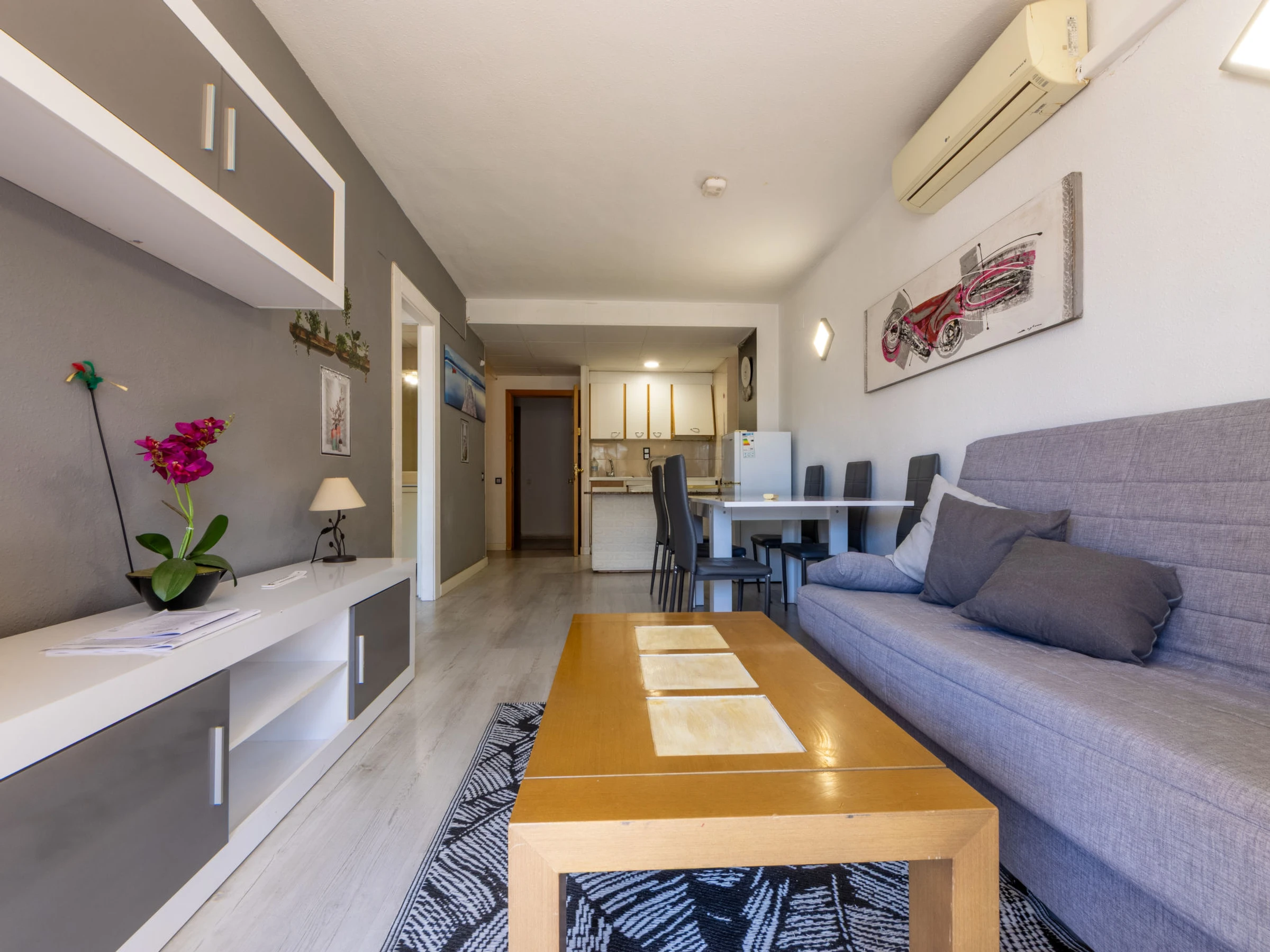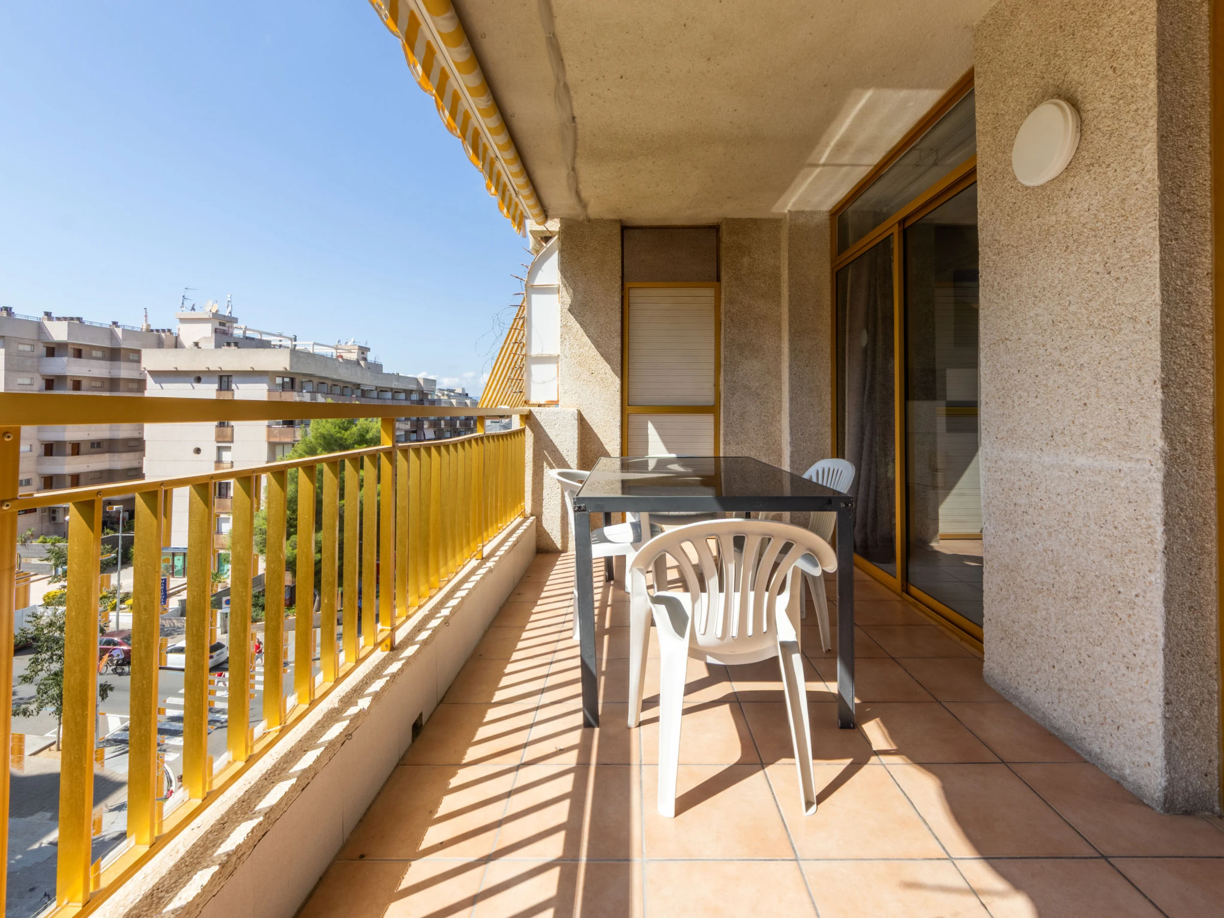 "Catalunya 92", 3-room apartment 47 m2. Object suitable for 2 adults + 2 children. Living/dining room with digital TV. 1 room with 1 french bed (150 cm, length 190 cm). Exit to the terrace. 1 room with 1 x 2 bunk beds (90 cm, length 190 cm). Open kitchen (oven, 2 ceramic glass hob hotplates, kettle, microwave, electric coffee machine). Bath/WC. Air-conditioning, forced-air heating, boiler (80 litres). Terrace furniture. View of the swimming pool. Facilities: washing machine, iron, hair dryer. Internet (WiFi, free). Please note: non-smokers only. [hidden]