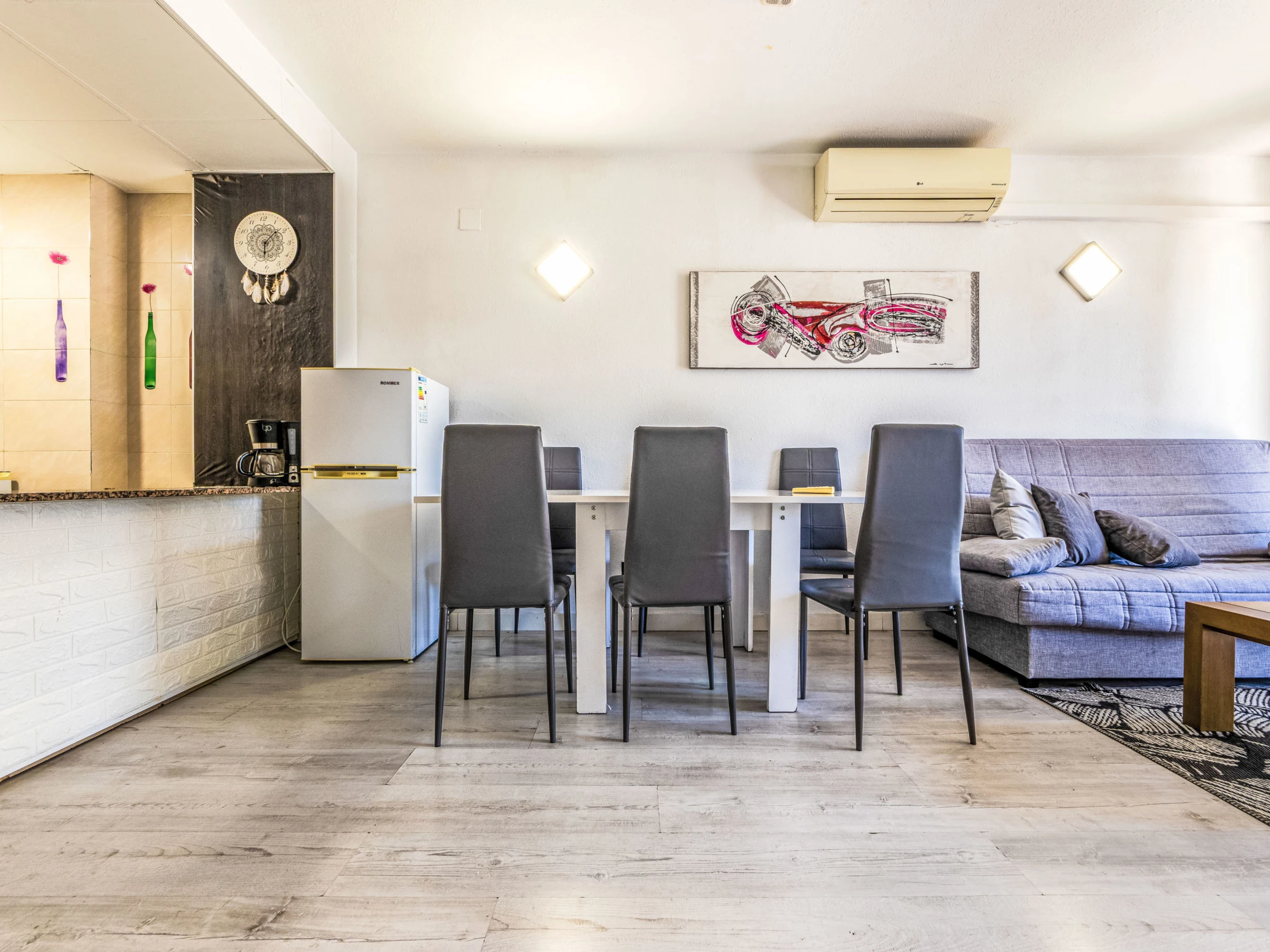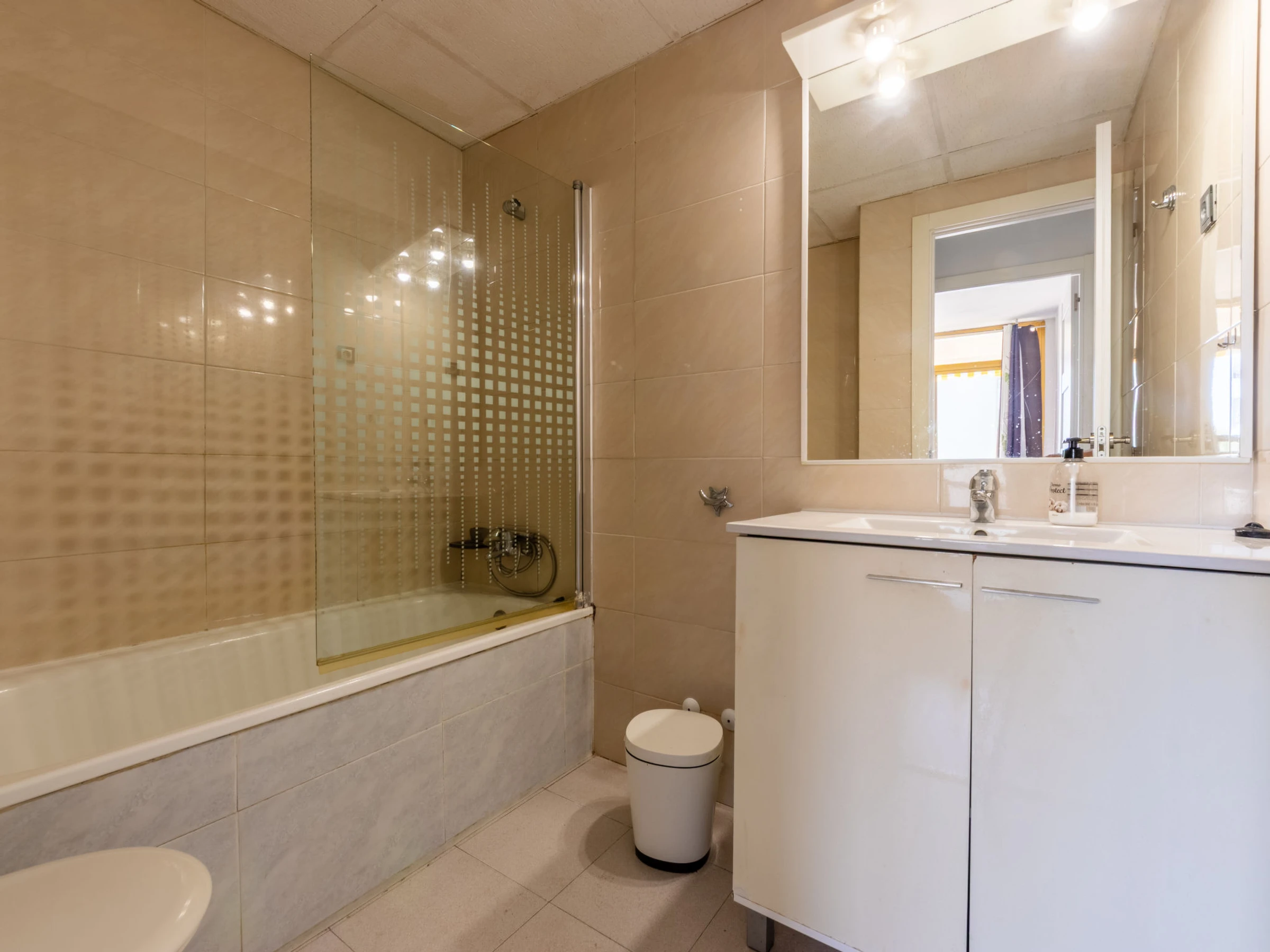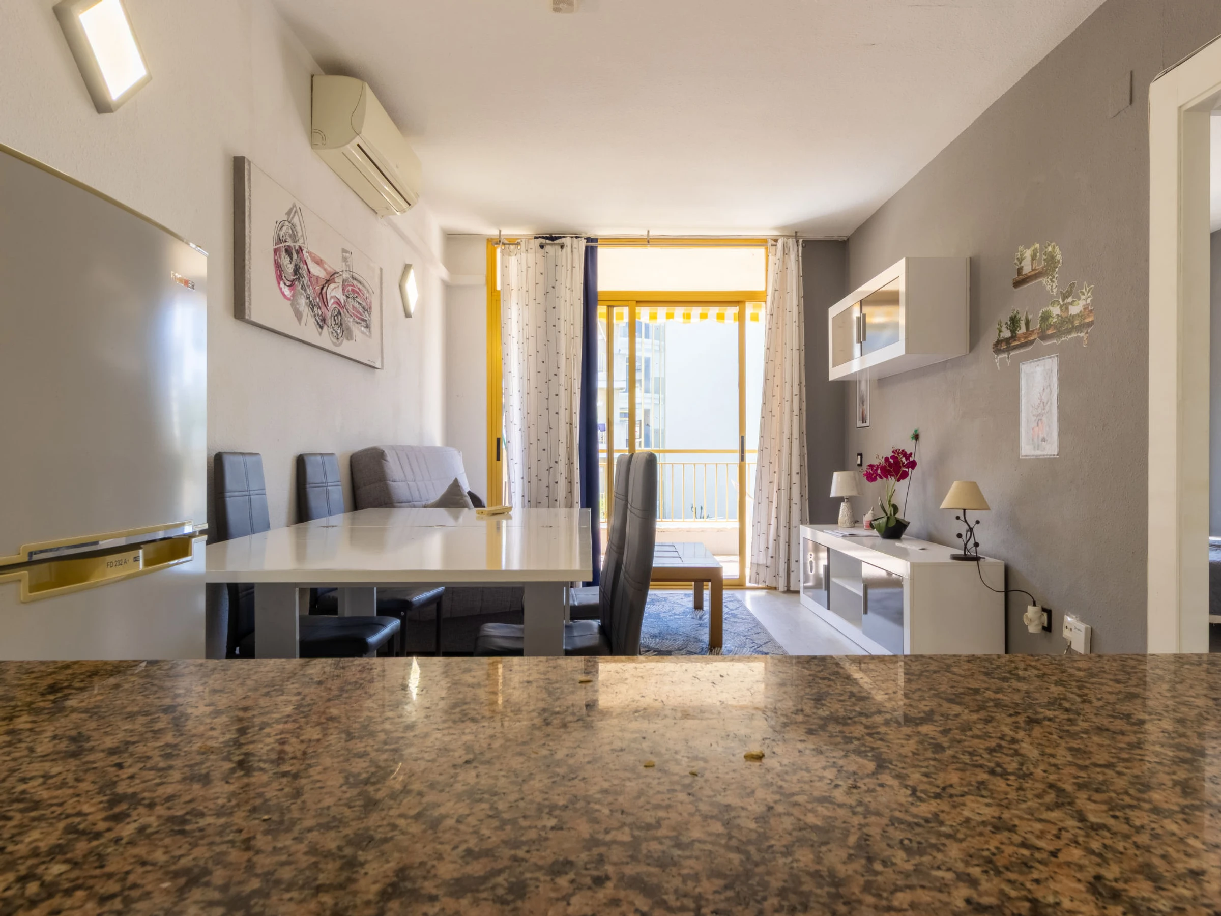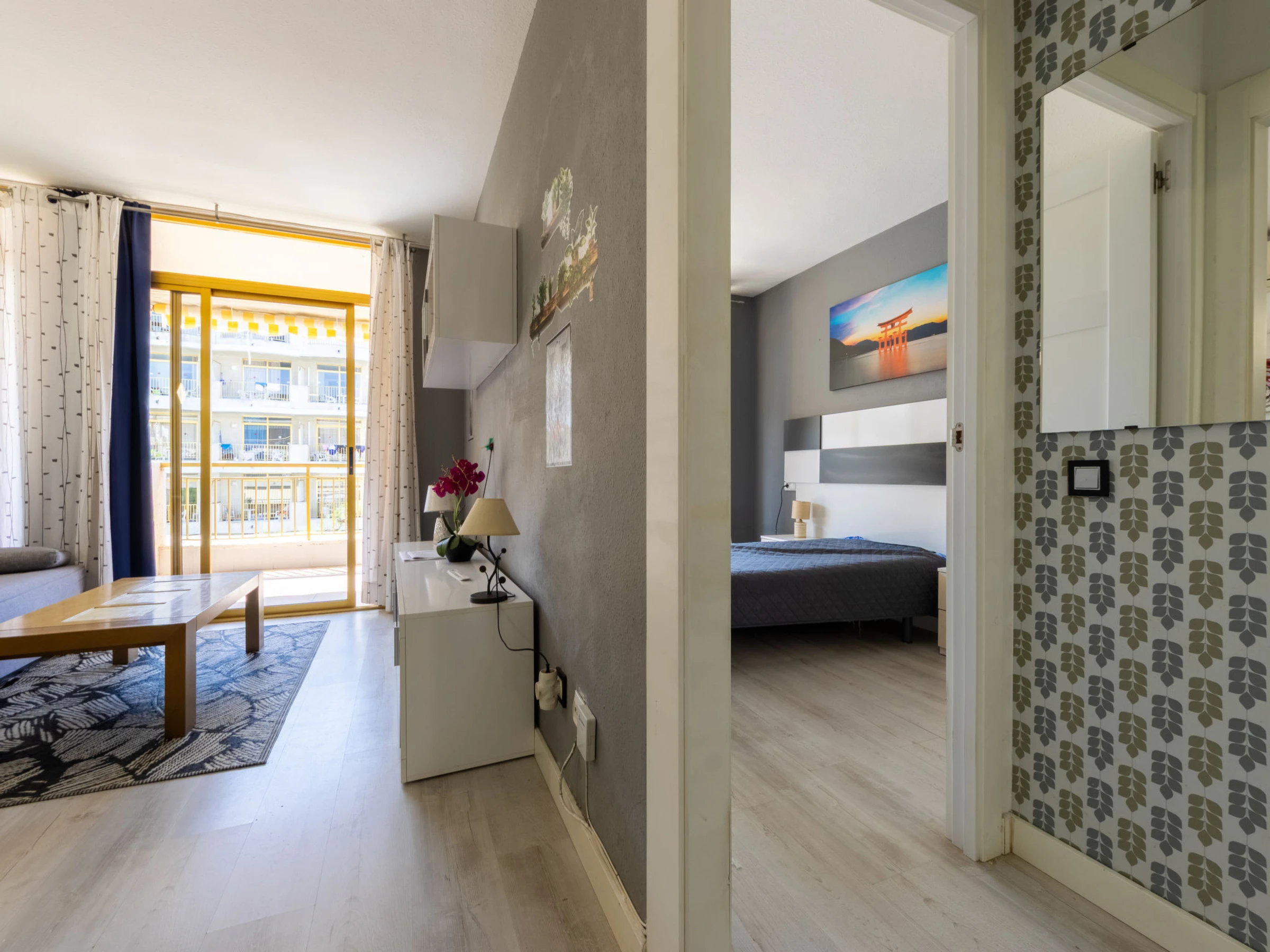 "Catalunya 92", 3-room apartment 47 m2. Object suitable for 2 adults + 2 children. Living/dining room with digital TV. 1 room with 1 french bed (150 cm, length 190 cm). Exit to the terrace. 1 room with 1 x 2 bunk beds (90 cm, length 190 cm). Open kitchen (oven, 2 ceramic glass hob hotplates, kettle, microwave, electric coffee machine). Bath/WC. Air-conditioning, forced-air heating, boiler (80 litres). Terrace furniture. View of the swimming pool. Facilities: washing machine, iron, hair dryer. Internet (WiFi, free). Please note: non-smokers only. [hidden]