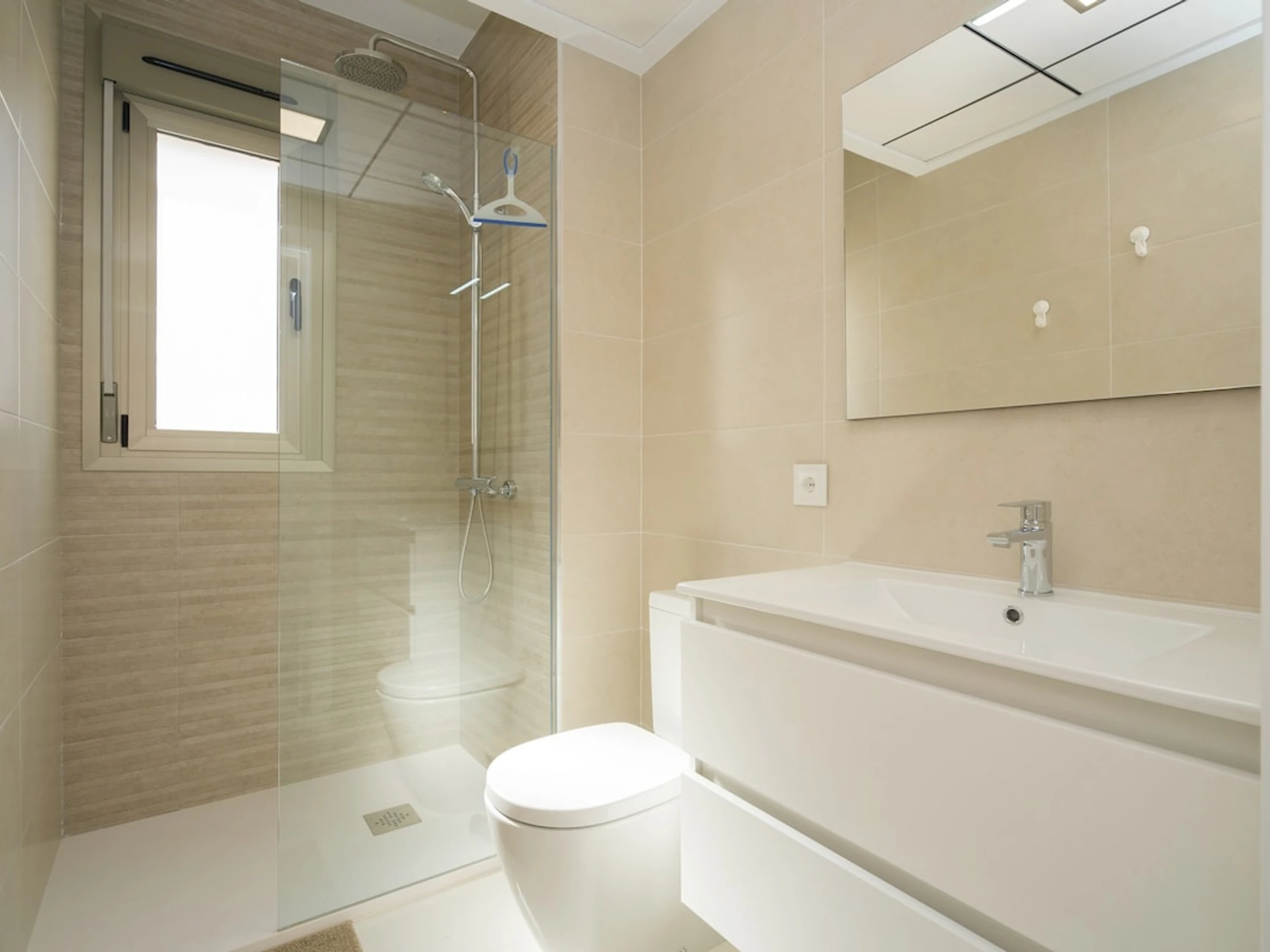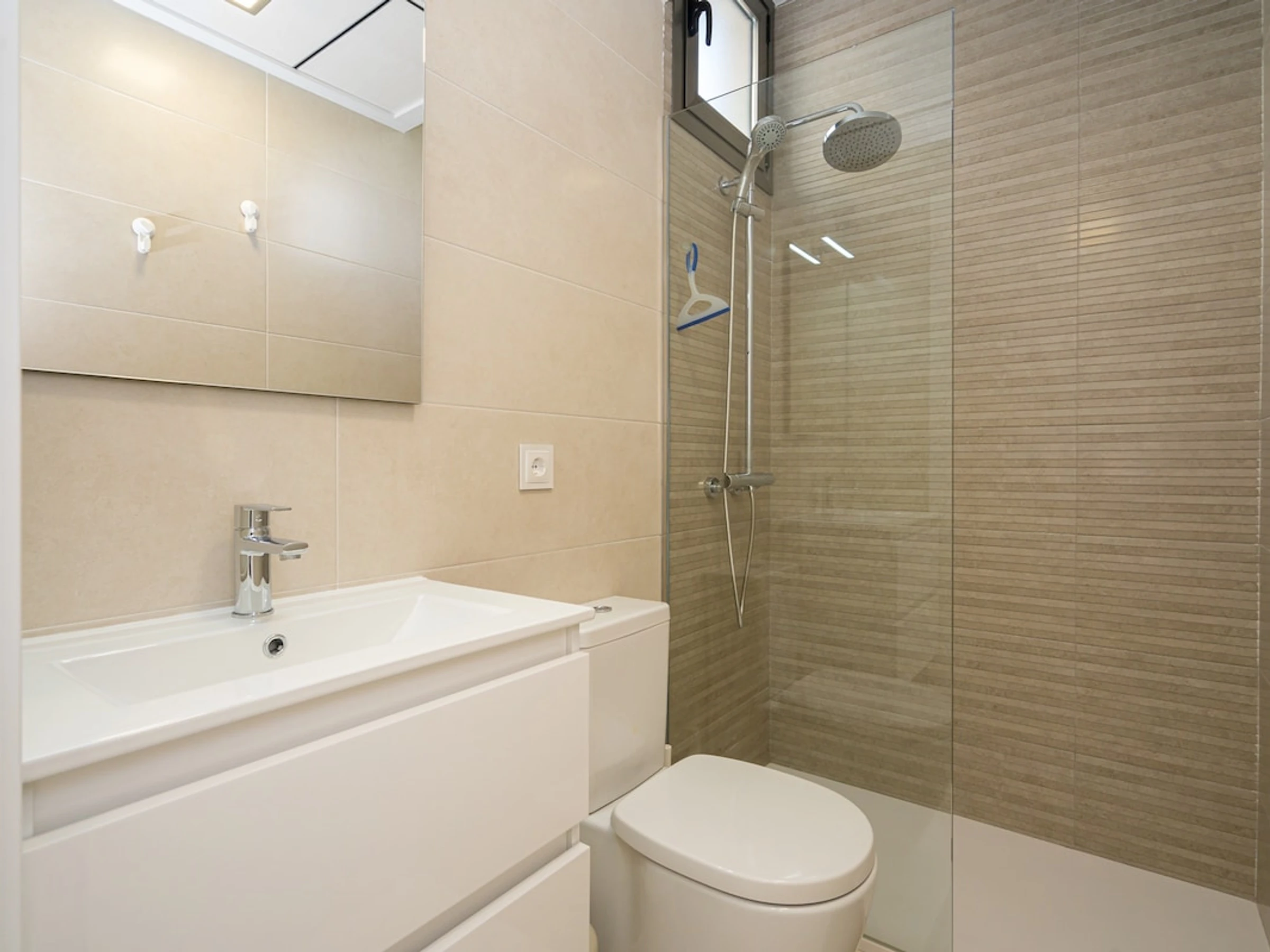 - bathroom with single washbasin, shower, toilet and hairdryer