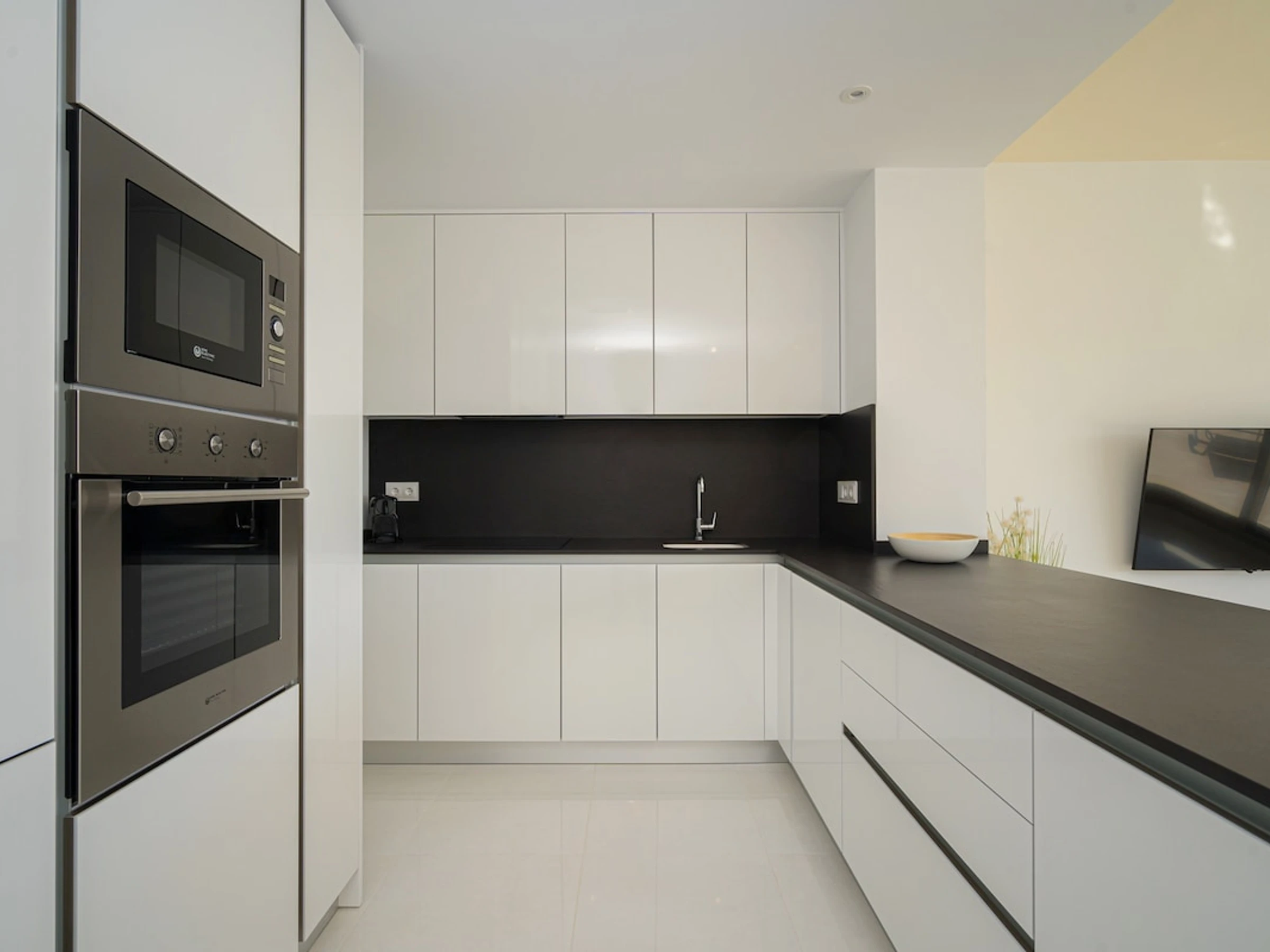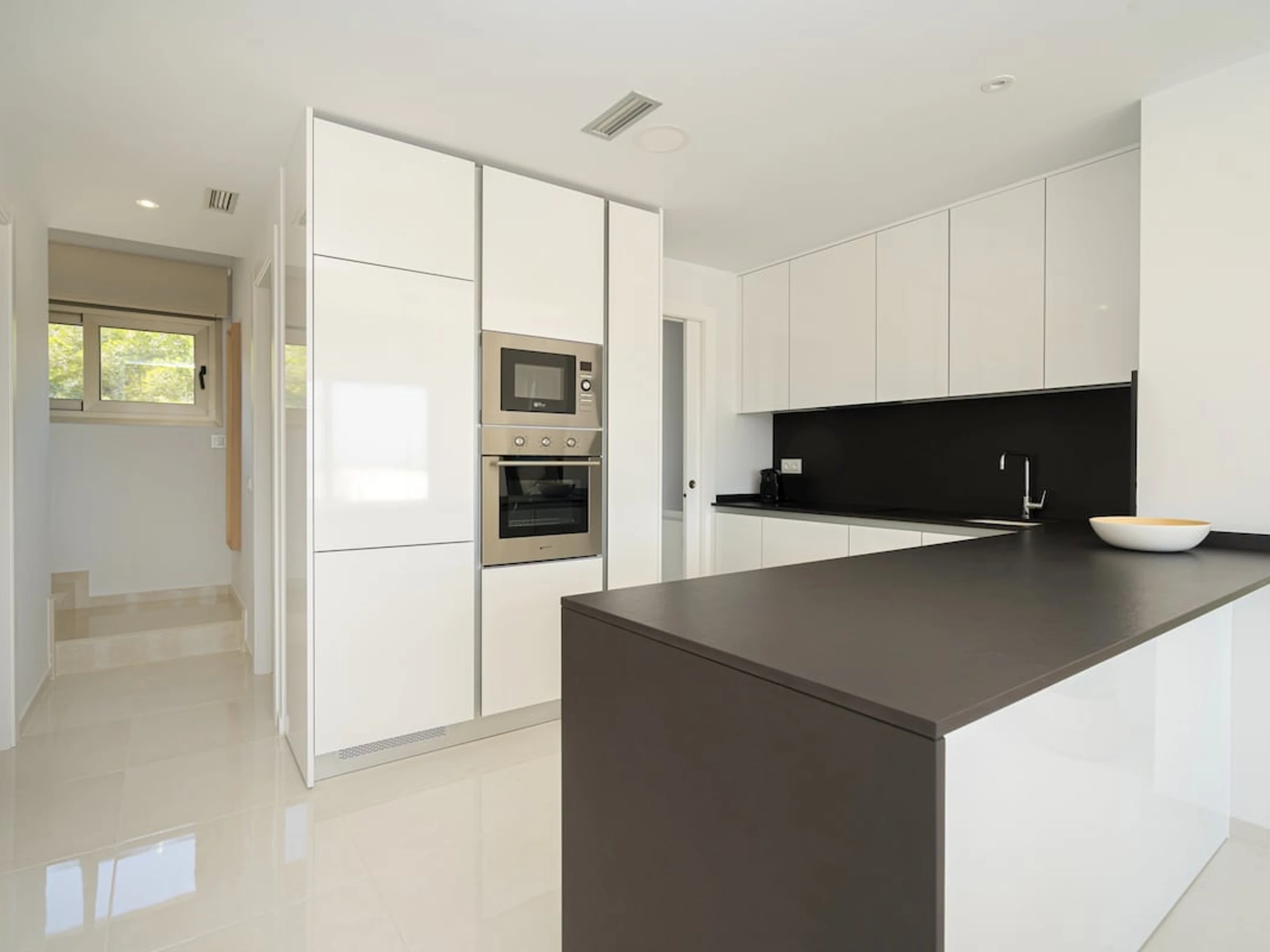 - open kitchen with electric hob, electric oven, microwave, dishwasher, refrigerator, freezer, coffee machine, electric kettle and toaster