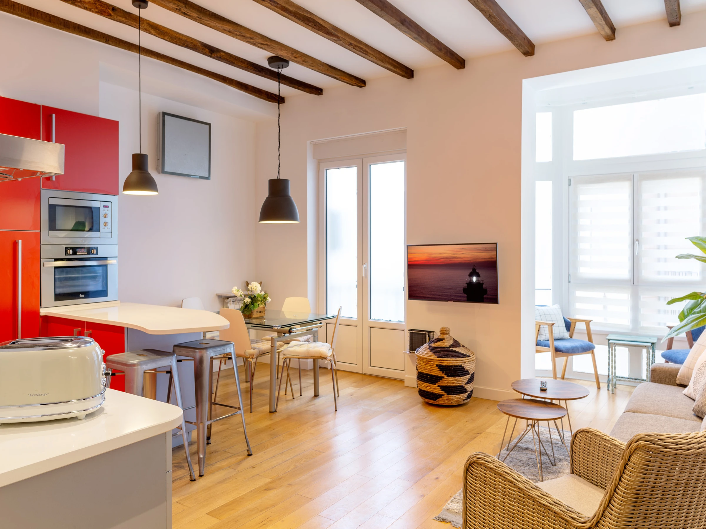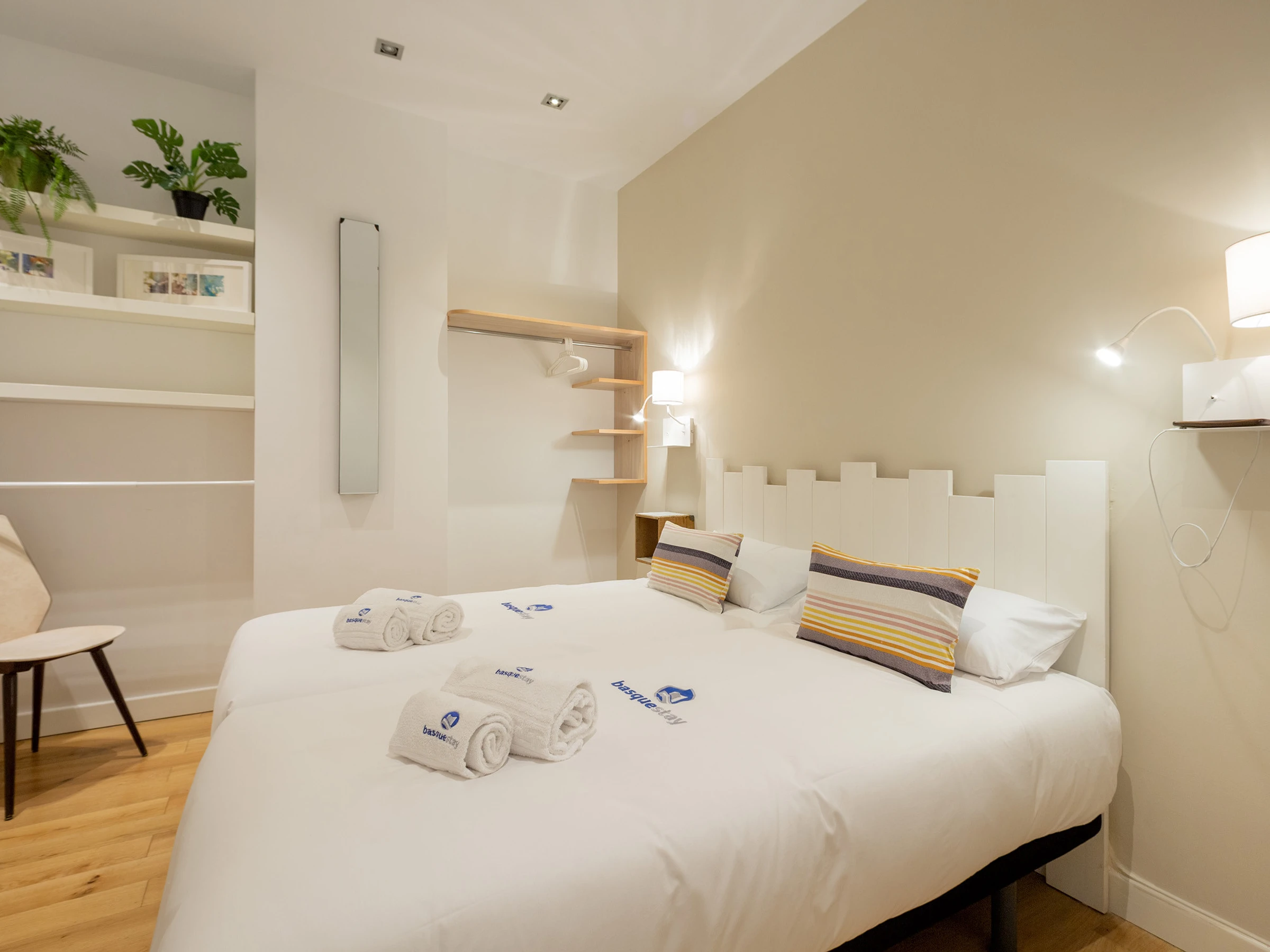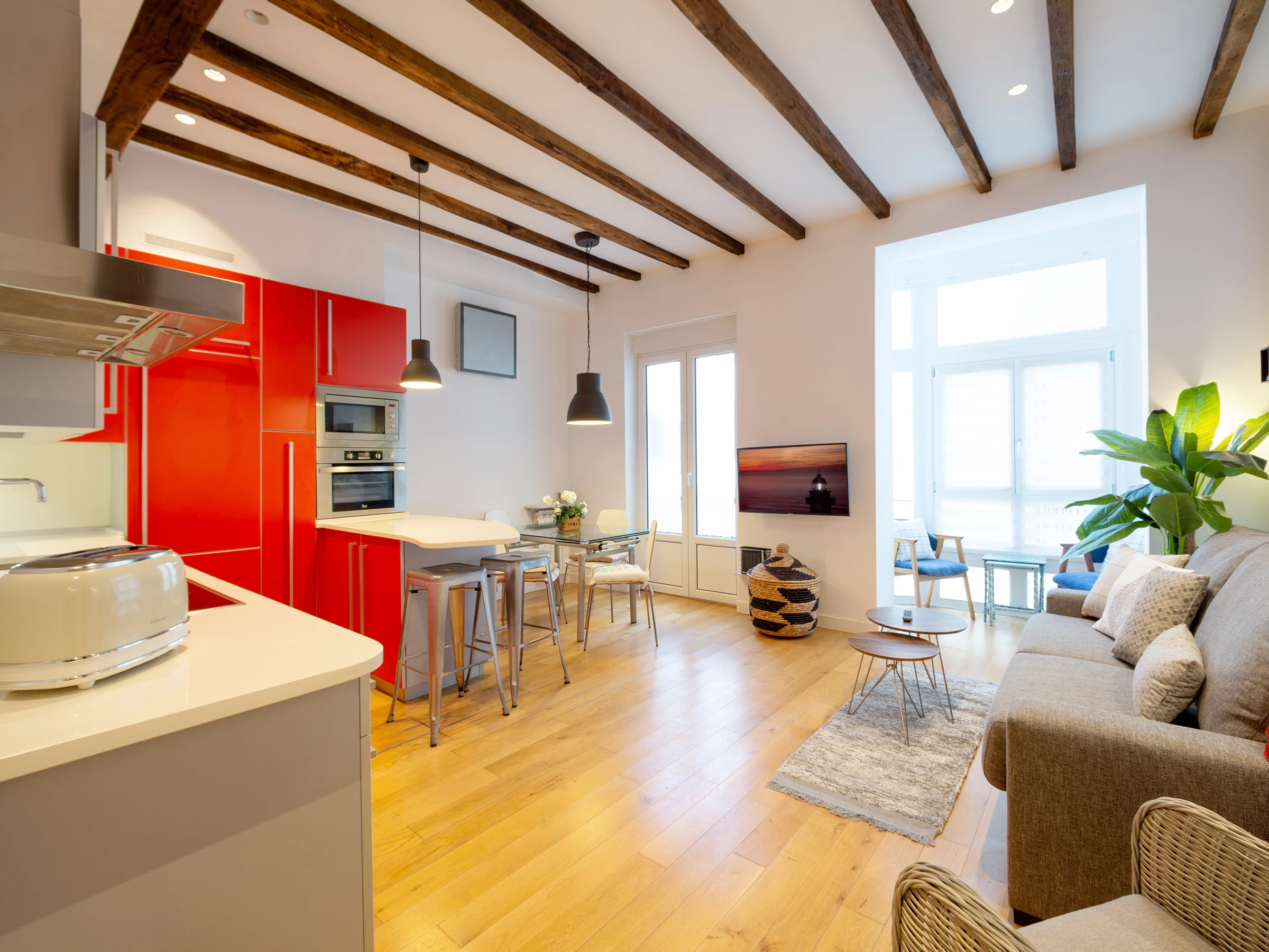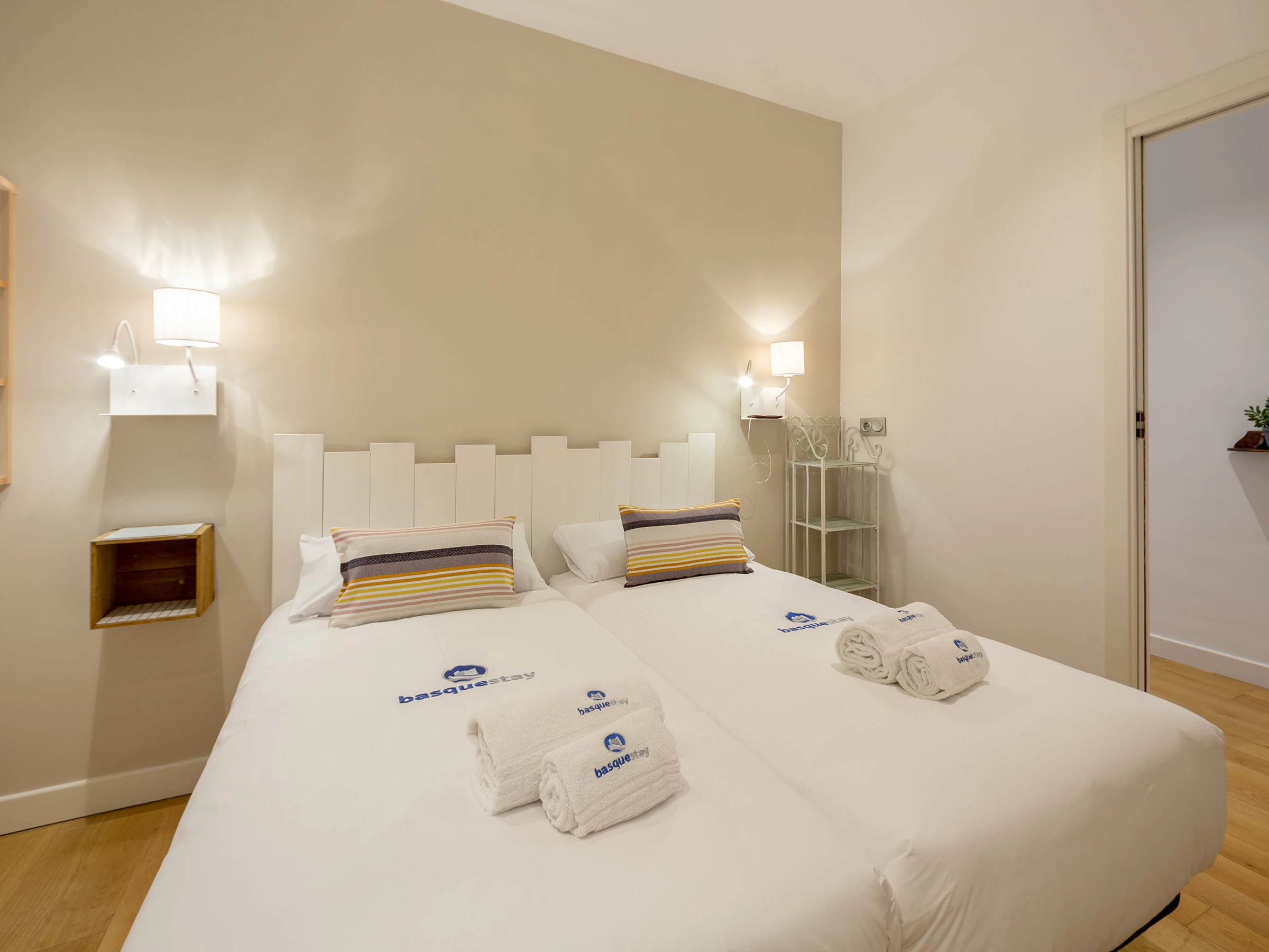 KRESALA is a fully renovated apartment that stands out for its carefully curated decoration and fantastic location. It has two bedrooms. The first has a double bed of 150 cms wide and a private bathroom with shower. The second bedroom has 2 single beds of 90 cms wide and there is a second full bathroom in the hallway. Both rooms include the necessary duvets, sheets and towels. The kitchen is fully equipped with all kinds of appliances: ceramic hob, extractor hood, oven, microwave, washing machine, dishwasher, refrigerator, coffee maker and electric kettle.