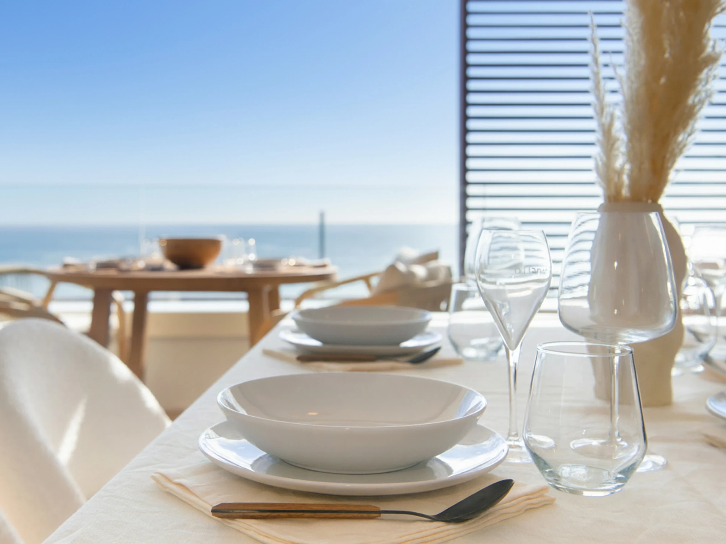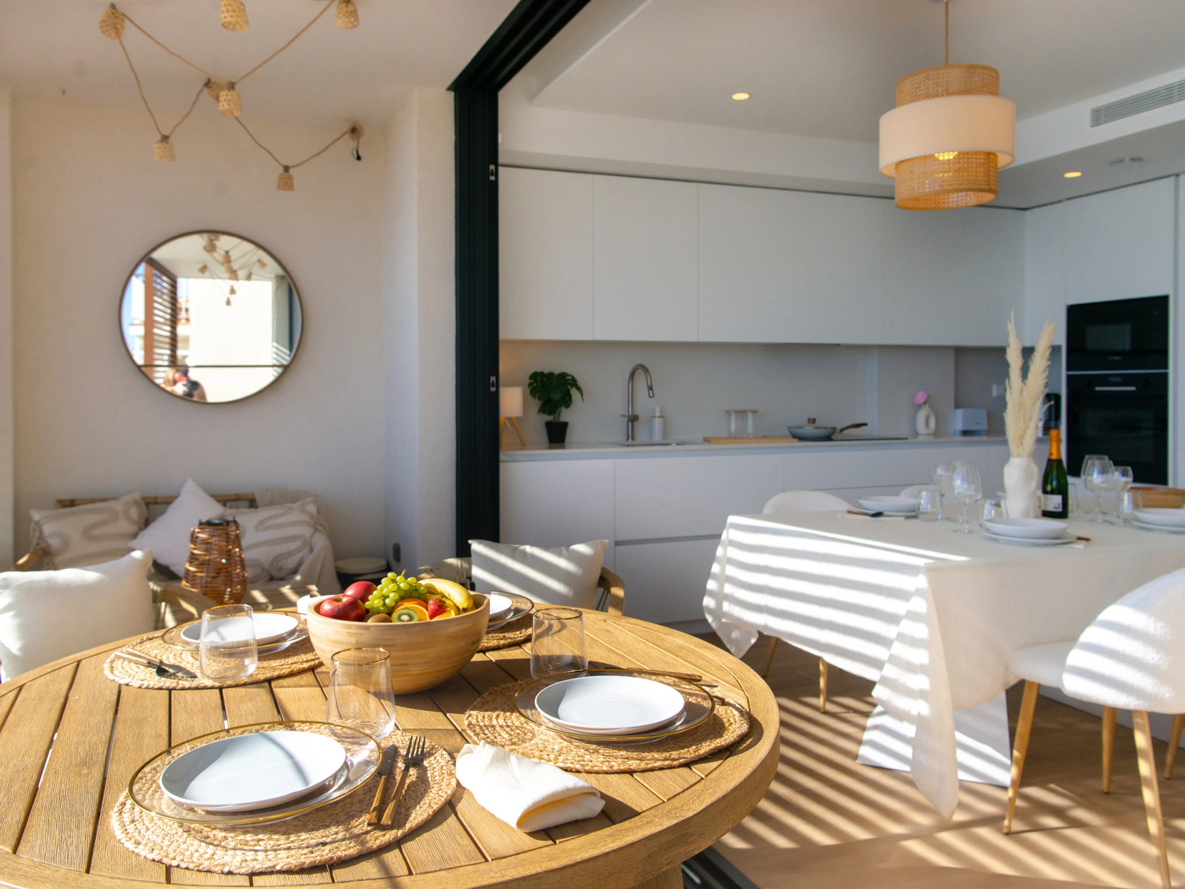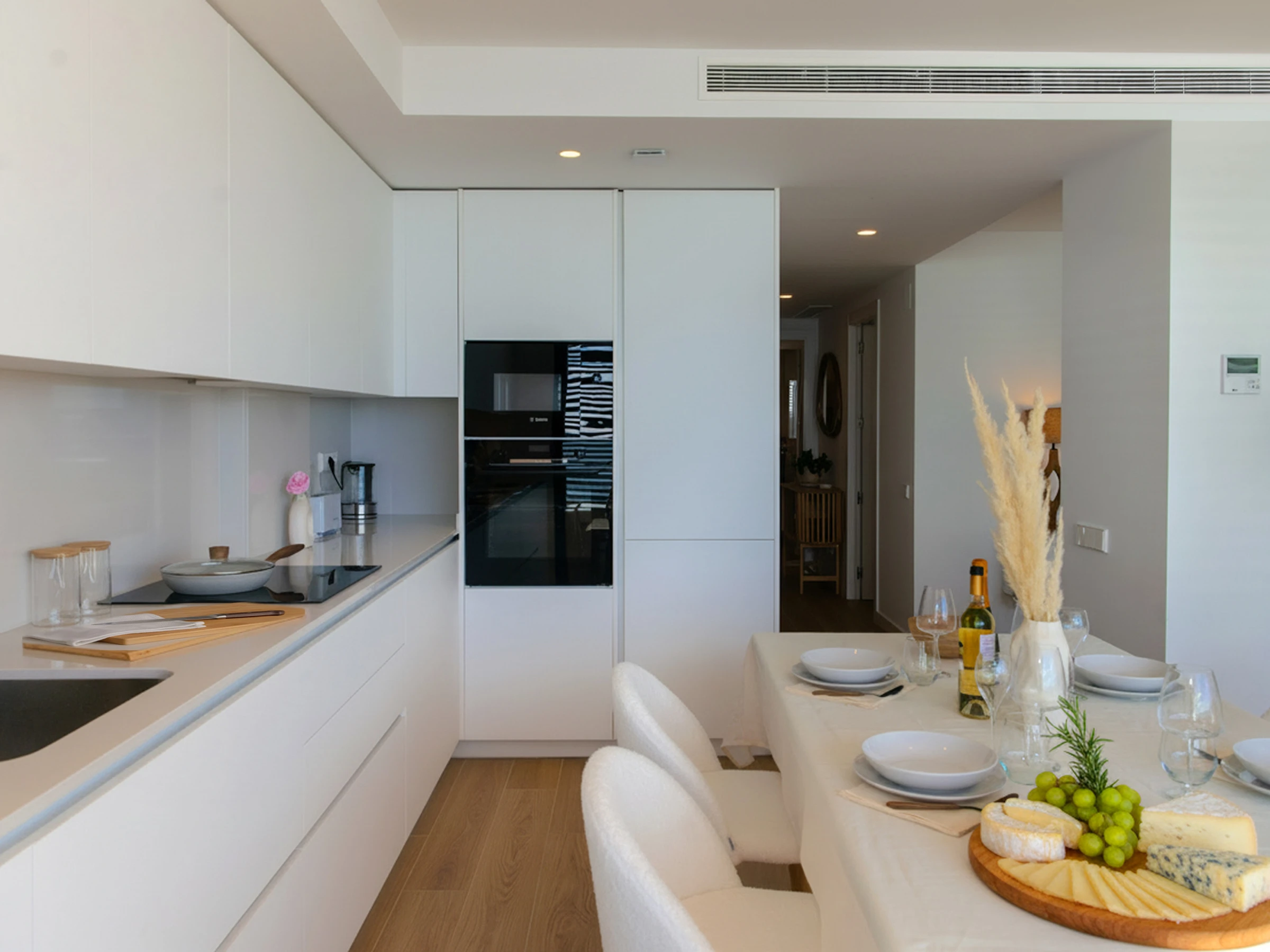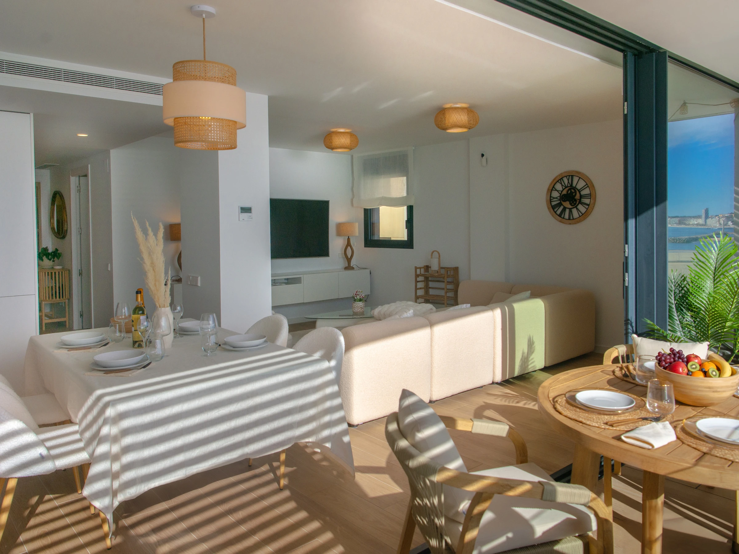 The property features a comfortable living room, a fully equipped American kitchen for daily use, and an environment designed for relaxation after a day at the beach. Additionally, the building offers two communal swimming pools, a coworking space, and a gym, an ideal combination to alternate sunny days with moments of relaxation and activity.