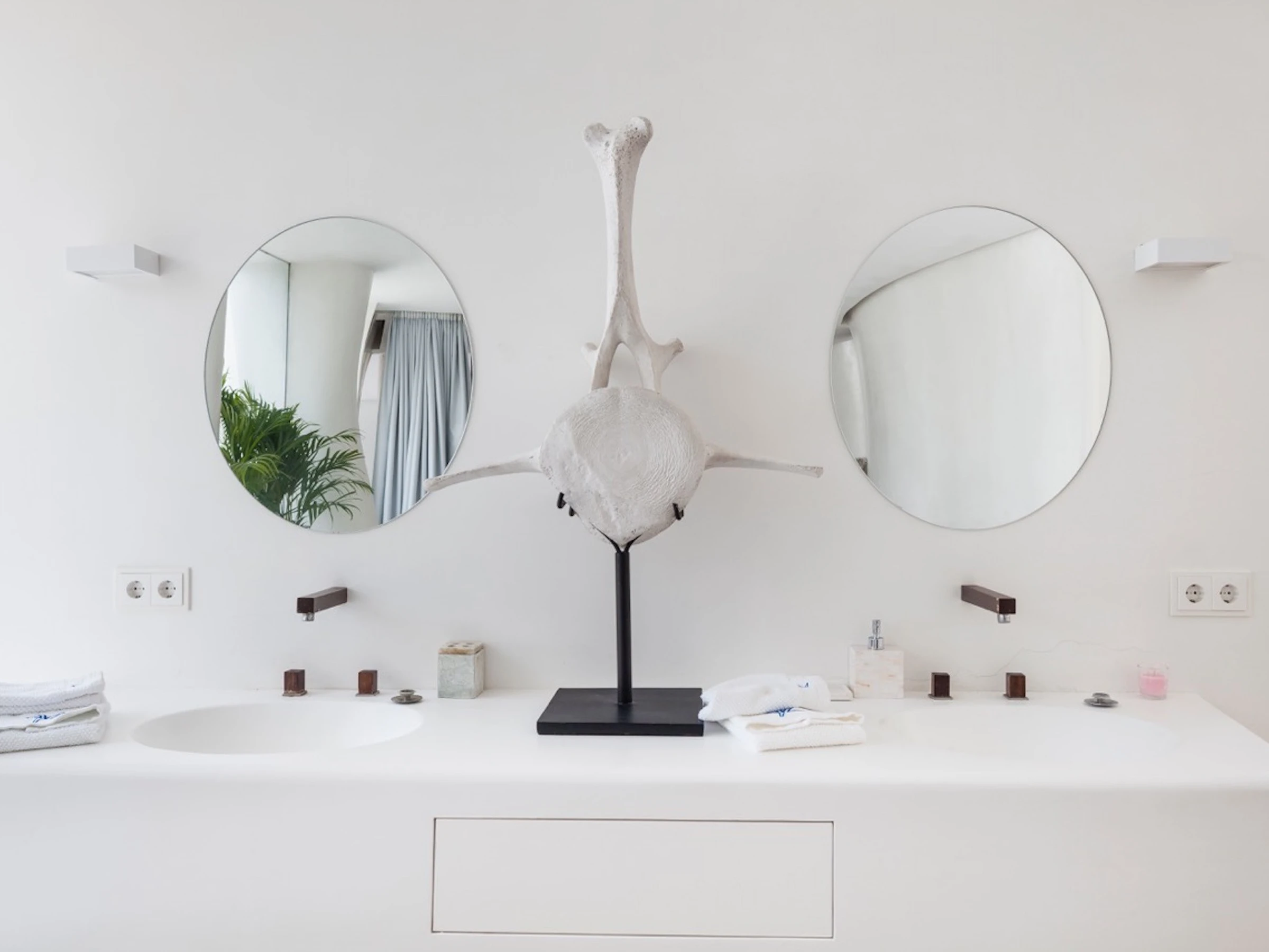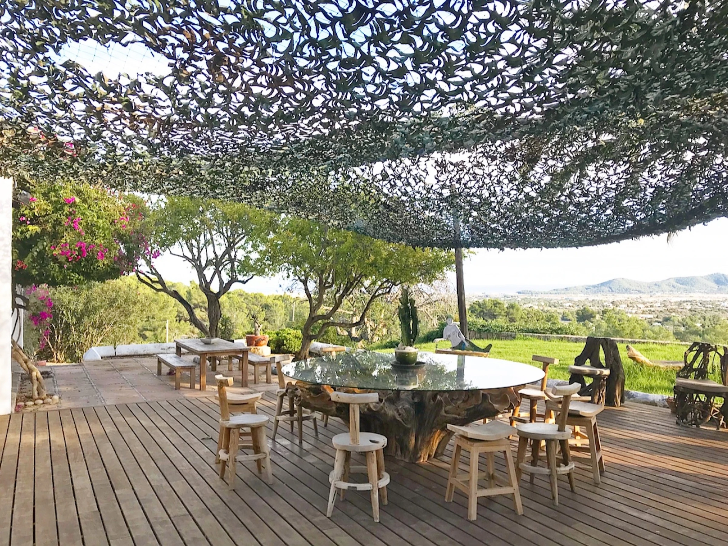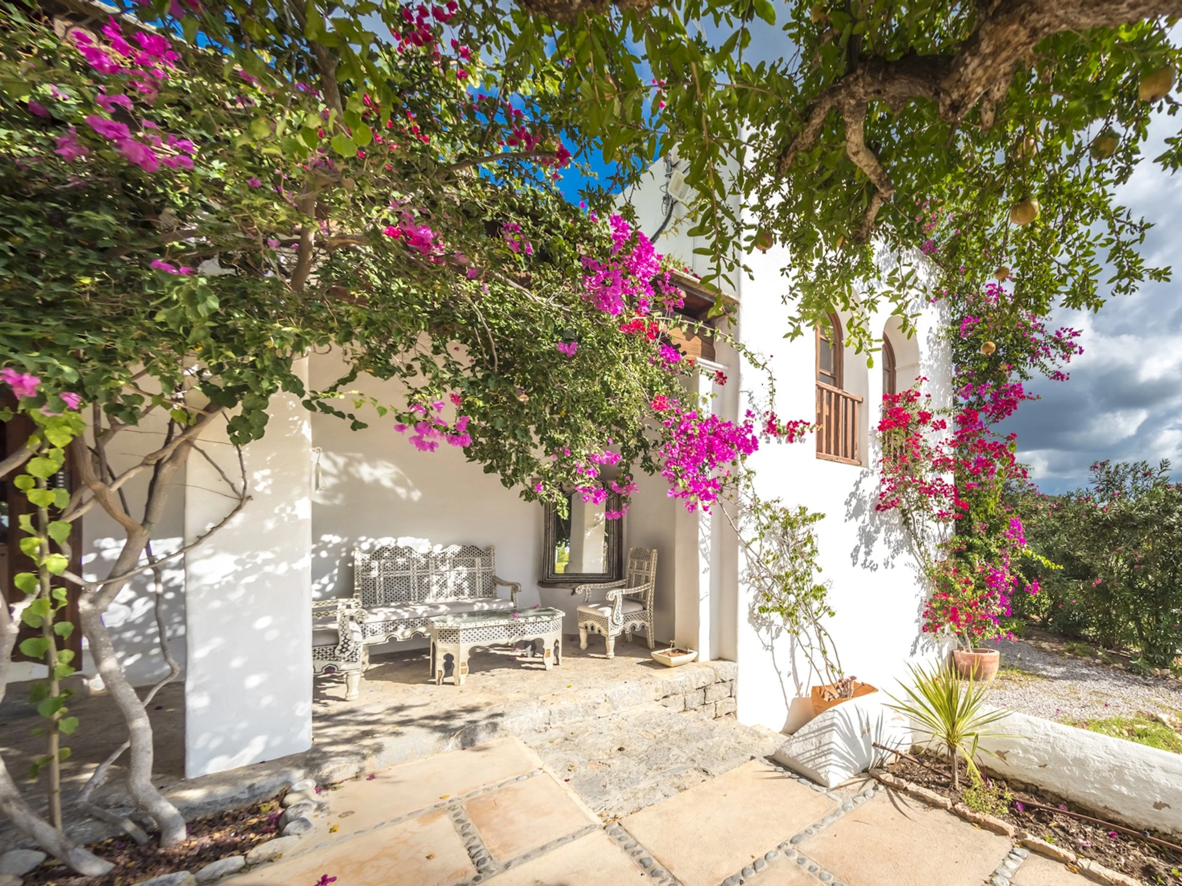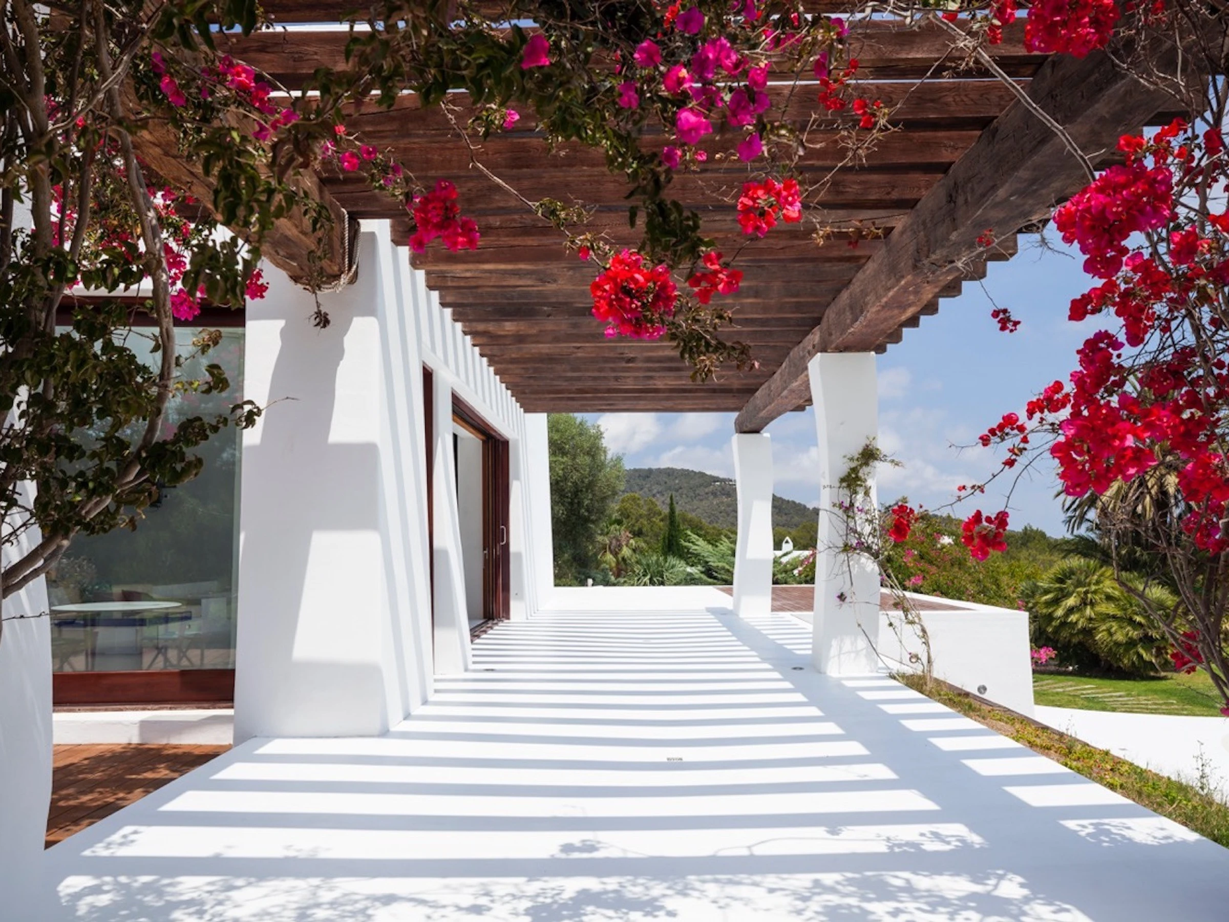 The large garden is filled with scenic spots to relax in the Ibizan sunshine. Laze in the shade of a terrace draped in bright pink bougainvillea. Pull up a chair under a shady canopy to enjoy a meal with friends. Or stretch out on a poolside daybed in sheer bliss.