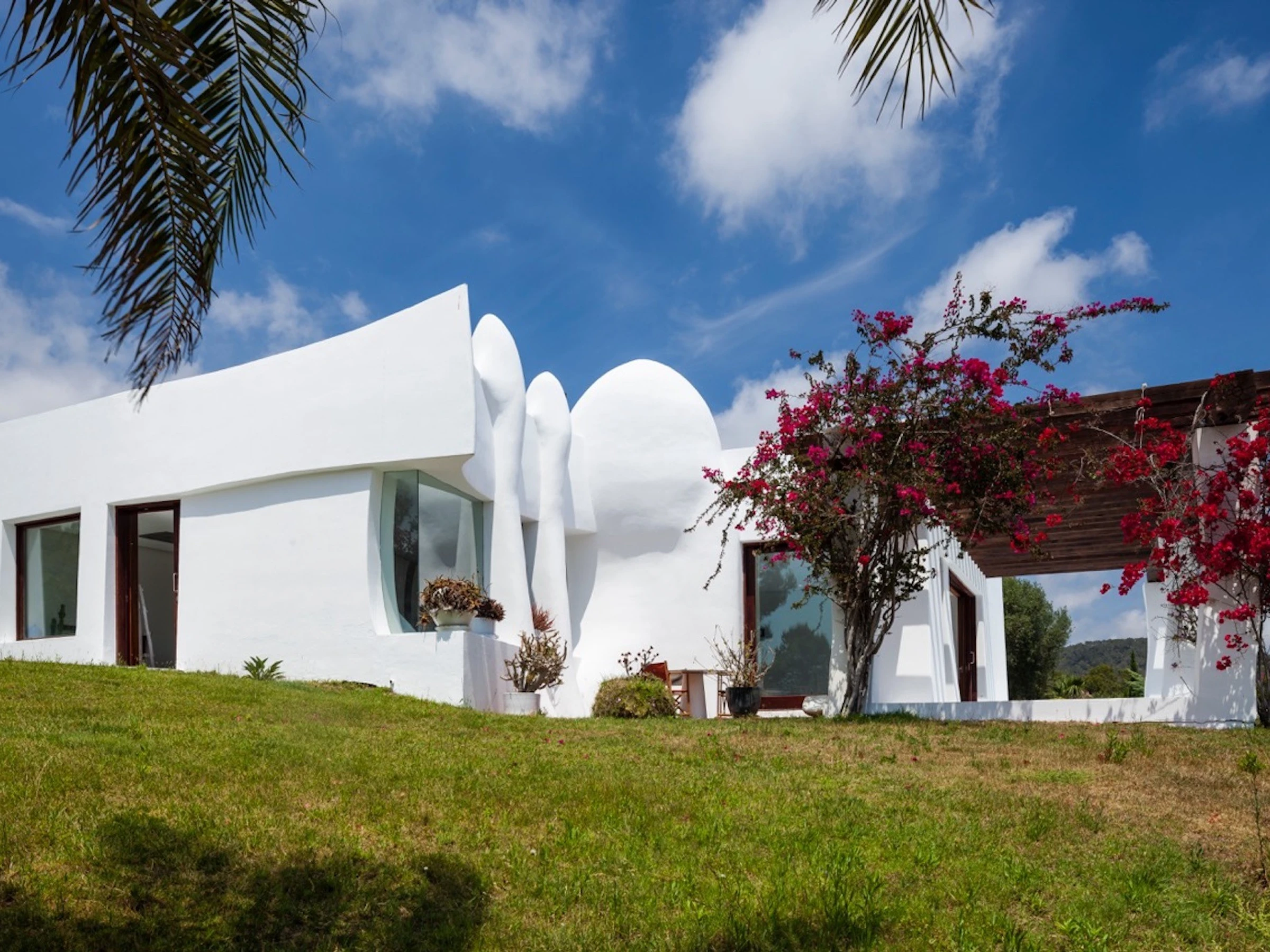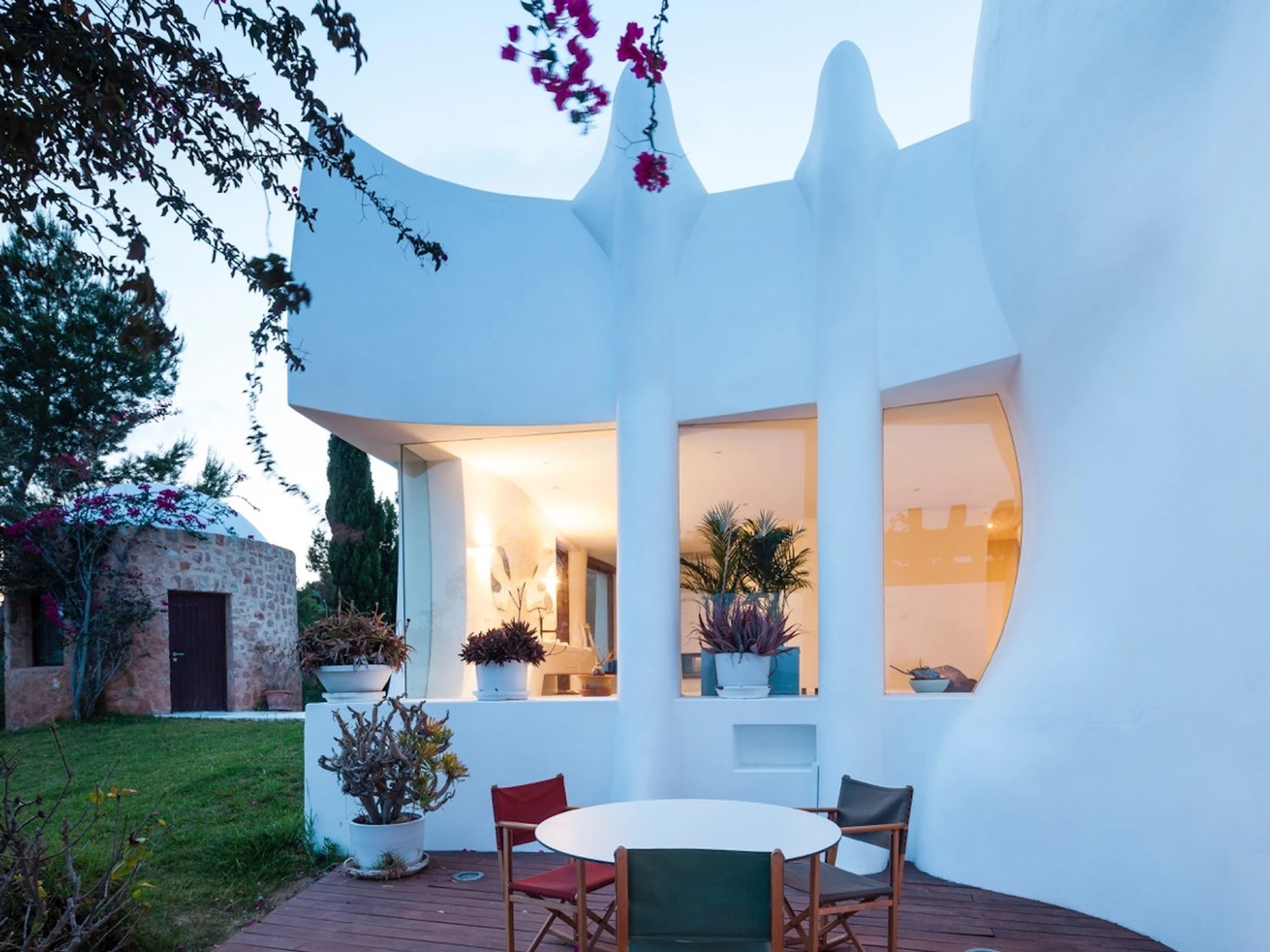 This pretty Ibizan holiday home’s low-slung whitewashed walls feature quirky Gaudi-esque rendered curves before merging with sleek terraces of wooden decking.