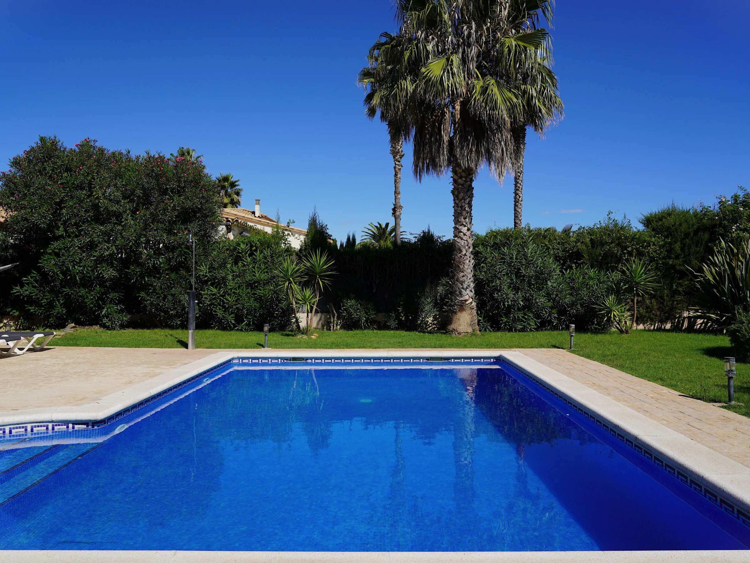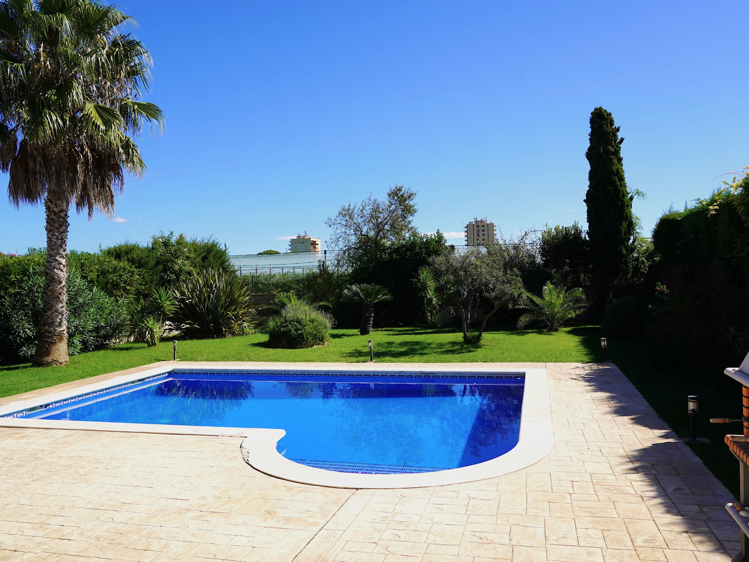 The villa offers four comfortable bedrooms, a private swimming pool, and a fenced garden with outdoor furniture, perfect for relaxing in the sun or enjoying a barbecue on the terrace. Air conditioning ensures a comfortable stay, and baby cots and high chairs can be provided upon request.