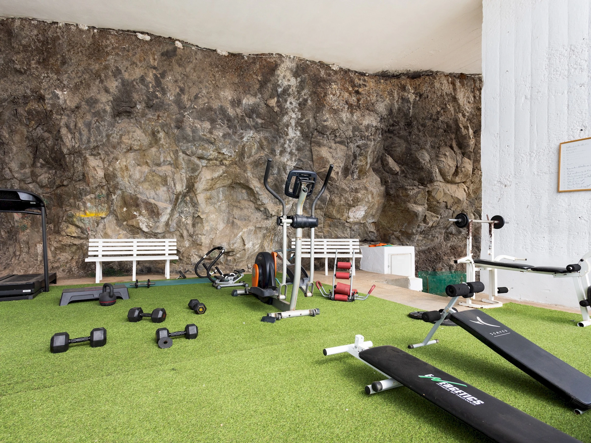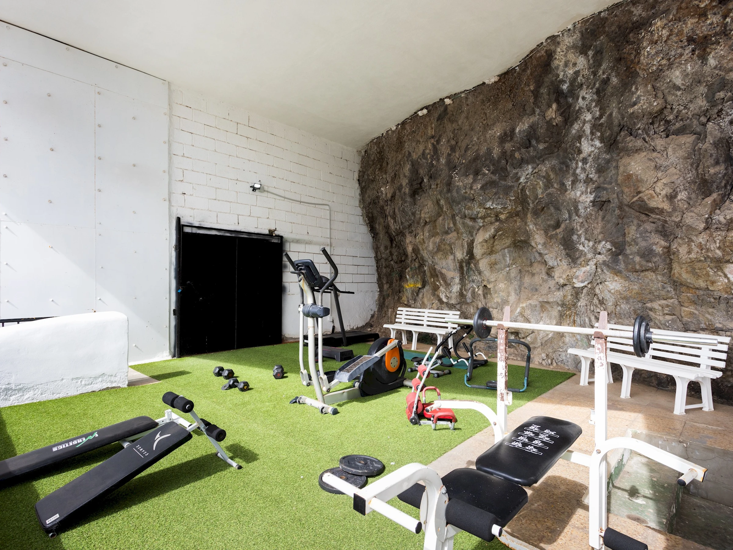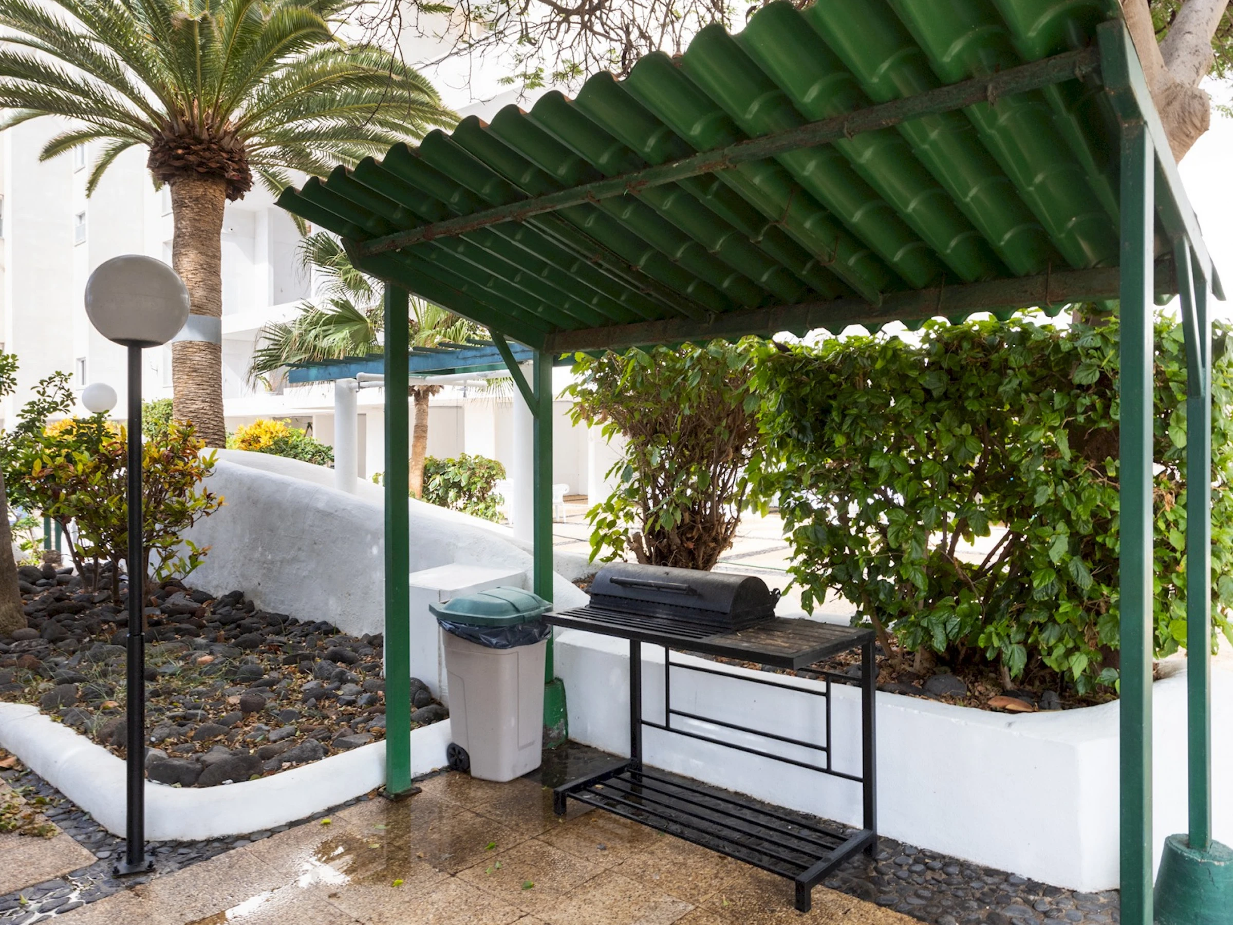 The building has common areas that include relaxation areas with hammocks facing the beach, a barbecue area, a small gym, and outdoor spaces, offering guests the opportunity to relax, socialize, and enjoy the seaside setting.