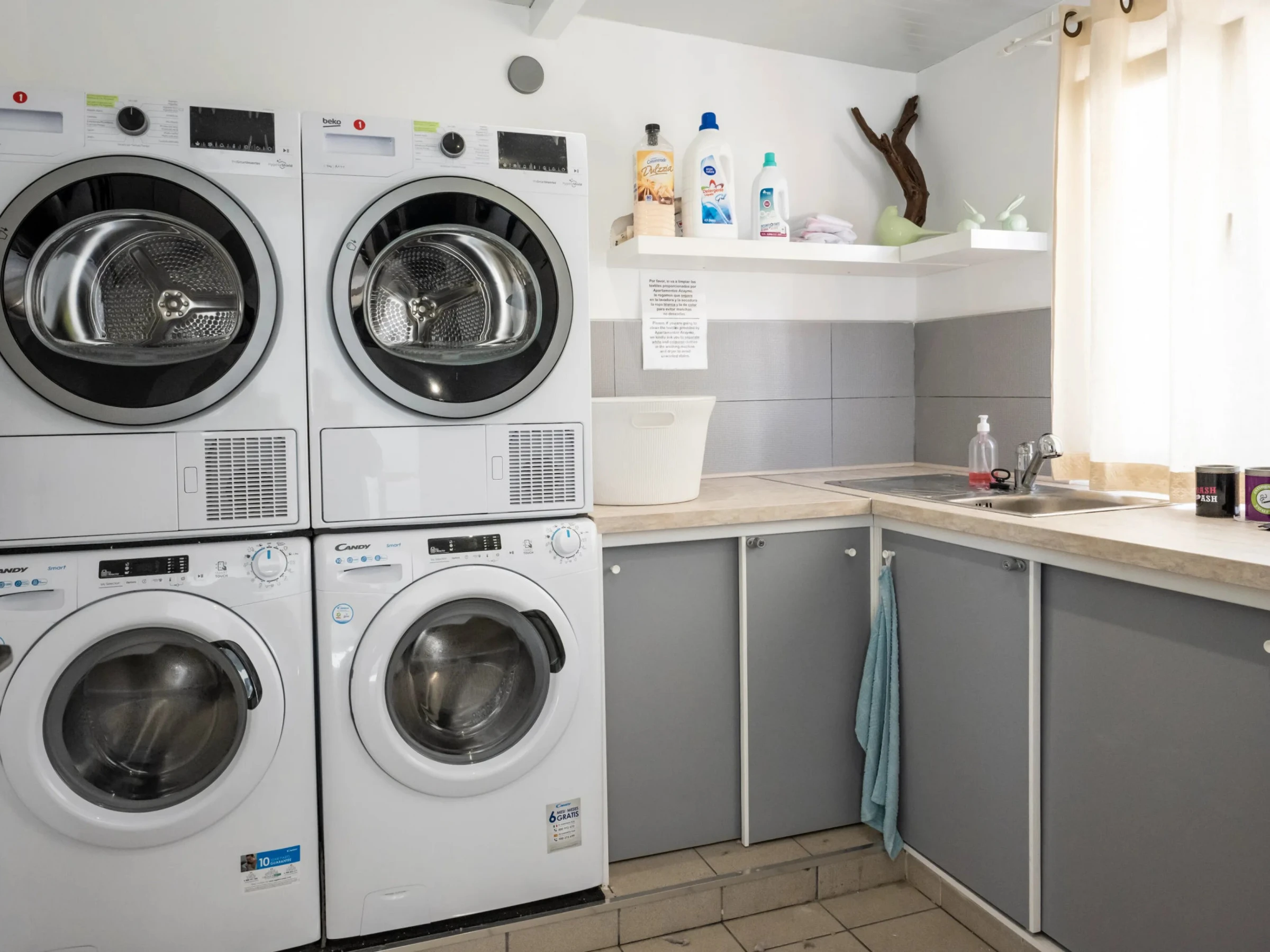 In the kitchen, refrigerator, microwave, oven, freezer, washing machine, dryer, dishes/cutlery, kitchen utensils, coffee machine, toaster, kettle and juicer.