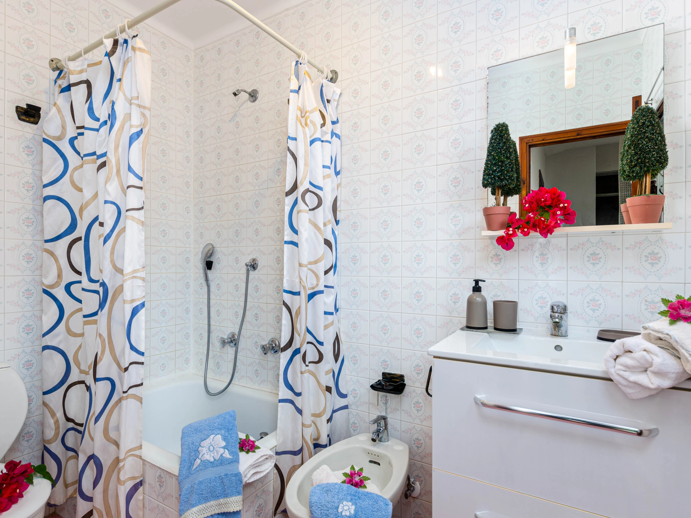 The full bathroom features a bathtub, shower, and hairdryer. A washing machine is also available, perfect for longer stays. A cot and high chair are available upon request, making this apartment an excellent choice for families with young children.