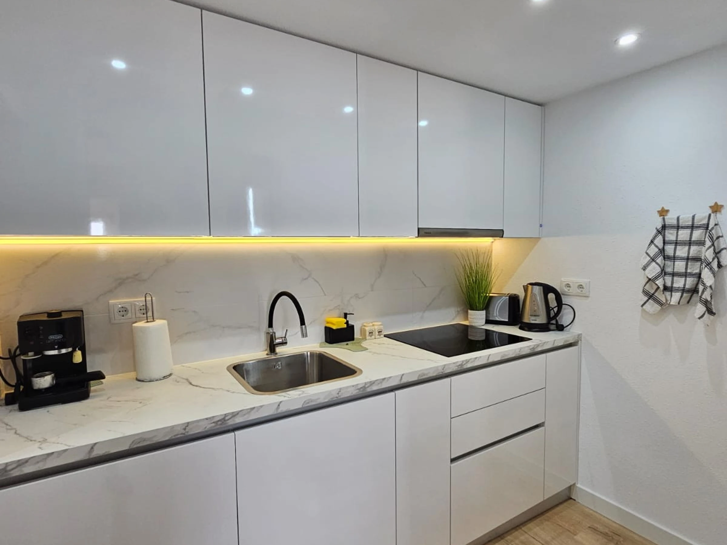 The kitchen, is equipped with refrigerator, microwave, oven, freezer, dishwasher, kitchen utensils, coffee machine, toaster and kettle.