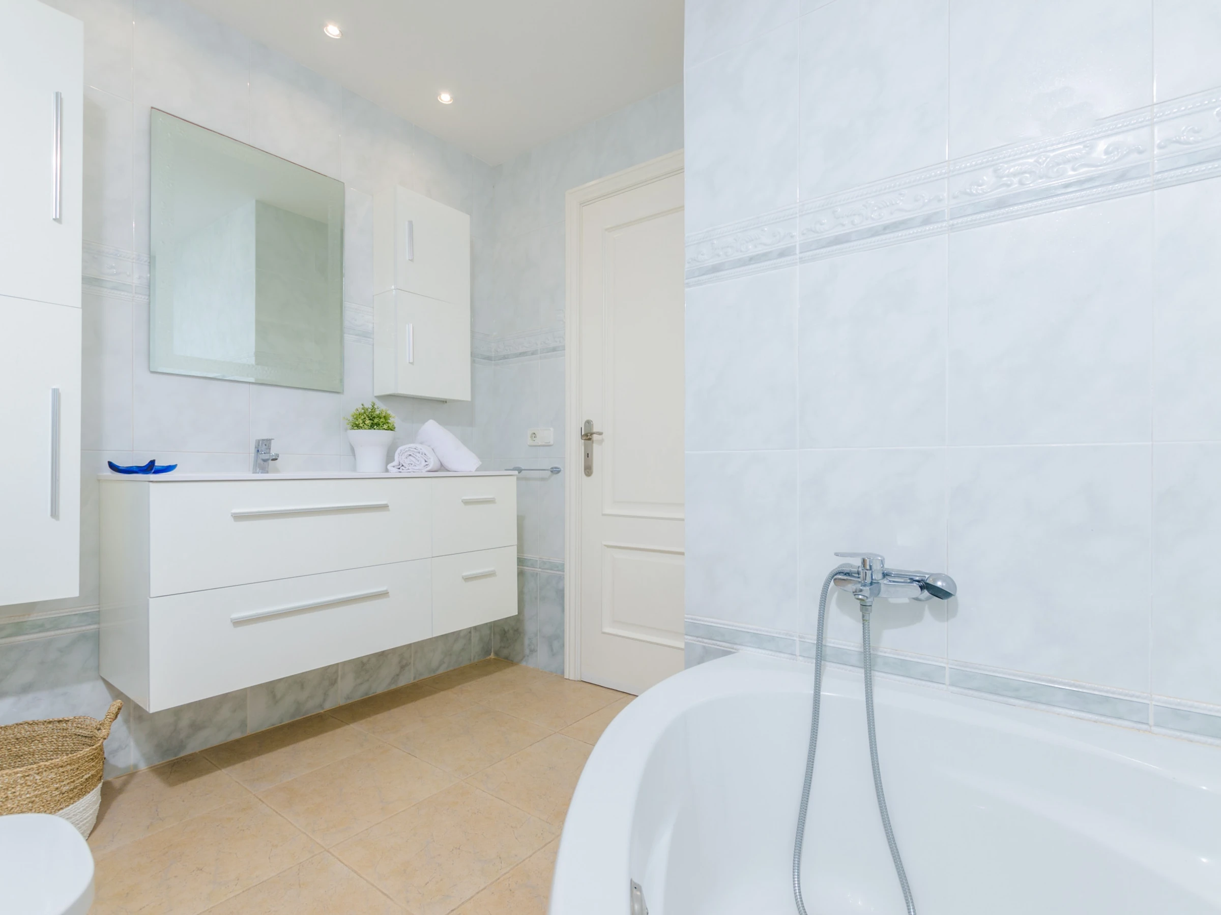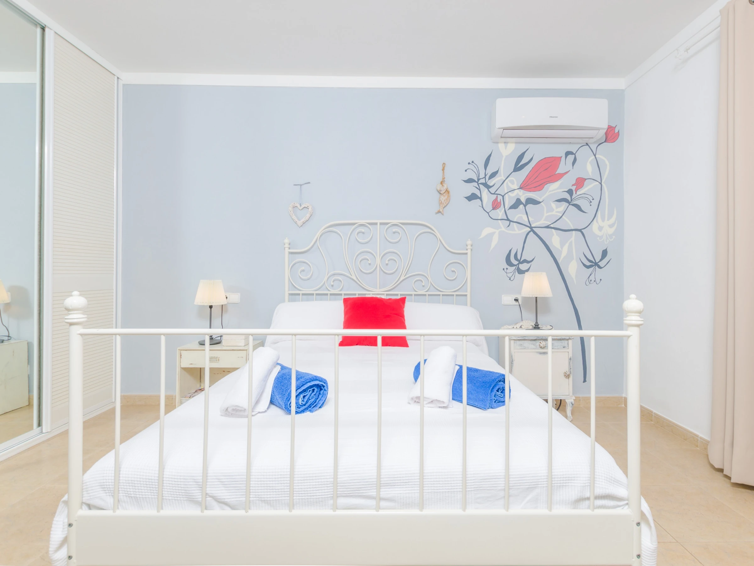 You can choose from three bedrooms for rest. The first, located on the ground floor, has a double bed, air conditioning, a wardrobe, and an en-suite bathroom with a bathtub. Also on the ground floor is another bathroom with a shower. The first floor houses two more bedrooms: one with two single beds and the other with a double bed. Both rooms are air-conditioned and have wardrobes. For those traveling with a baby, we can provide a cot and high chair upon request.