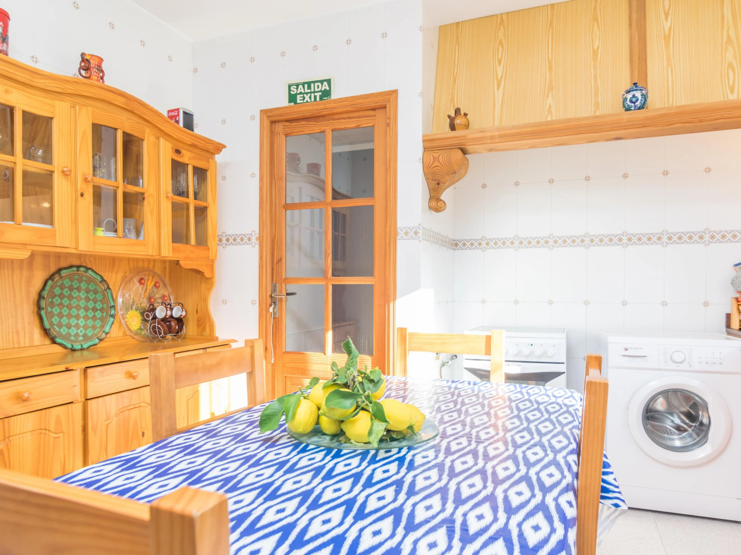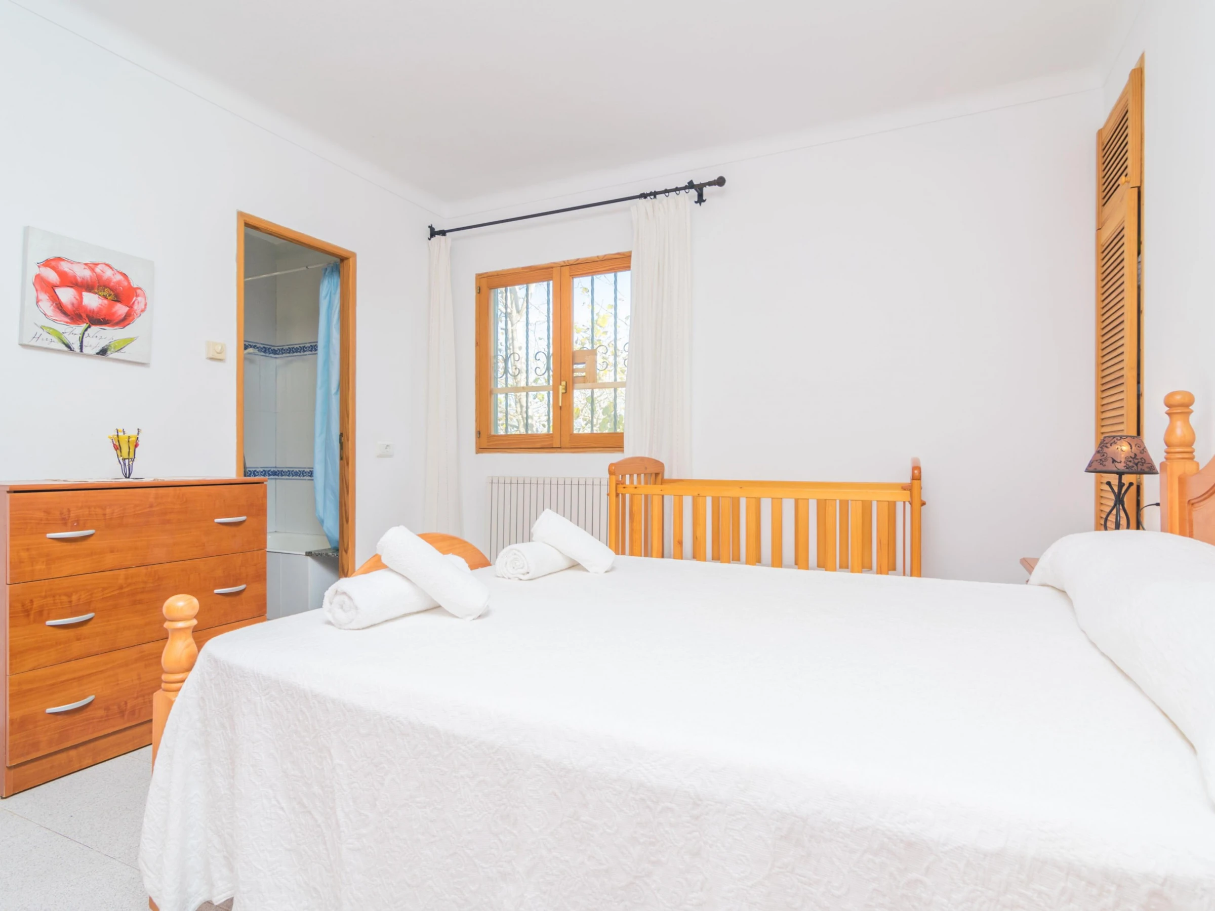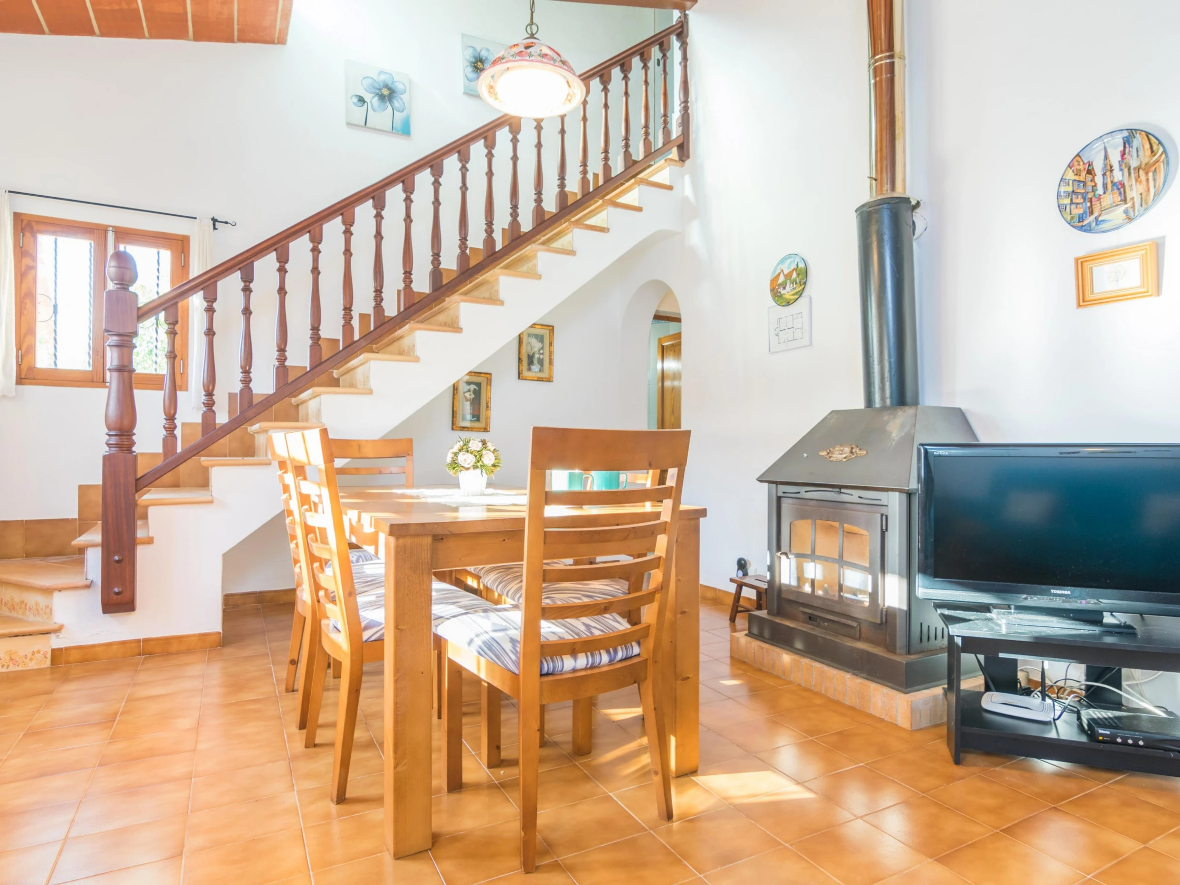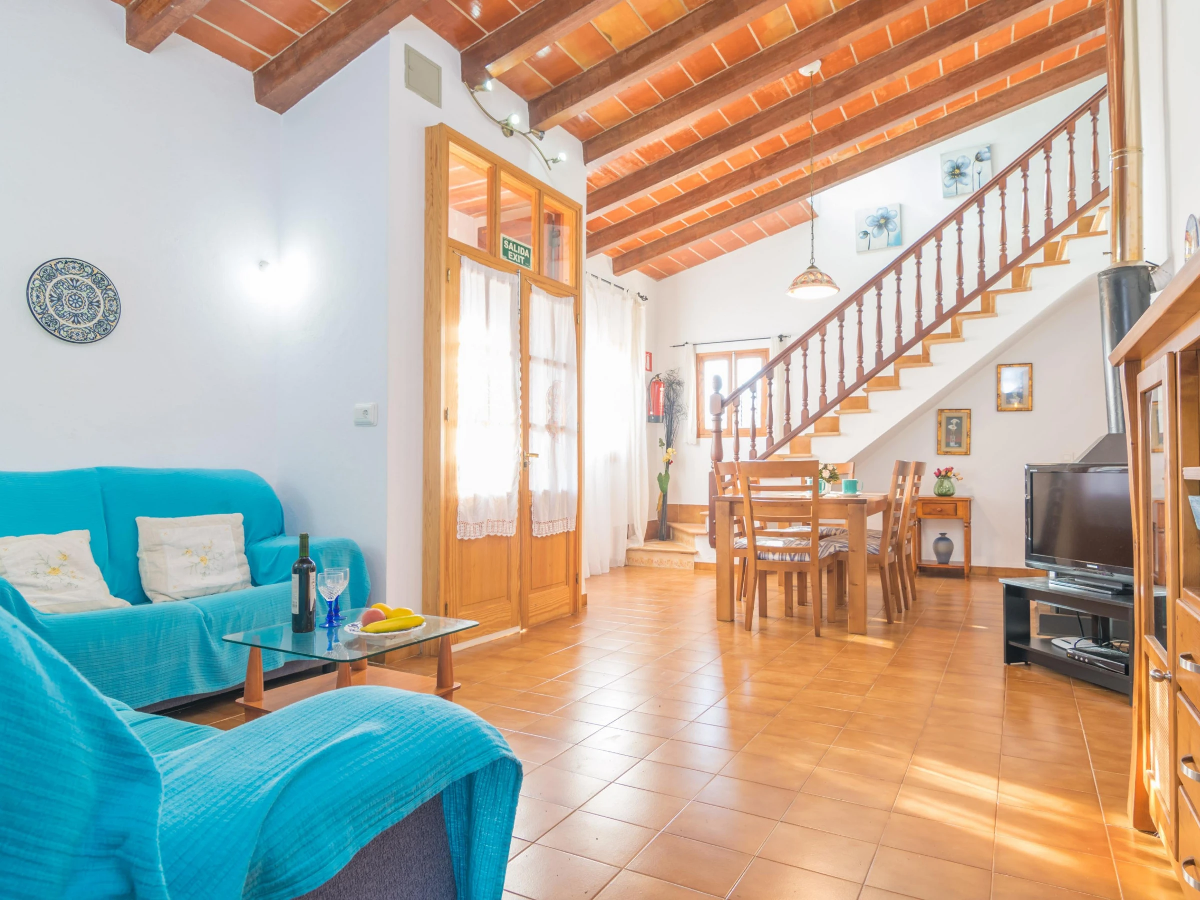 This two-storey house boasts a traditional but cosy style. The beautiful living-dining room is equipped with satellite TV to watch a film and the comfortable sofa. The dining table comes with a table and space for 6 people and the room also has AC. The kitchen is independent and it has a ceramic hob as well as all you may need to cook delicious dishes. In addition, you also can enjoy your meals right there, since there is another table in here. The washing machine, the iron and the ironing board also are in the kitchen. The house offers 3 bedrooms where you can rest. Two of them have a double bed -one with an en-suite bathroom with a tub-. The last bedroom has twin beds. If you are travelling with your baby we can prepare a cot and a high chair. Finally, there is another bathroom with a shower for the rest of the house.