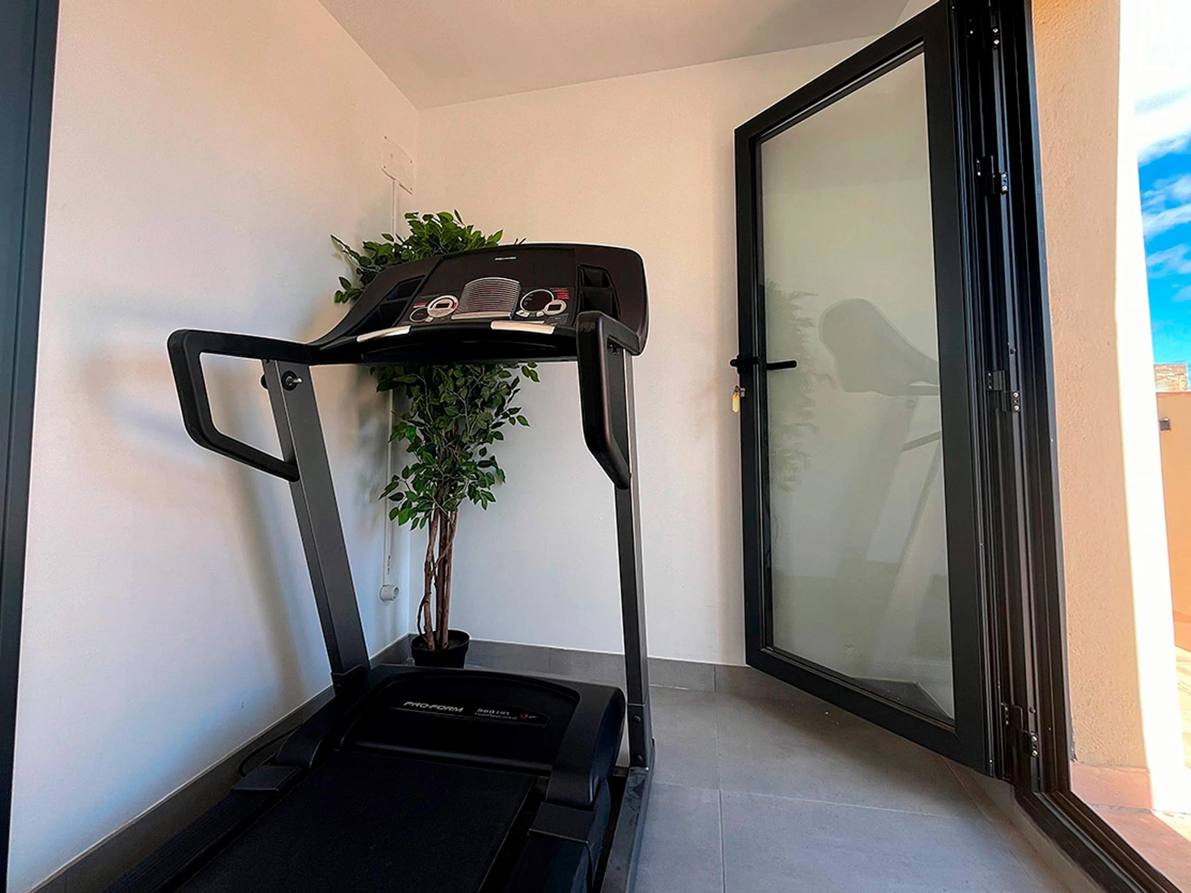As you go up the building’s stairs, you reach the apartment’s exclusive private terrace, a space designed for relaxation and enjoyment, furnished with a table, chairs, and sun loungers. Just before stepping outside, the apartment features a treadmill, ideal for guests who wish to maintain their wellness routine during their stay.