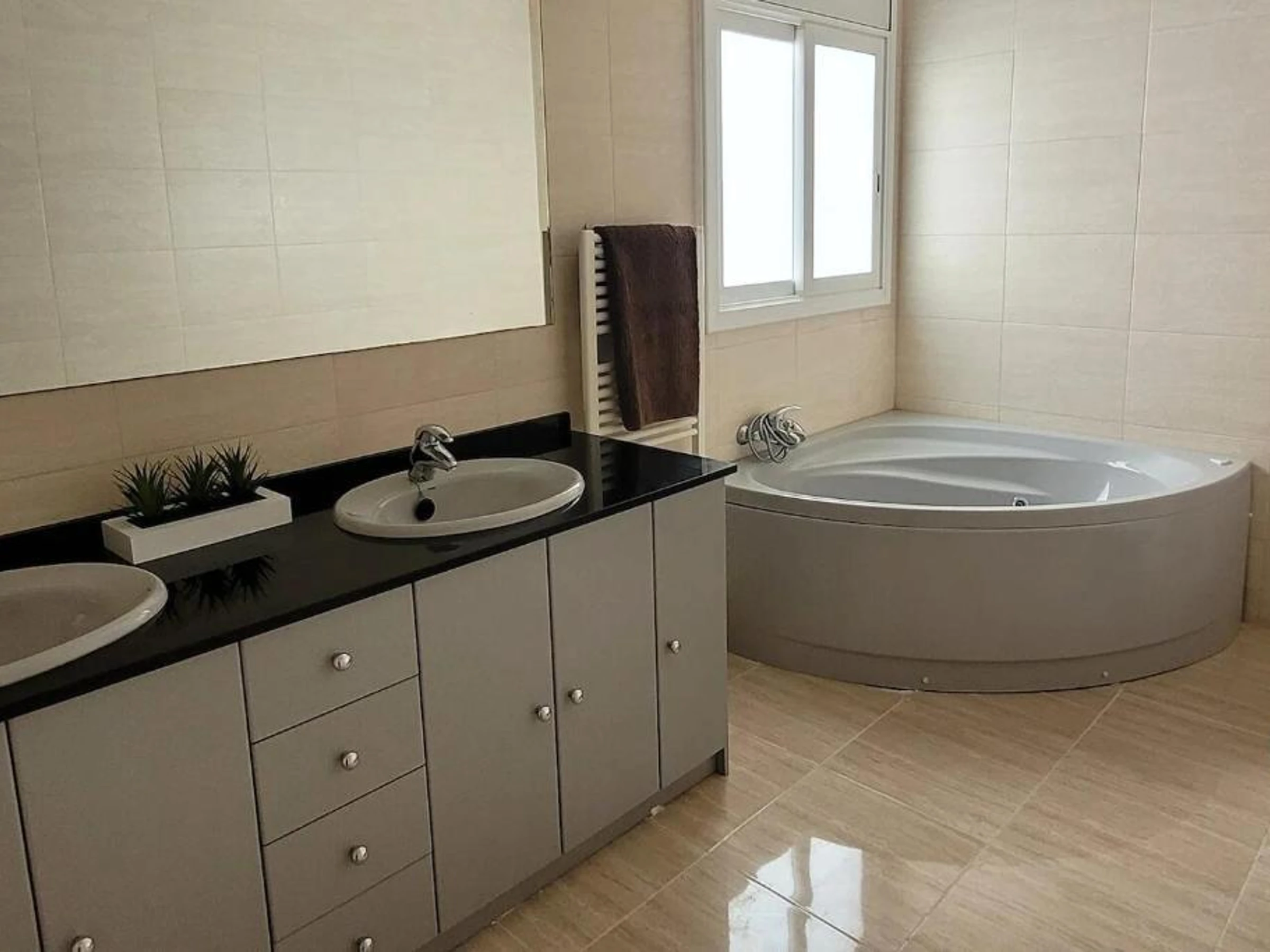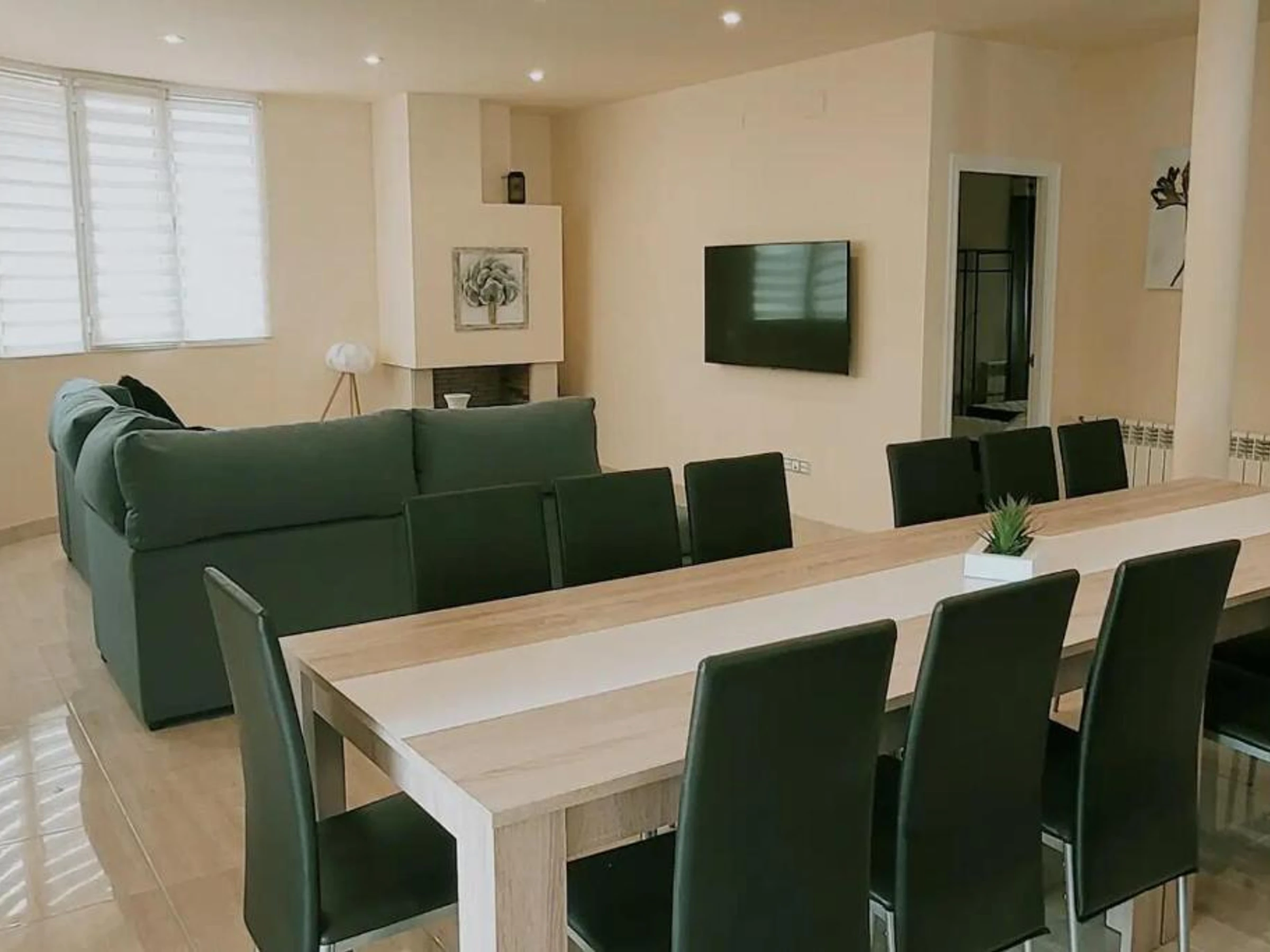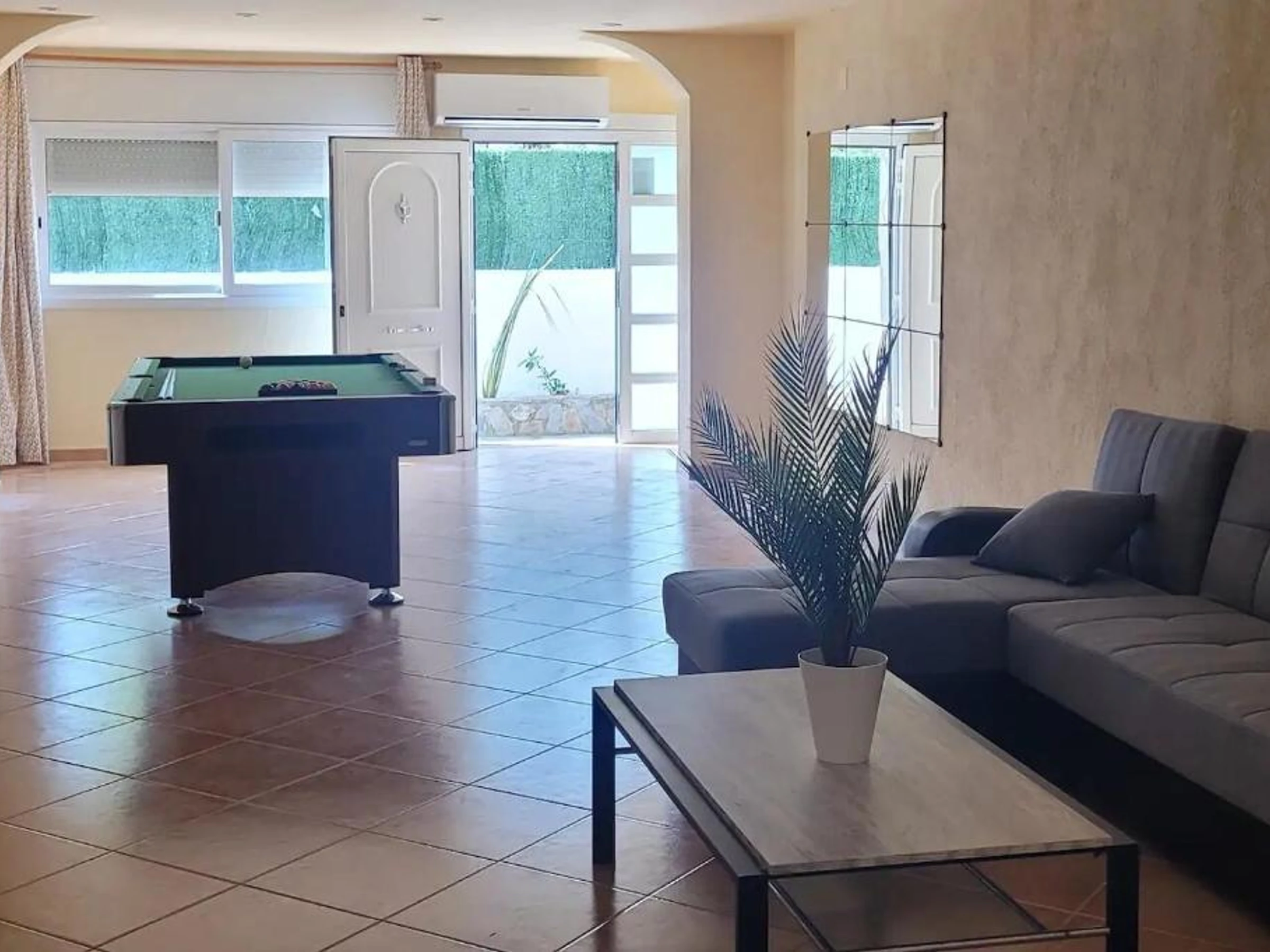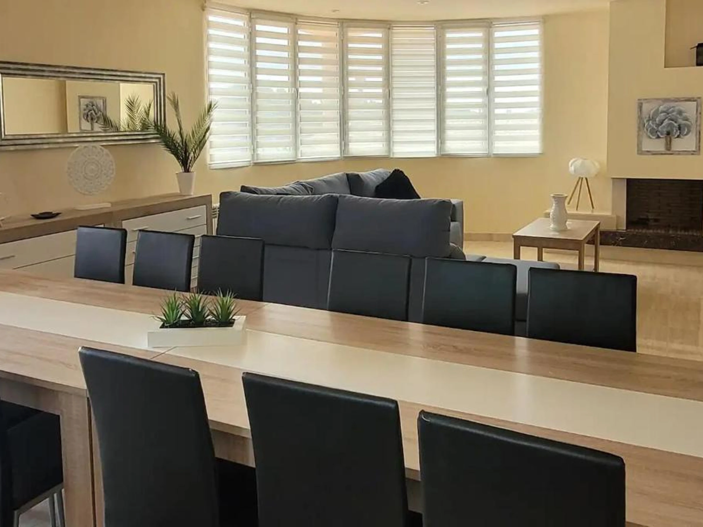 The villa is spread over 2 floors. In the dining room, there is a long table,