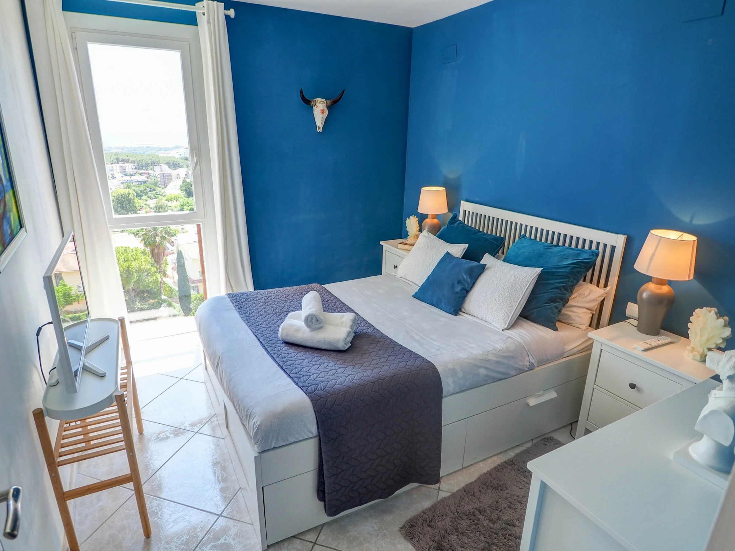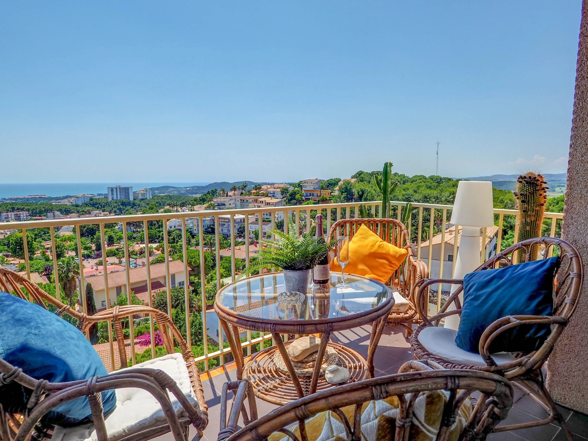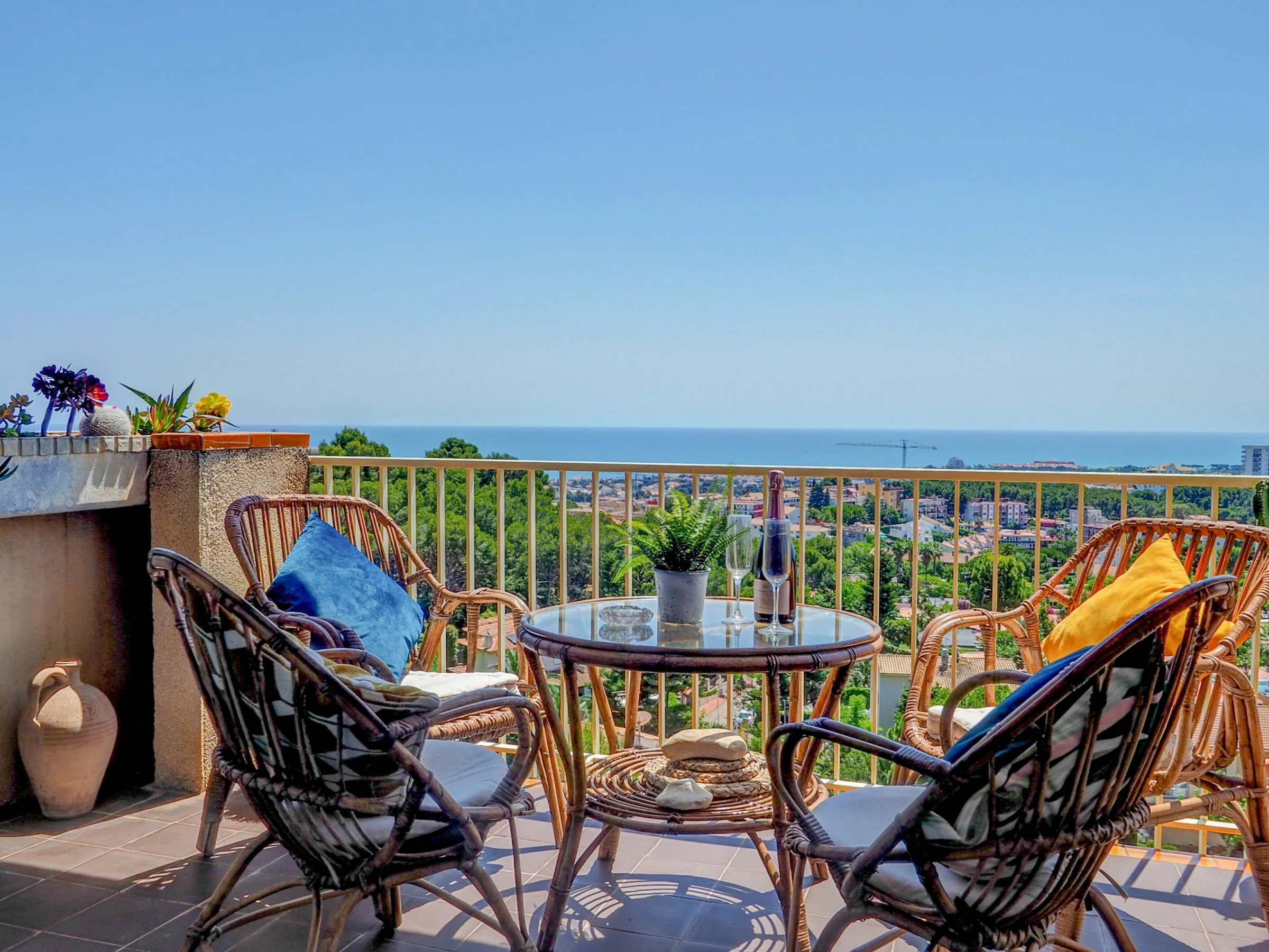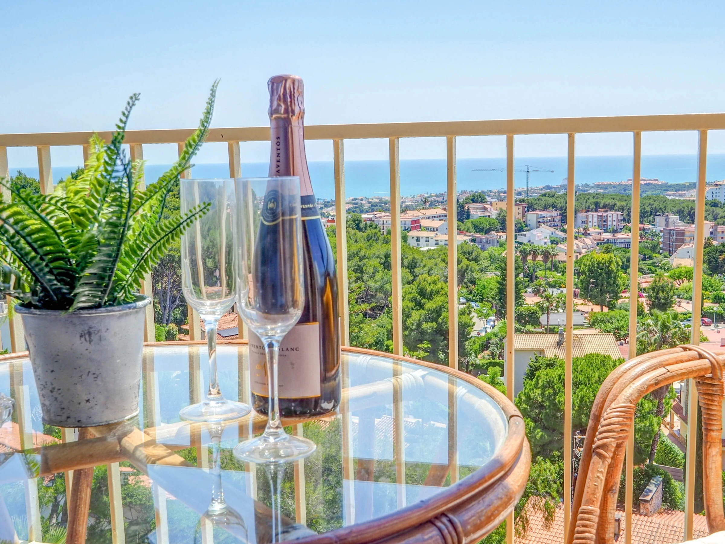Fantastic apartment with sea views, swimming pool and communal garden, just 10 minutes by car from the beaches of Sitges and 30 minutes from El Prat airport (Barcelona). This apartment, which can accommodate up to 4 people, is decorated with great care and exquisite taste, so that your stay is as comfortable as possible. Located on the fifth floor, its views of the sea and the mountains are spectacular, and make the balcony a small oasis of relaxation. The kitchen is fully equipped for everything you may need during your holiday (oven, microwave, refrigerator, washing machine, kitchenware...), the apartment is equipped with air conditioning in all rooms and WiFi. The living-dining room, decorated in blue tones, has a dining table for 4 people, a smart TV, a comfortable sofa and access to the terrace. It has two bedrooms, one with a double bed and the other with a trundle bed (2 single beds). There is also a full bathroom with a shower. The complex has a communal swimming pool, with a large garden area. You will have free parking within the complex. Also within the urbanization there are paddle tennis courts, a restaurant and a small supermarket, which can be used.