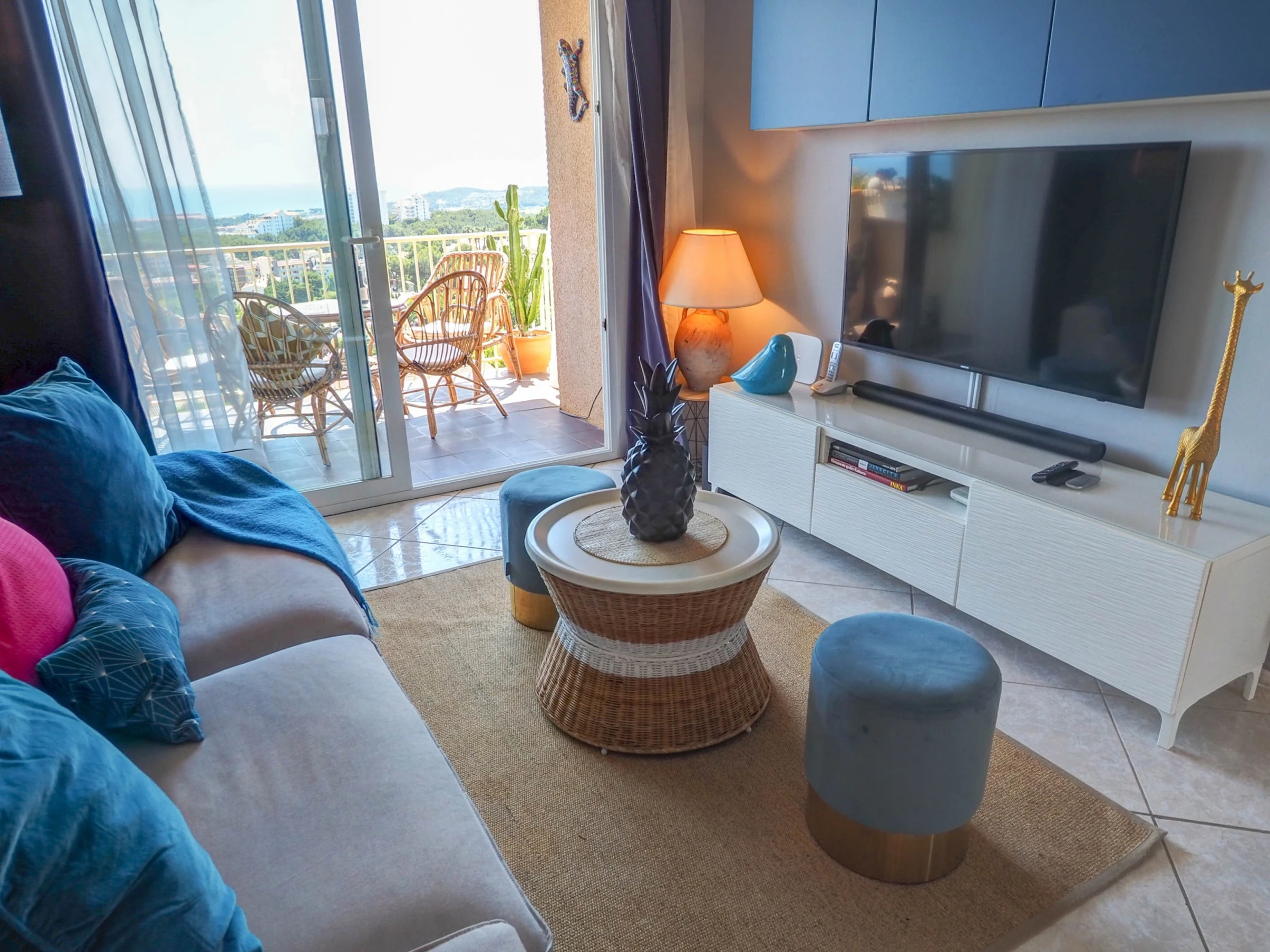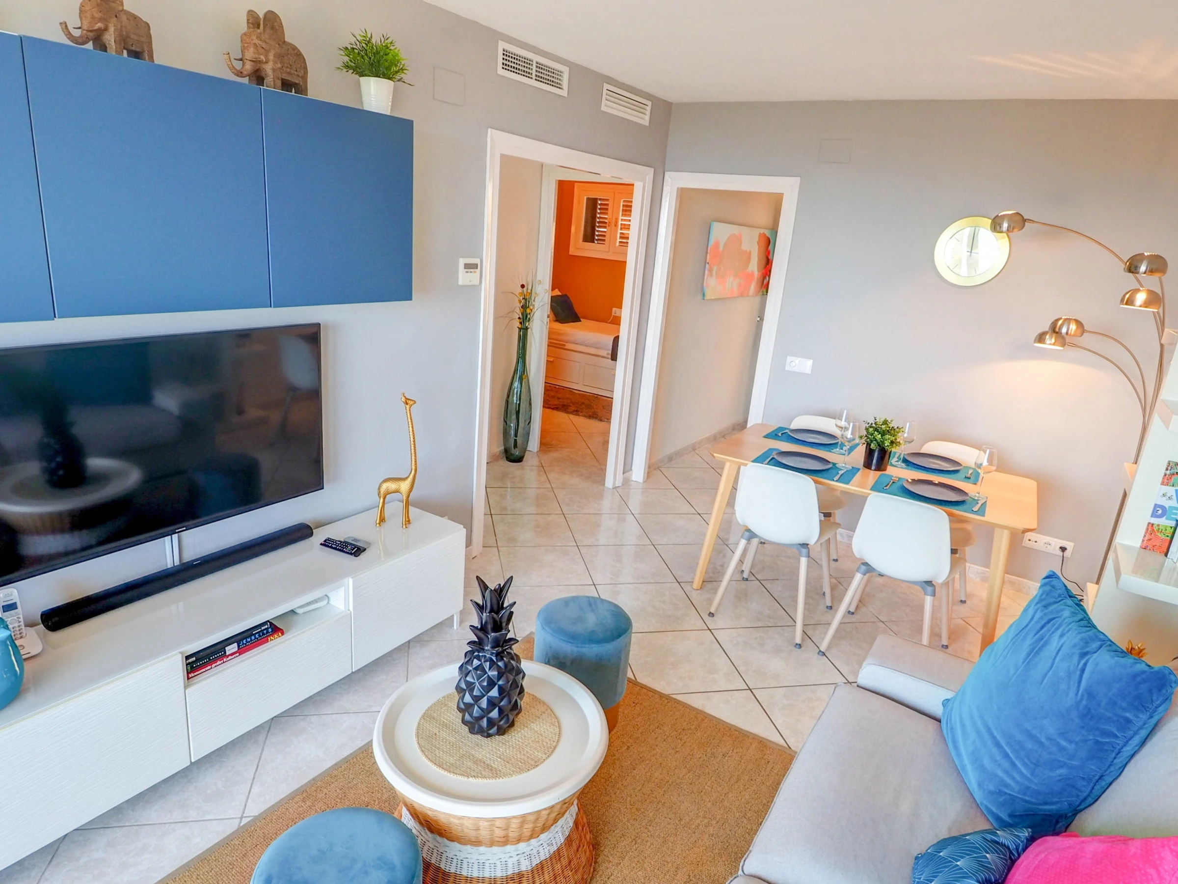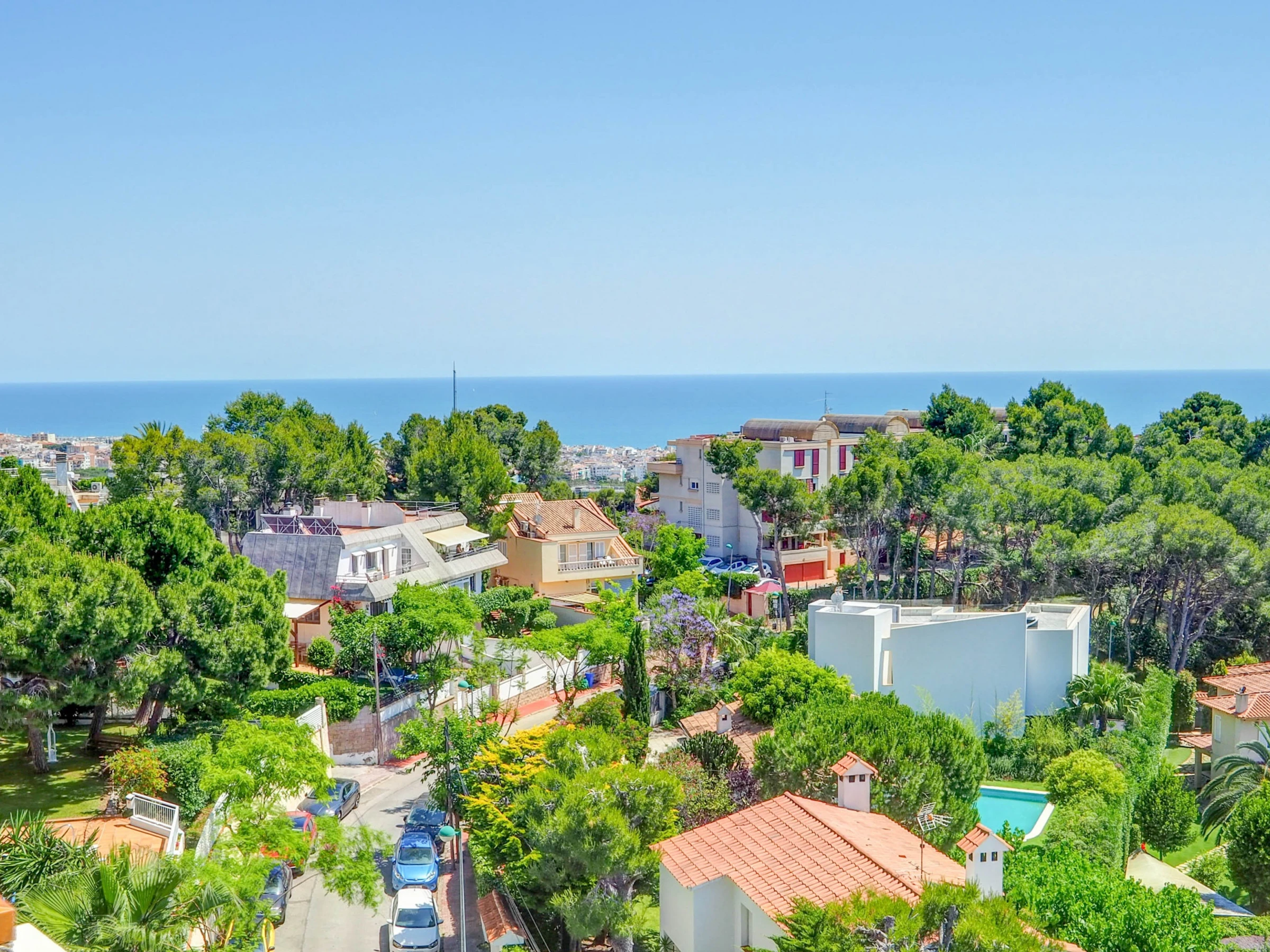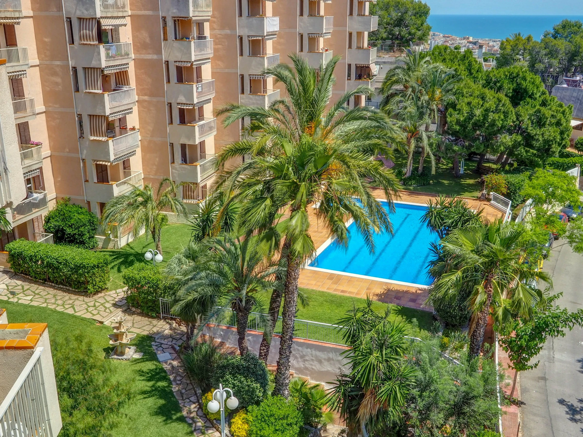 Fantastic apartment with sea views, swimming pool and communal garden, just 10 minutes by car from the beaches of Sitges and 30 minutes from El Prat airport (Barcelona). This apartment, which can accommodate up to 4 people, is decorated with great care and exquisite taste, so that your stay is as comfortable as possible. Located on the fifth floor, its views of the sea and the mountains are spectacular, and make the balcony a small oasis of relaxation. The kitchen is fully equipped for everything you may need during your holiday (oven, microwave, refrigerator, washing machine, kitchenware...), the apartment is equipped with air conditioning in all rooms and WiFi. The living-dining room, decorated in blue tones, has a dining table for 4 people, a smart TV, a comfortable sofa and access to the terrace. It has two bedrooms, one with a double bed and the other with a trundle bed (2 single beds). There is also a full bathroom with a shower. The complex has a communal swimming pool, with a large garden area. You will have free parking within the complex. Also within the urbanization there are paddle tennis courts, a restaurant and a small supermarket, which can be used.