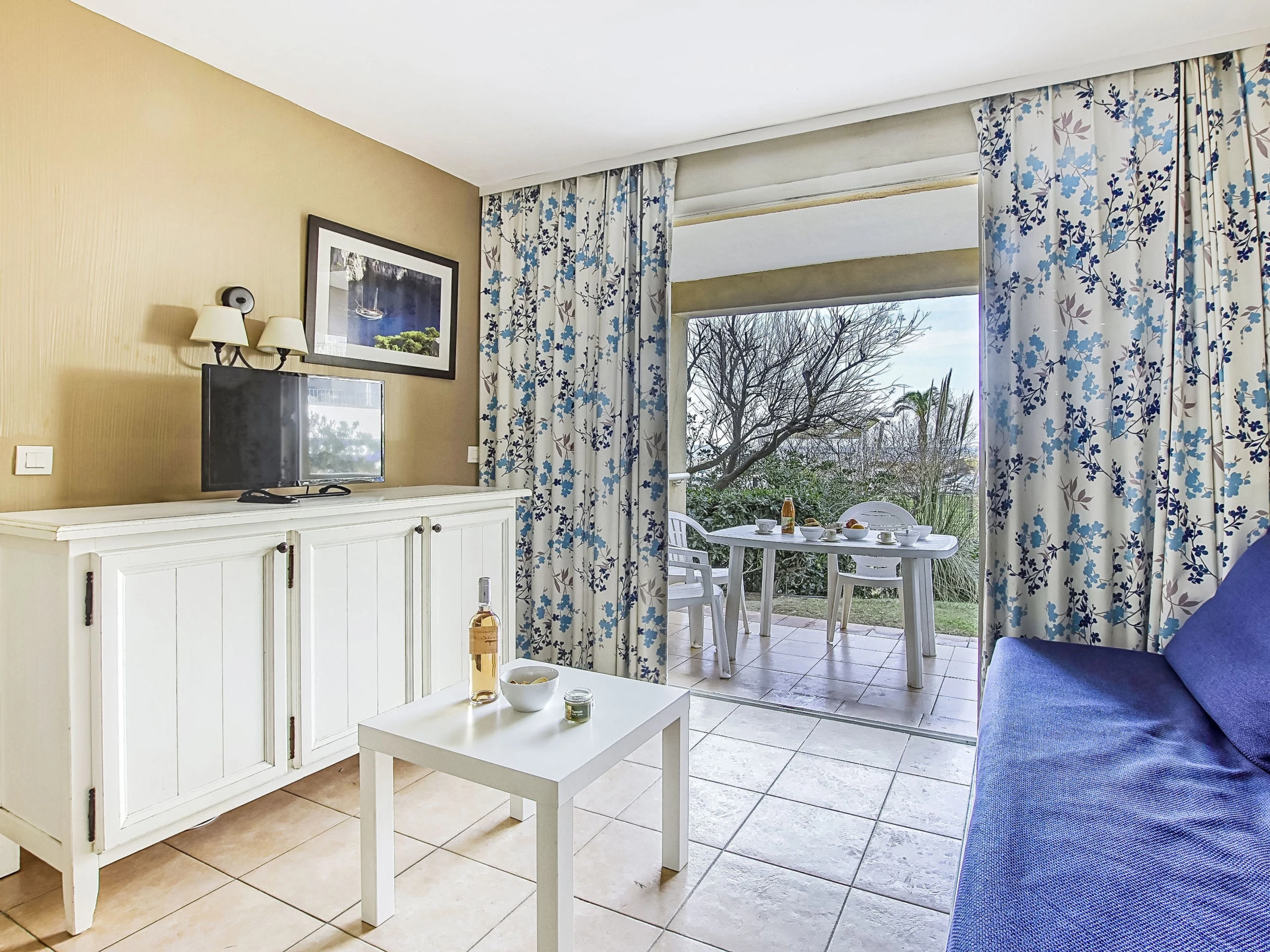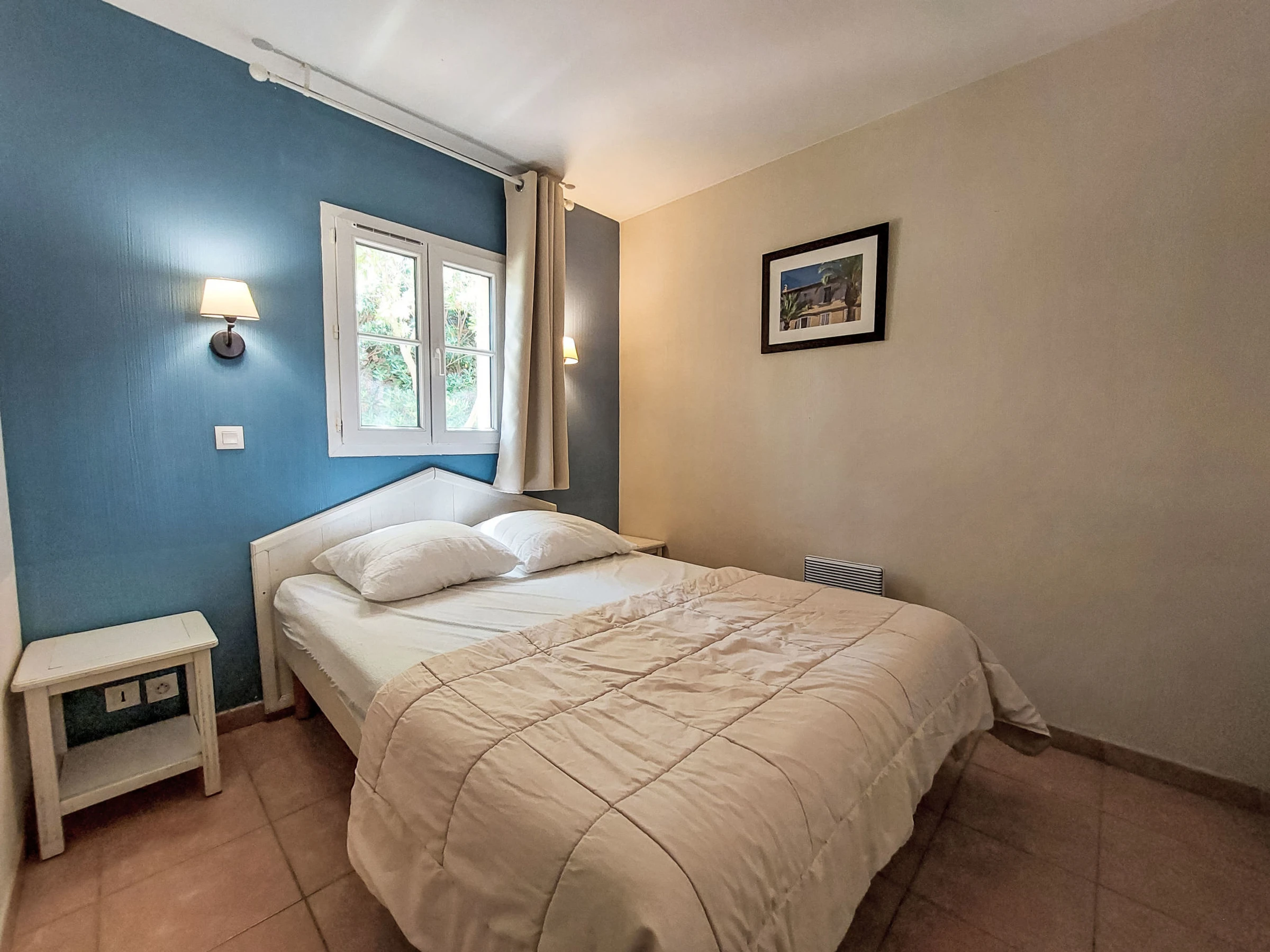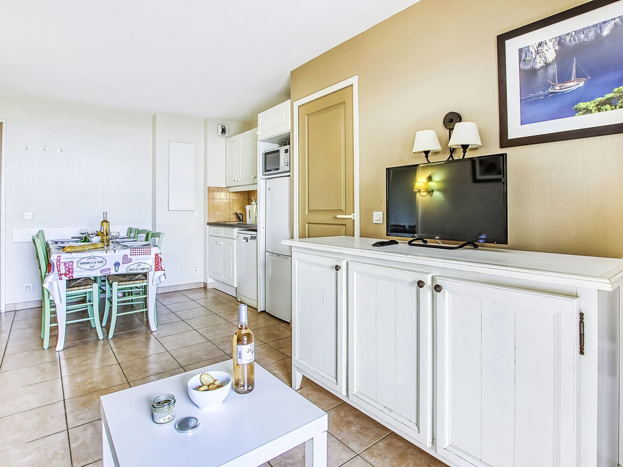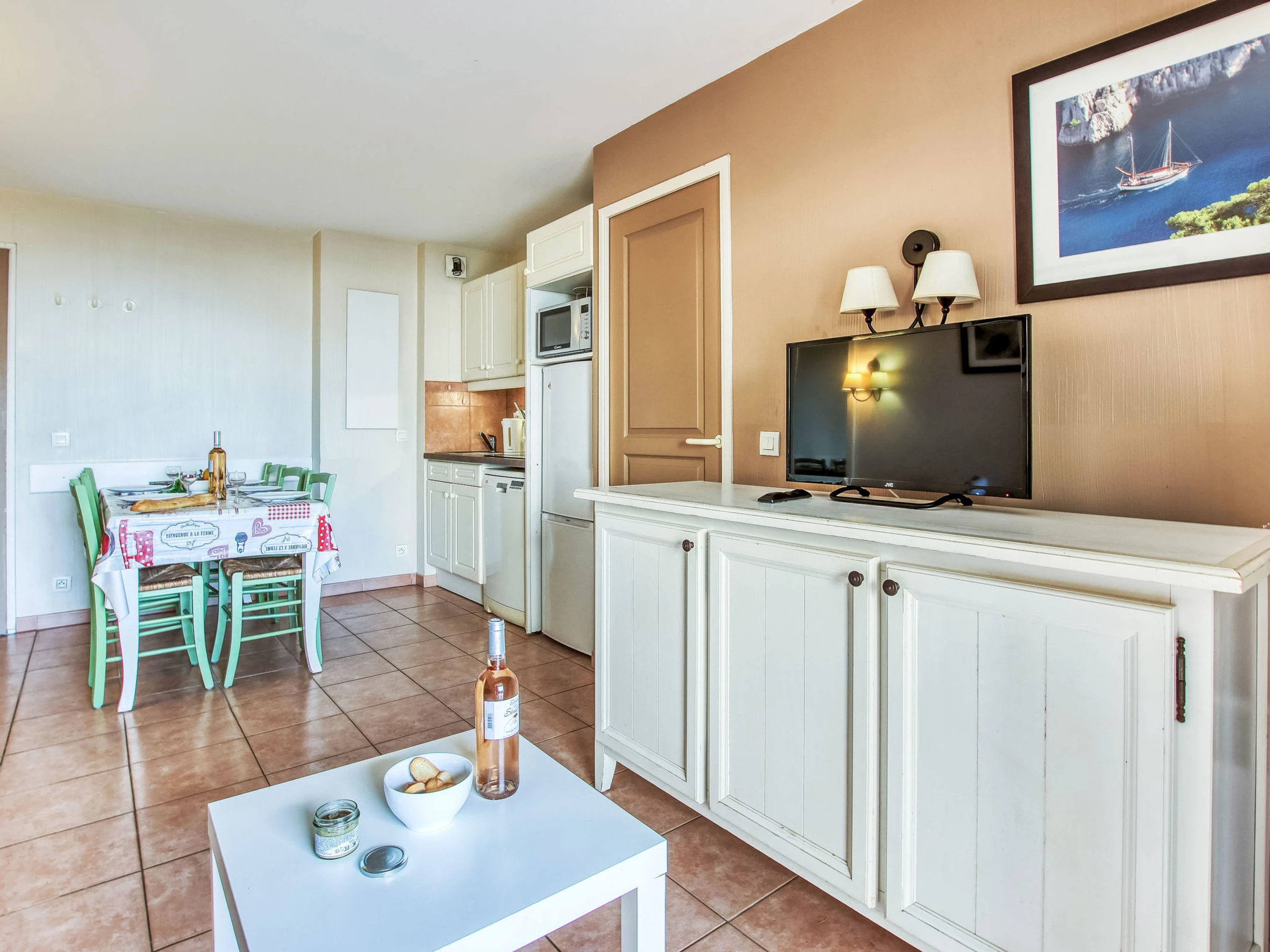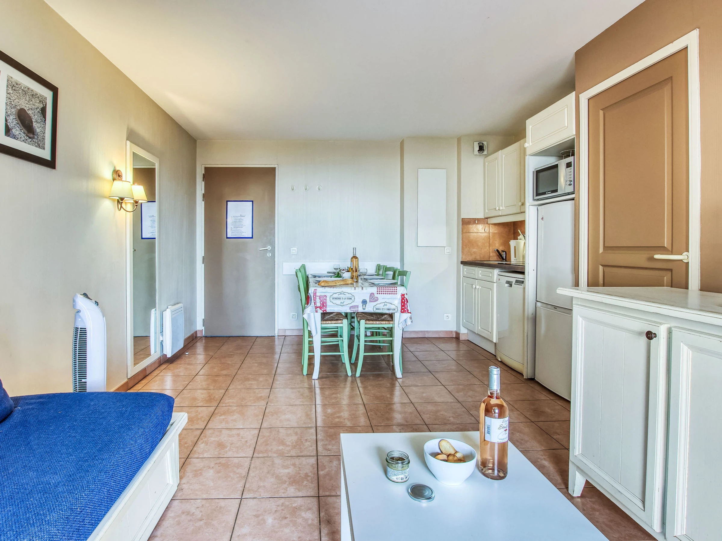 3-room apartment 45 m2, on the ground floor. Practical and beautiful furnishings: living/dining room with 1 bed (80 cm, length 190 cm), TV (flat screen). Exit to the terrace. Sleeping alcove with 1 x 2 bunk beds (80 cm, length 190 cm). 1 room with 1 french bed (140 cm, length 190 cm). Kitchenette (dishwasher, 4 ceramic glass hob hotplates, toaster, kettle, microwave, freezer, electric coffee machine). Bathroom, shower/WC. Electric heating. Terrace 7 m2, roofed, west facing position, small patio 3 m2, west facing position. Terrace furniture. Distant view of the sea. Facilities: Internet (WiFi, extra). Parking space n 401 (Niveau 1) (roofed), height 190 cm, width 230 cm. Please note: maximum 1 pet/ dog allowed. TV only FR. Smoke alarm. The garden is not fenced. Instead of an enclosed bedroom, some sleeping areas are located in an open-plan area (gallery, alcove, etc.).