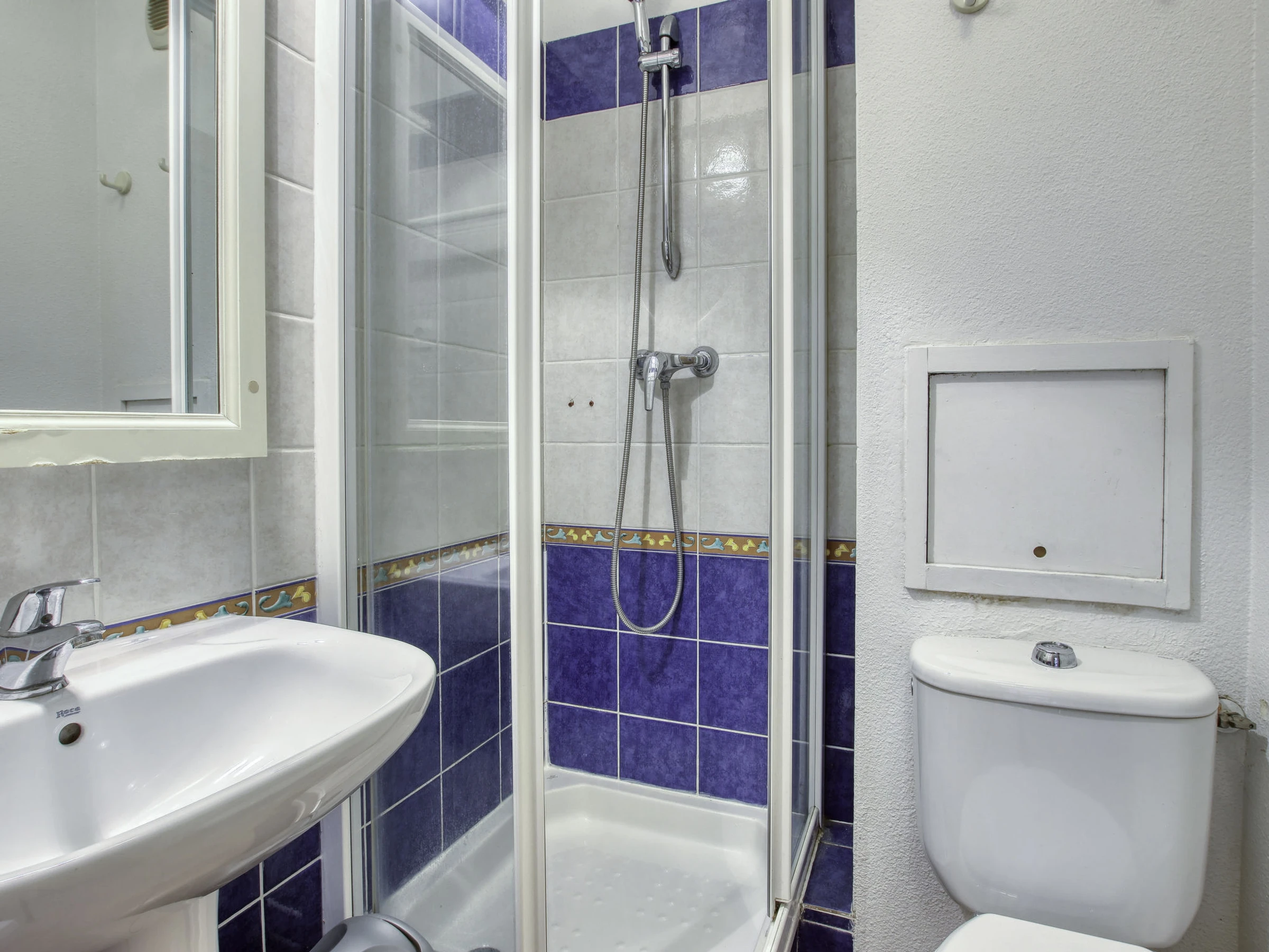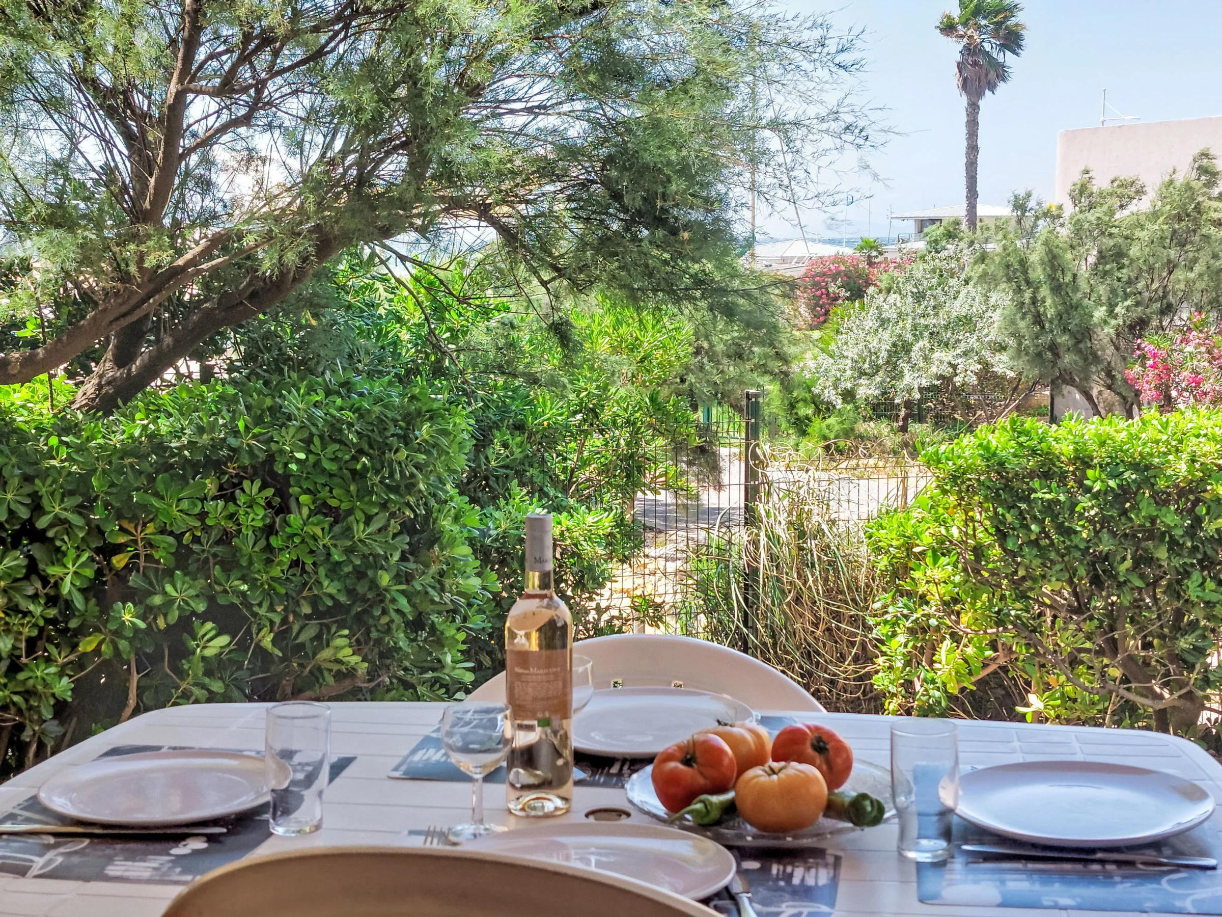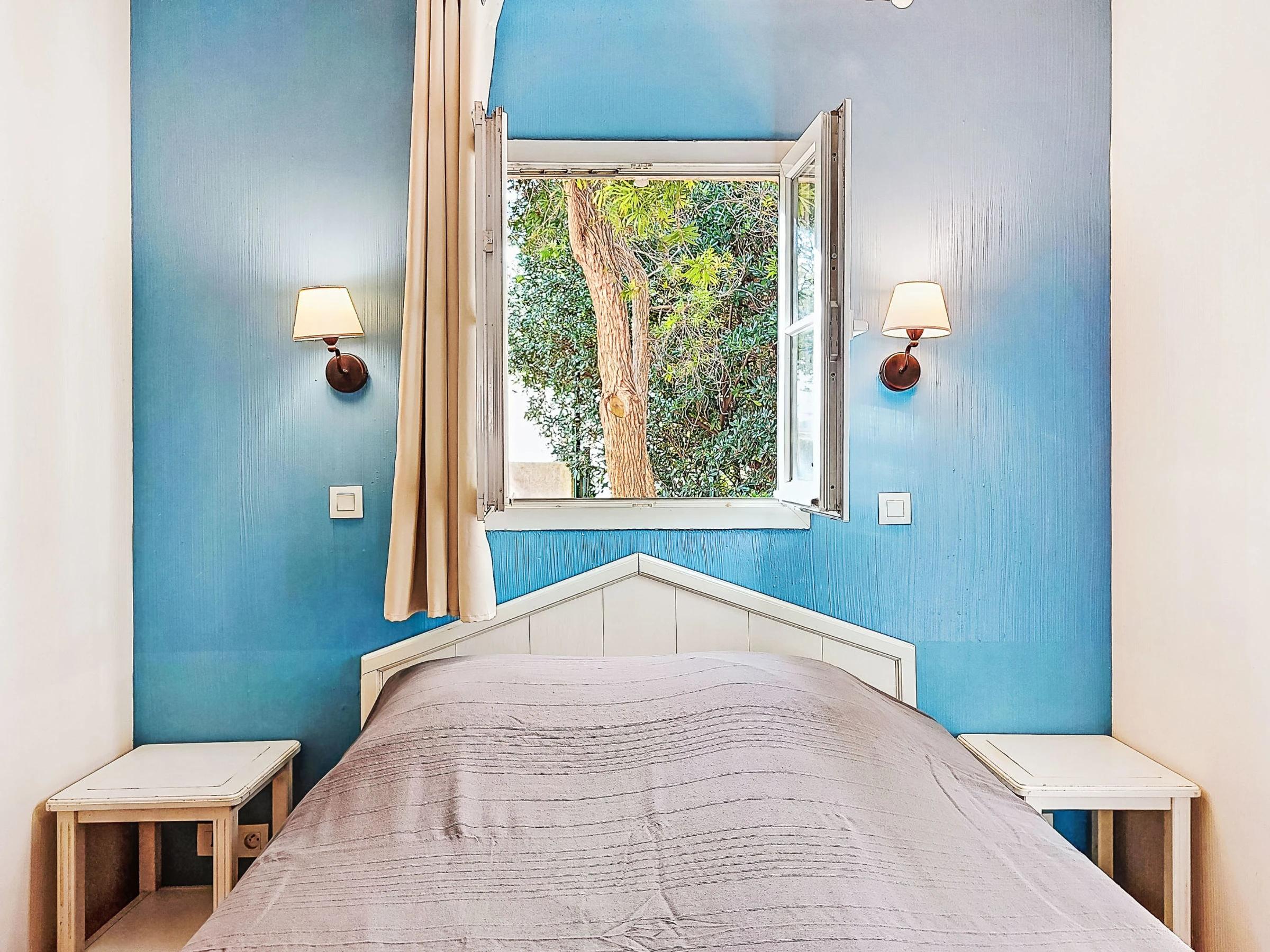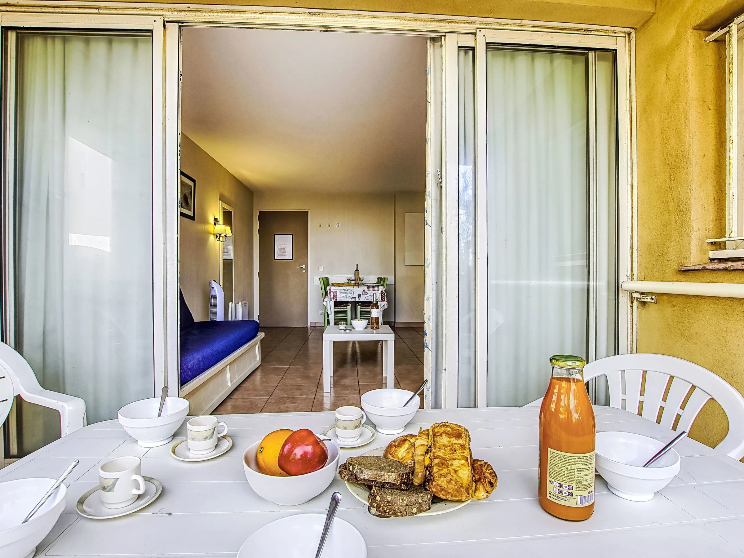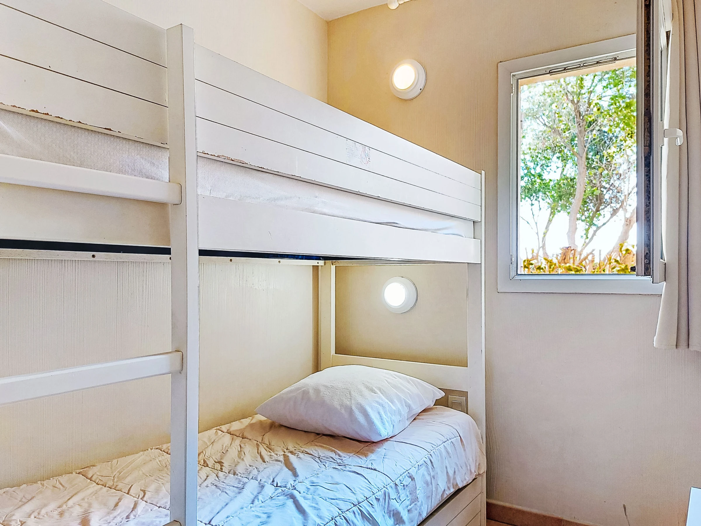 3-room apartment 45 m2, on the ground floor. Practical and beautiful furnishings: living/dining room with 1 bed (80 cm, length 190 cm), TV (flat screen). Exit to the terrace. Sleeping alcove with 1 x 2 bunk beds (80 cm, length 190 cm). 1 room with 1 french bed (140 cm, length 190 cm). Kitchenette (dishwasher, 4 ceramic glass hob hotplates, toaster, kettle, microwave, freezer, electric coffee machine). Bathroom, shower/WC. Electric heating. Terrace 7 m2, roofed, west facing position, small patio 3 m2, west facing position. Terrace furniture. Distant view of the sea. Facilities: Internet (WiFi, extra). Parking space n 401 (Niveau 1) (roofed), height 190 cm, width 230 cm. Please note: maximum 1 pet/ dog allowed. TV only FR. Smoke alarm. The garden is not fenced. Instead of an enclosed bedroom, some sleeping areas are located in an open-plan area (gallery, alcove, etc.).
