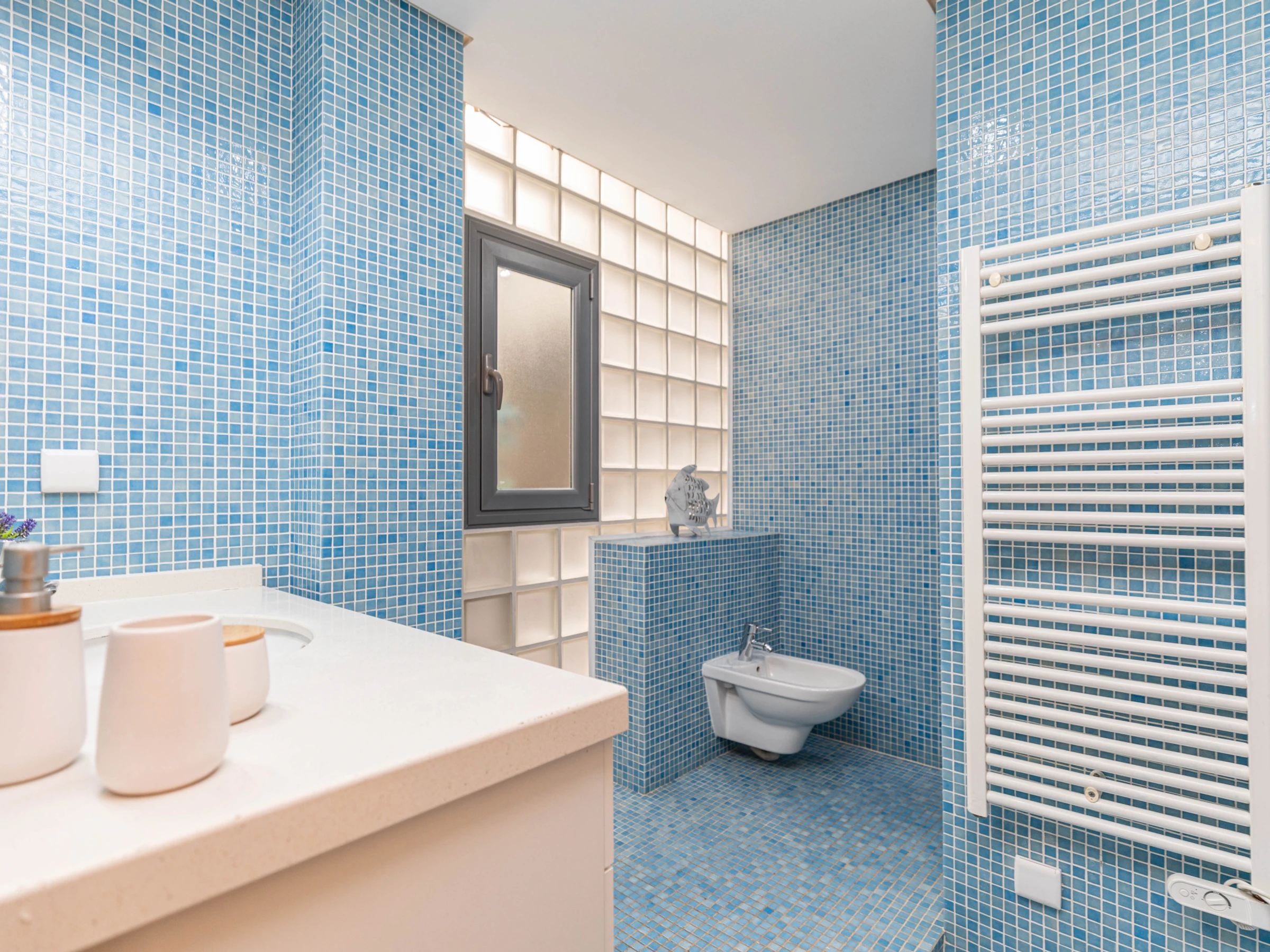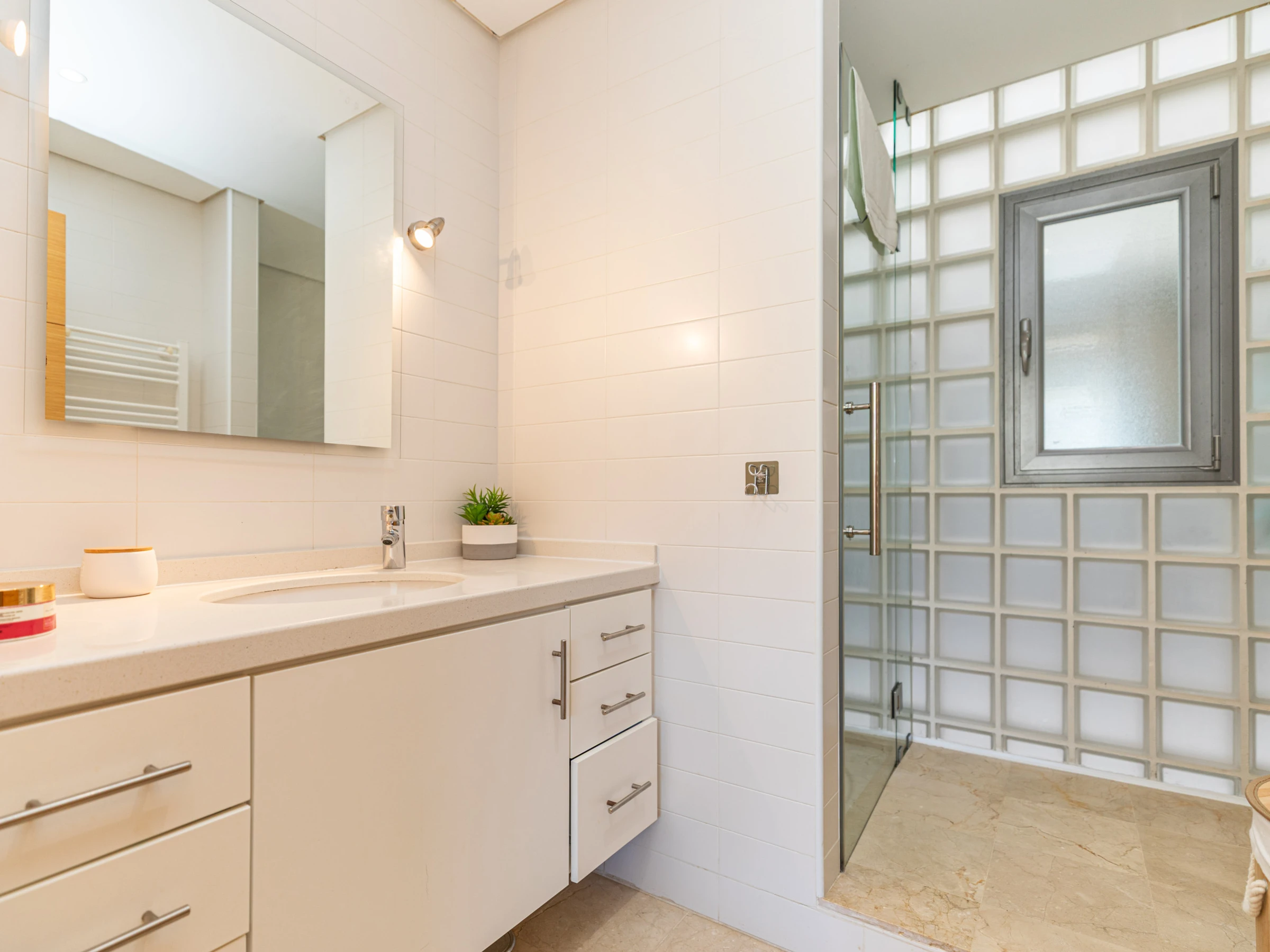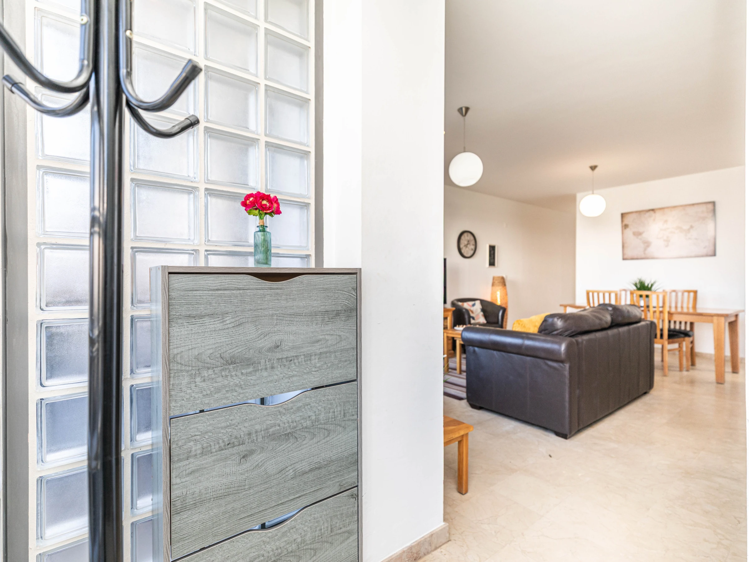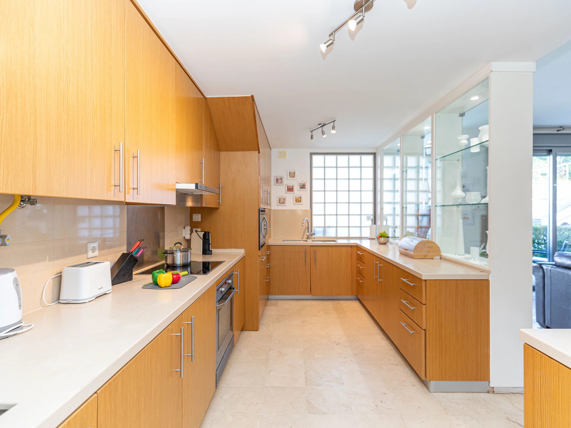 Apartment Polka offers a cosy and welcoming interior, perfect for a comfortable stay. The single-level layout flows effortlessly from front to back, creating an open and inviting atmosphere. Guests enter into a lounge and dining area with plush seating and elegant oak furnishings, including a rectangular dining table and chairs. A glass-shelved partition separates the lounge from a fully equipped kitchen, complete with utensils and appliances to make cooking at home easy. From the kitchen, a door opens to a private internal atrium furnished with a table and chairs, perfect for enjoying a quiet breakfast or a relaxed evening meal. The apartment has two bedrooms: a master double room with a private shower room and a twin bedroom that shares a bathroom with a bathtub and overhead shower.