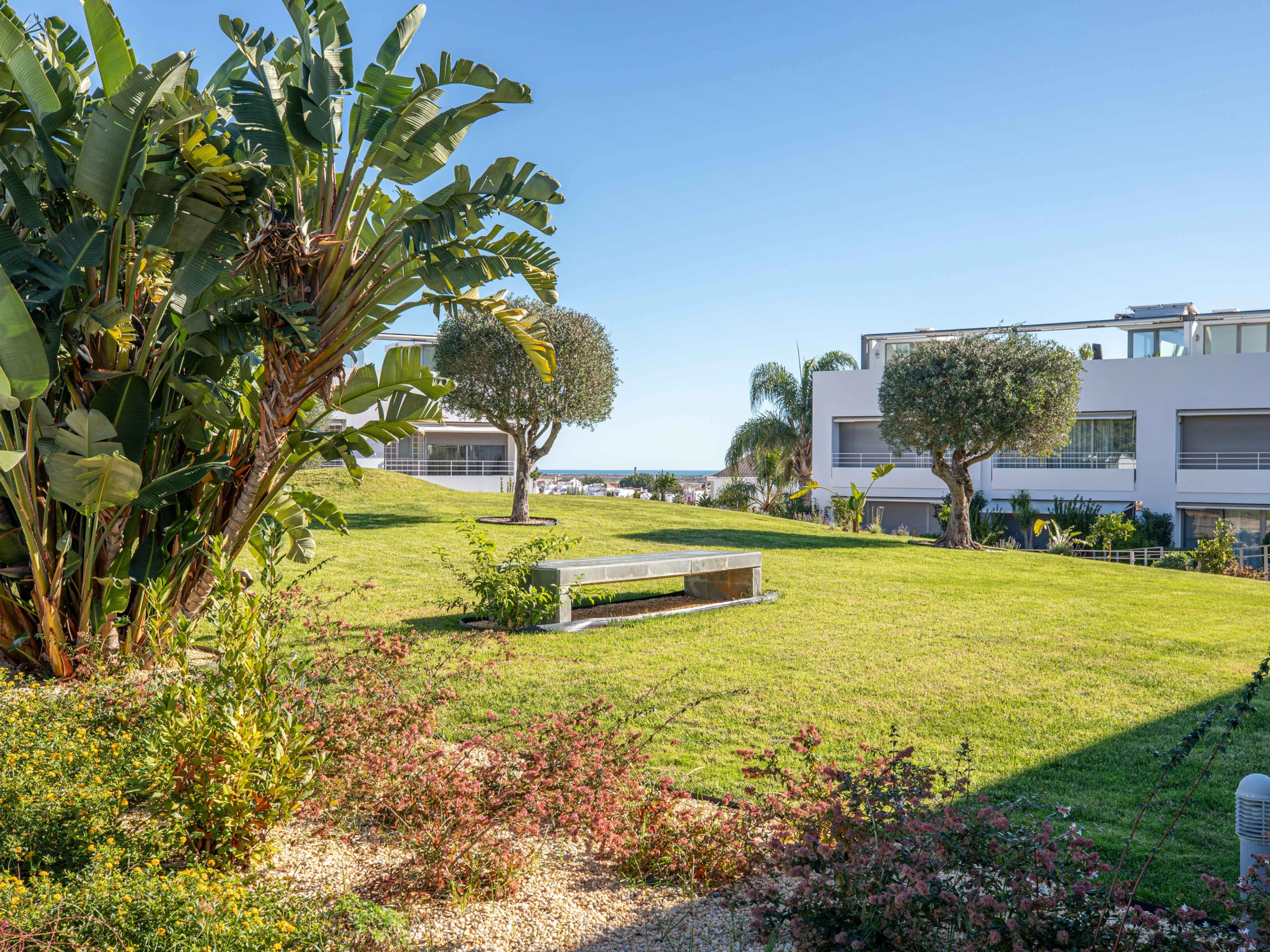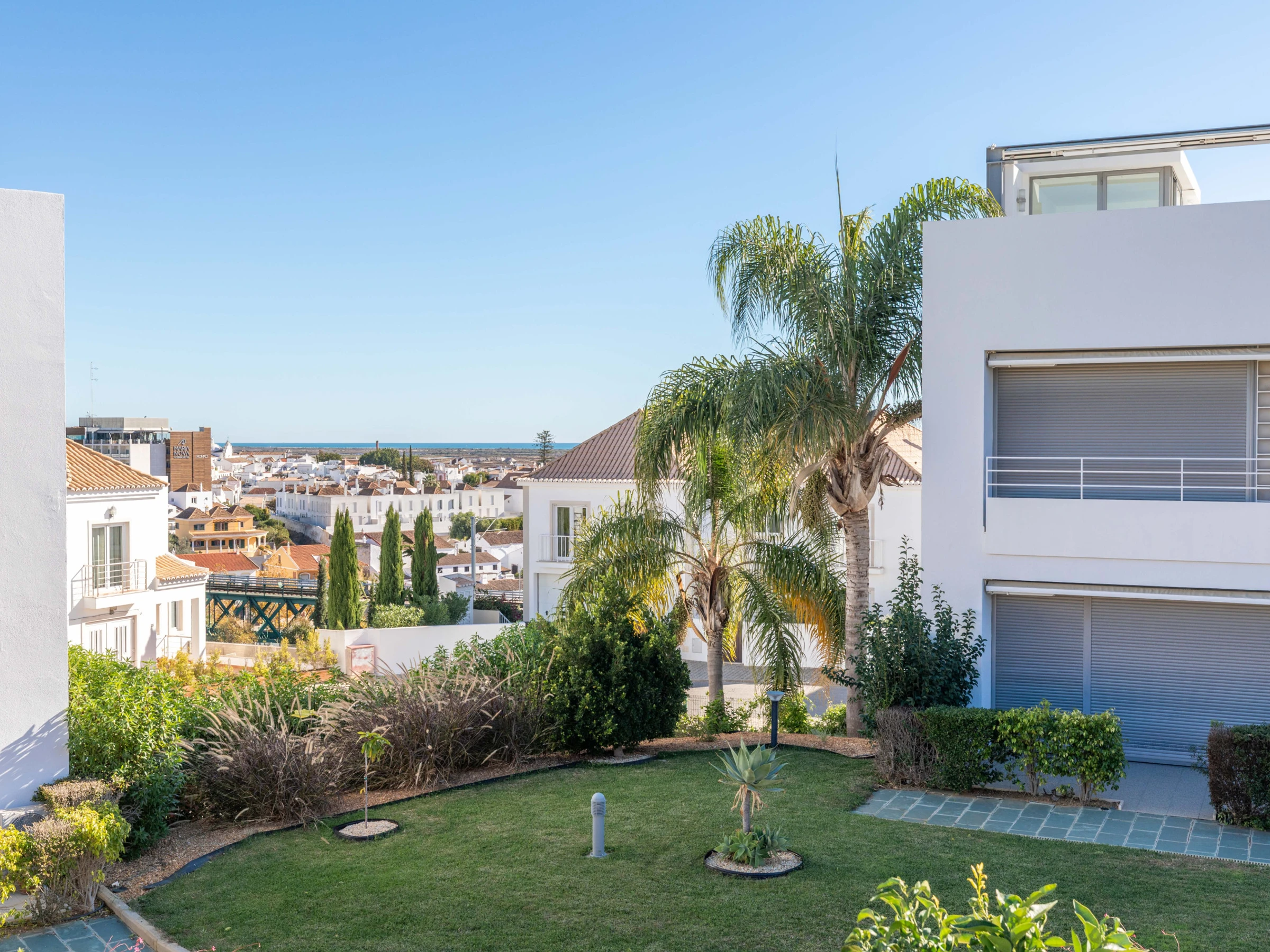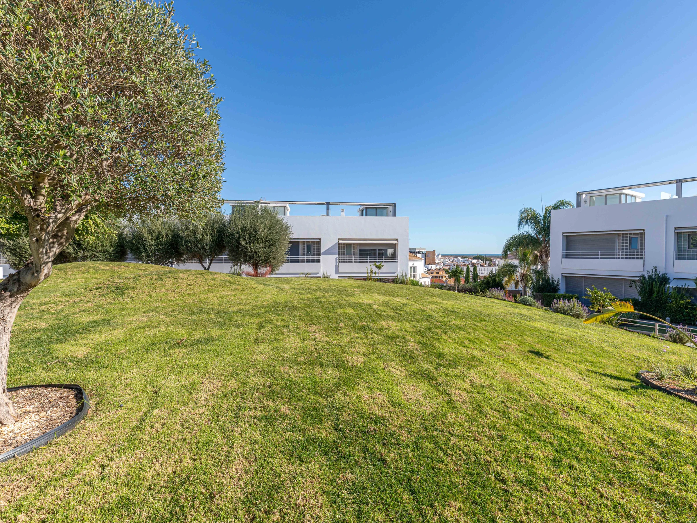Outside, the apartment features a shaded patio with a table and chairs, ideal for sundowners while enjoying views of the beautifully maintained gardens. The gardens are surrounded by wooden decking, lush grass, mature shrubs, and olive trees, all embracing a sparkling blue swimming pool. The pool area includes a main pool for adults and a shallow section for young children, making it perfect for family fun. The condo is securely gated, offering a safe environment for children, and the apartment is just a few steps from the pool. The elevated hillside location provides stunning views over the town of Tavira and out to the ocean.