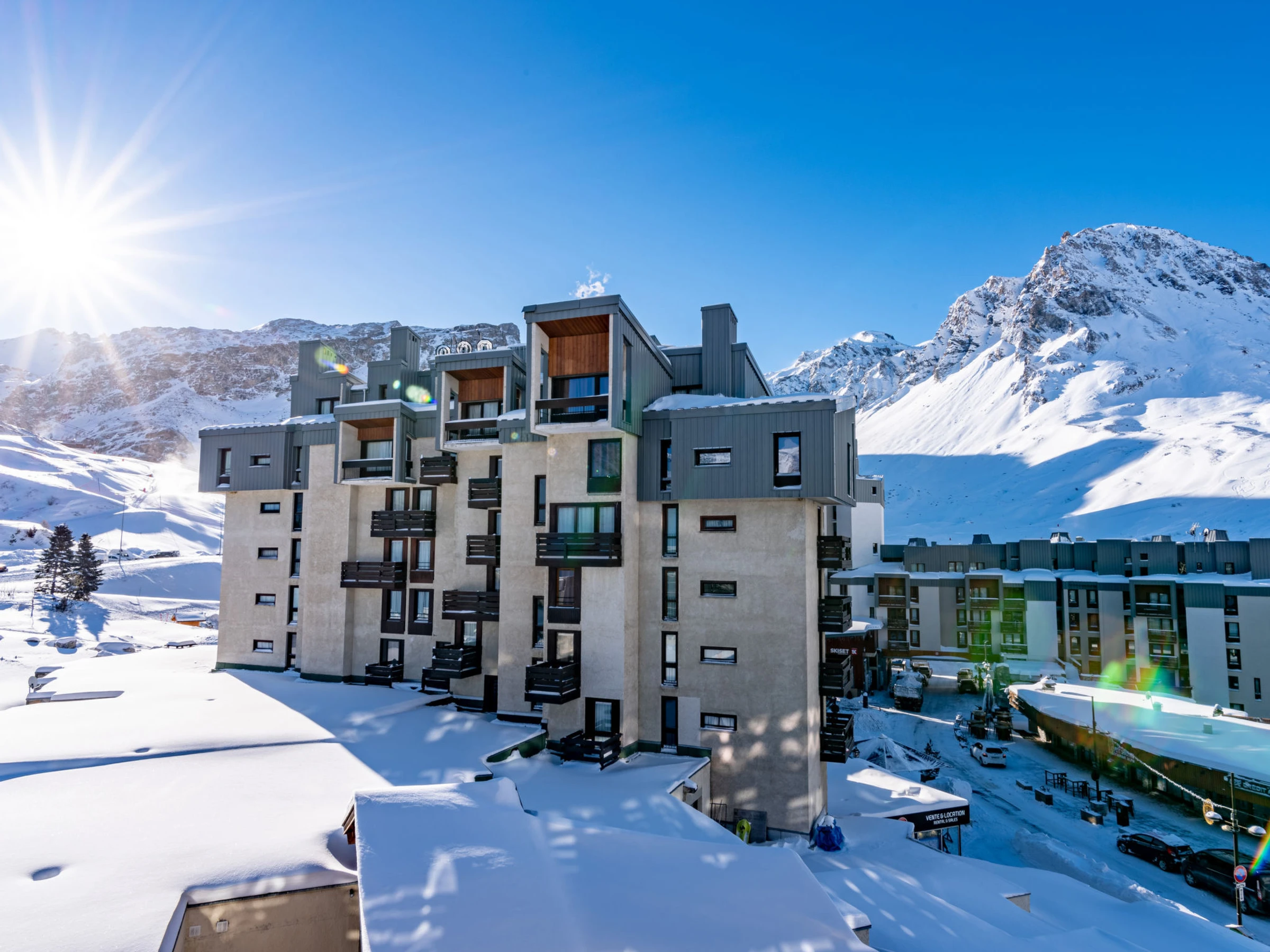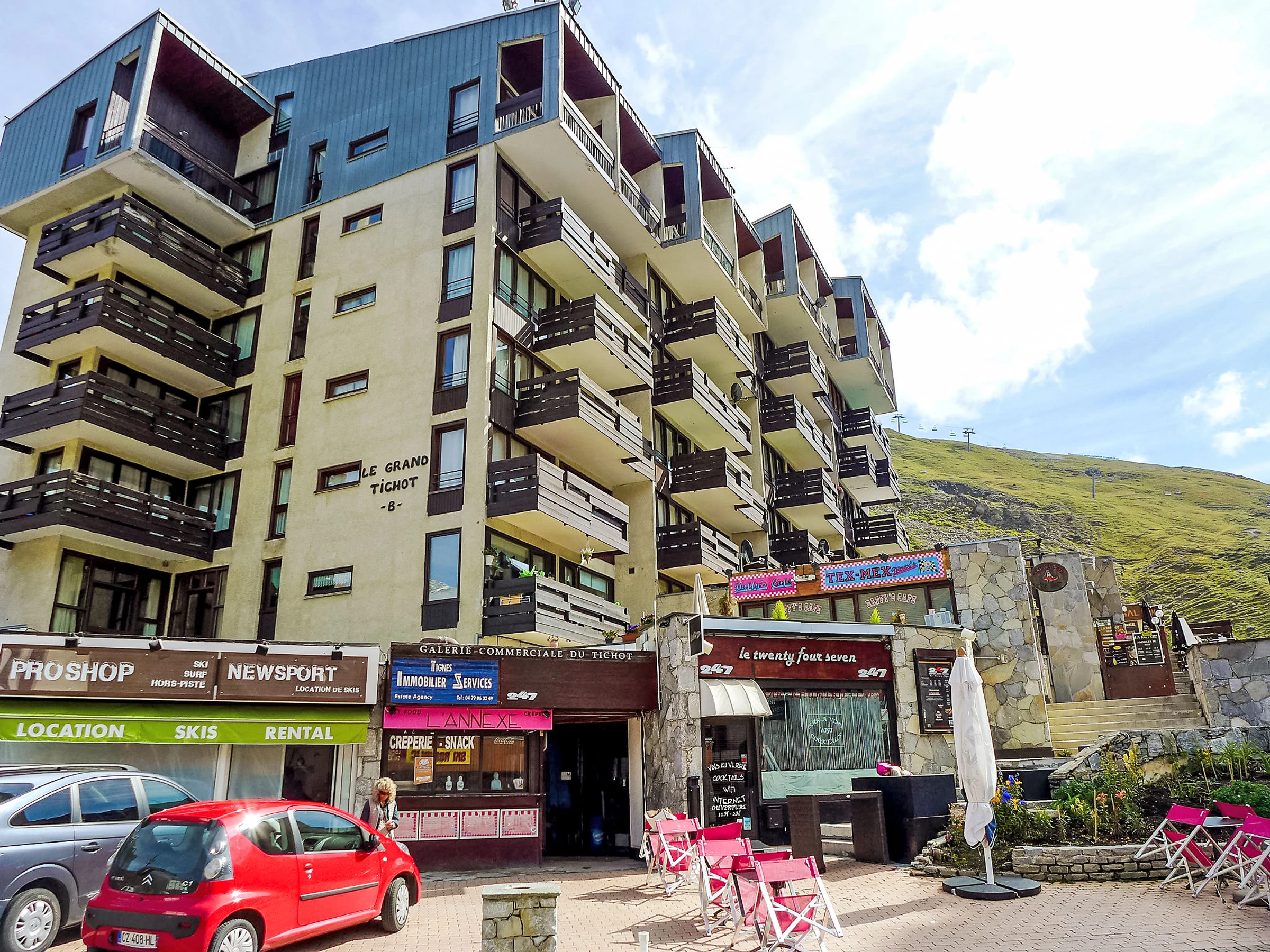 Tignes Val Claret: In the shopping centre. Residence "Le Grand Tichot A et B (Val Claret)". In a central, busy position, 100 m from the skiing area. In the complex: lift, central heating system. Shop, supermarket, shopping centre, restaurant, bakery, café 10 m, bus stop 300 m, indoor swimming pool 2 km. Sports centre 2 km, skisport facilities 100 m, slopes 150 m, ski rental 10 m, ski school, sled run 150 m. Well-known ski regions can easily be reached: Tignes & Val d'Isère 100 m. Groups of teenagers on request only. Please note: Additional accommodations can be booked.