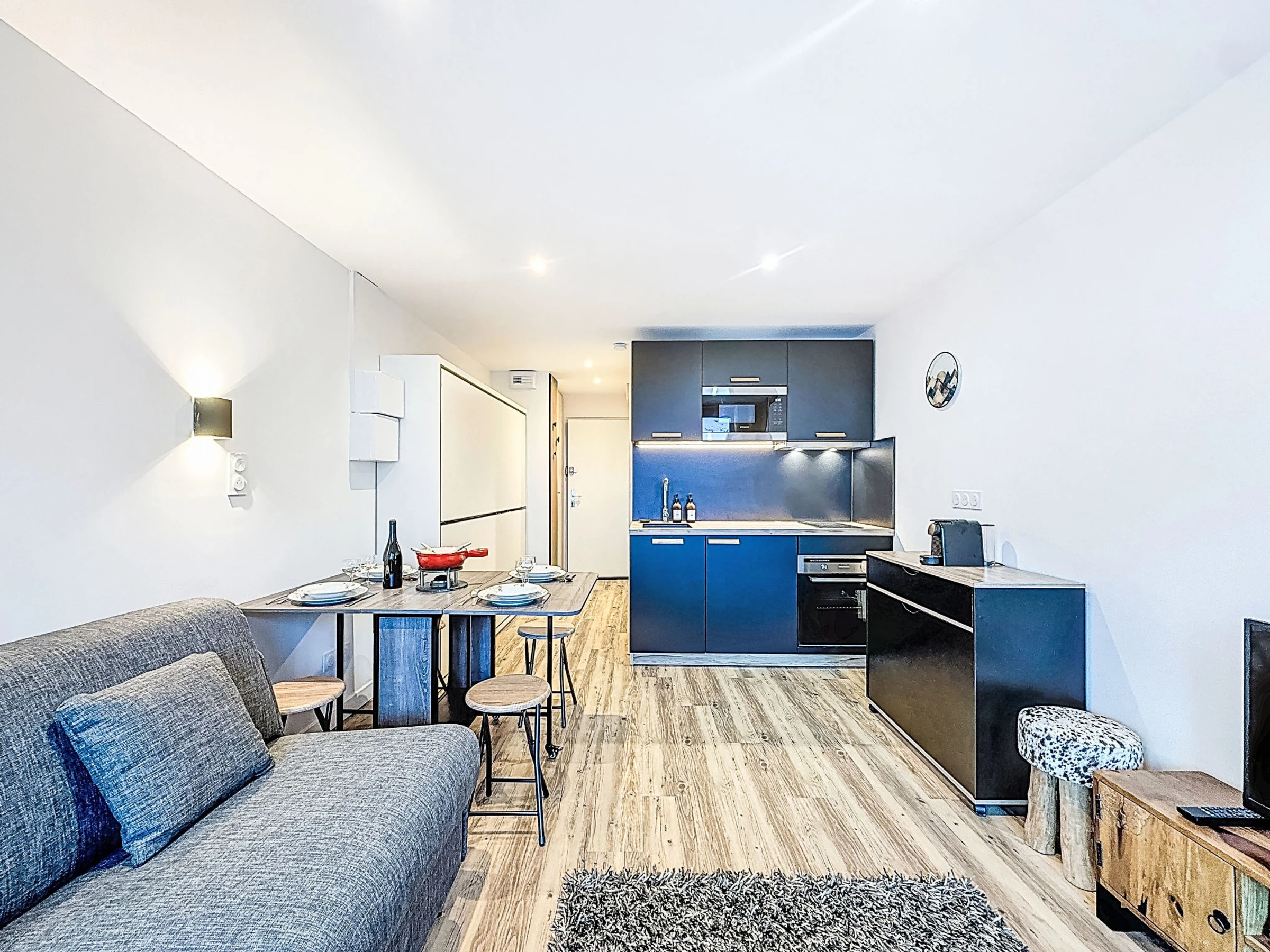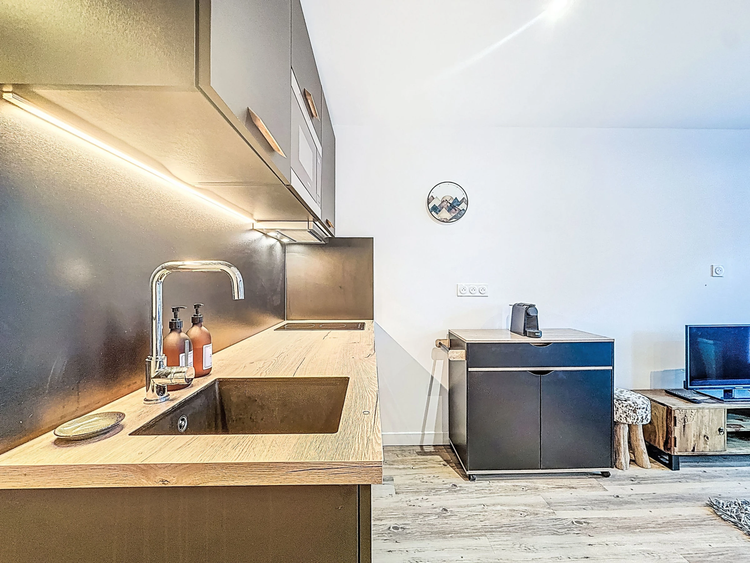 "Curling B3 51", 1-room studio 22 m2, south-west facing position. Fully renovated in 2025, comfortable furnishings: entrance hall with 1 x 2 bunk beds (80 cm, length 190 cm). Living/dining room with 1 double sofabed (1 x 140 cm, length 190 cm), TV and heating stove. Exit to the balcony, south facing position and west facing position. Open kitchen (2 hot plates, oven, toaster, kettle, electric coffee machine). Bath/WC. Very beautiful view of the mountains. Facilities: Internet (WiFi, extra). Please note: smoke alarm. Instead of an enclosed bedroom, some sleeping areas are located in an open-plan area (gallery, alcove, etc.). Offer by a private individual according to Art. 155, IV of CGI.