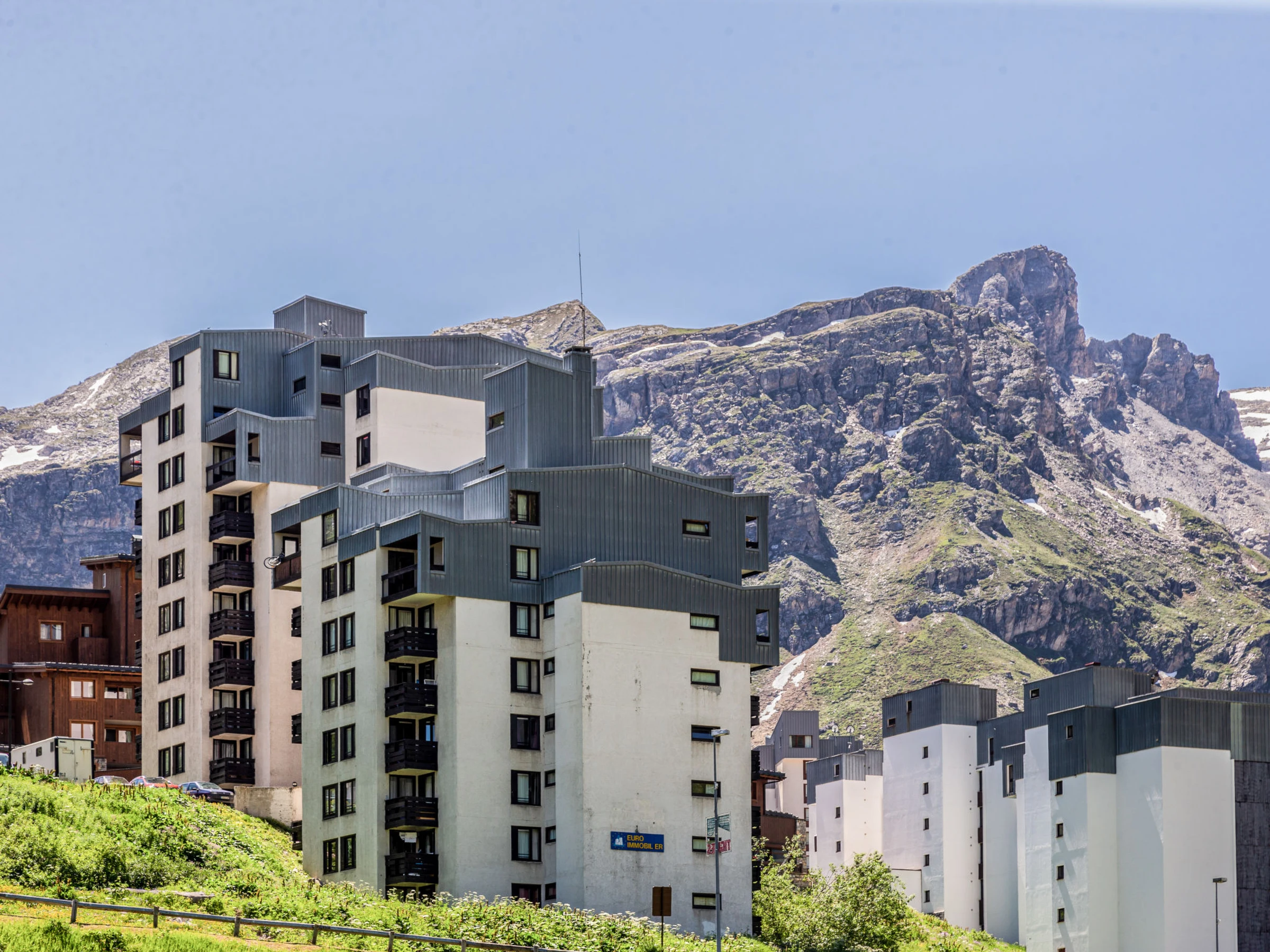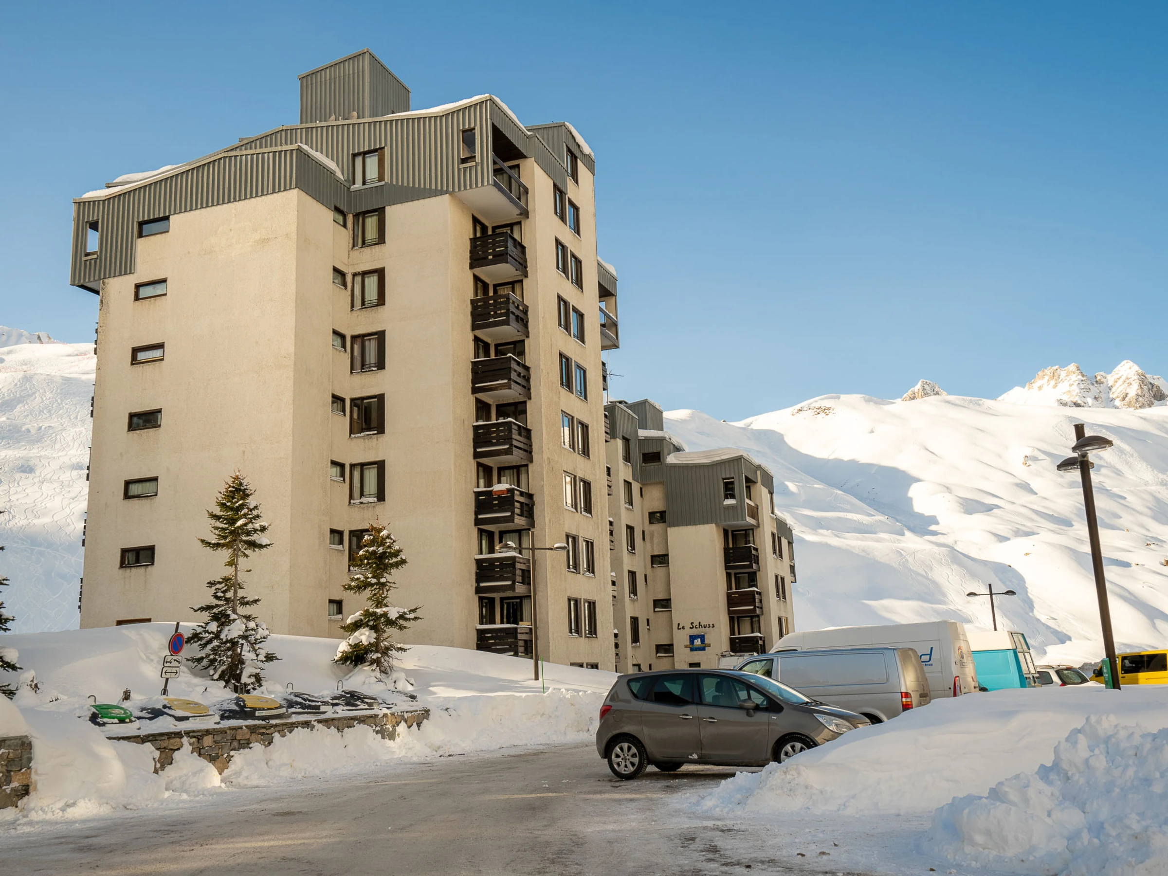 Tignes Val Claret: Residence "Le Schuss (Val Claret)", 12 storeys. In the complex: lift, storage room for skis, central heating system. Public car park at 100 m, extra. Shop, grocery 100 m, supermarket 150 m, restaurant 100 m, bakery 50 m, 2 minute walk to the centre, bus stop 200 m, indoor swimming pool 800 m. Sports centre 800 m, skisport facilities 350 m, slopes 500 m, ski bus stop 200 m, cross country ski track 600 m, ice rink. Nearby attractions: cinema Ă 50m. Well-known ski regions can easily be reached: TIGNES VAL D'ISERE 350 m. Hiking paths: Tarentaise. Please note: ski bus (free of charge).