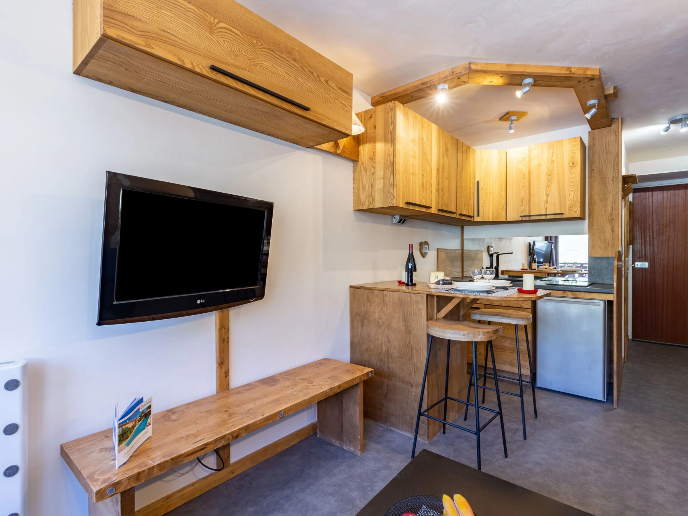 1-room studio 19 m2 on 3rd floor. Renovated, practical and tasteful furnishings: entrance hall with 2 wall-trunk beds (80 cm, length 190 cm). Living/dining room with 1 pull-out bed (2 pers. 2 x 80 cm, length 190 cm), flat screen. Exit to the balcony, west facing position. Kitchenette (dishwasher, 2 ceramic glass hob hotplates, microwave, electric coffee machine). Bathroom. Balcony 3 m2. Beautiful view of the mountains. Facilities: Internet (WiFi, free). Please note: non-smokers only. Smoke alarm. [hidden]