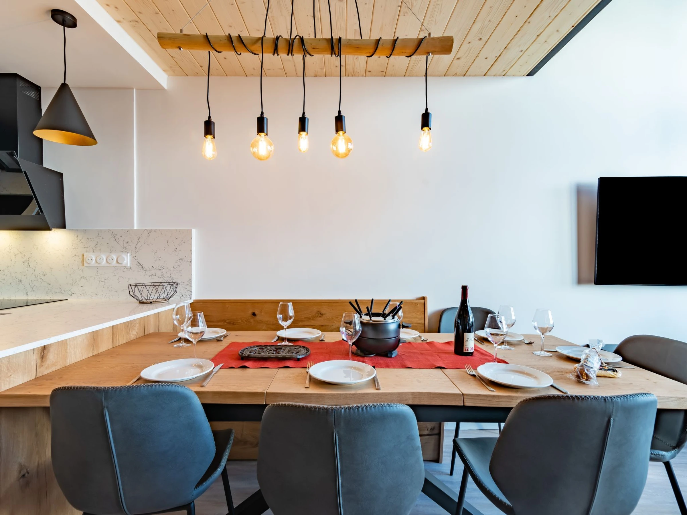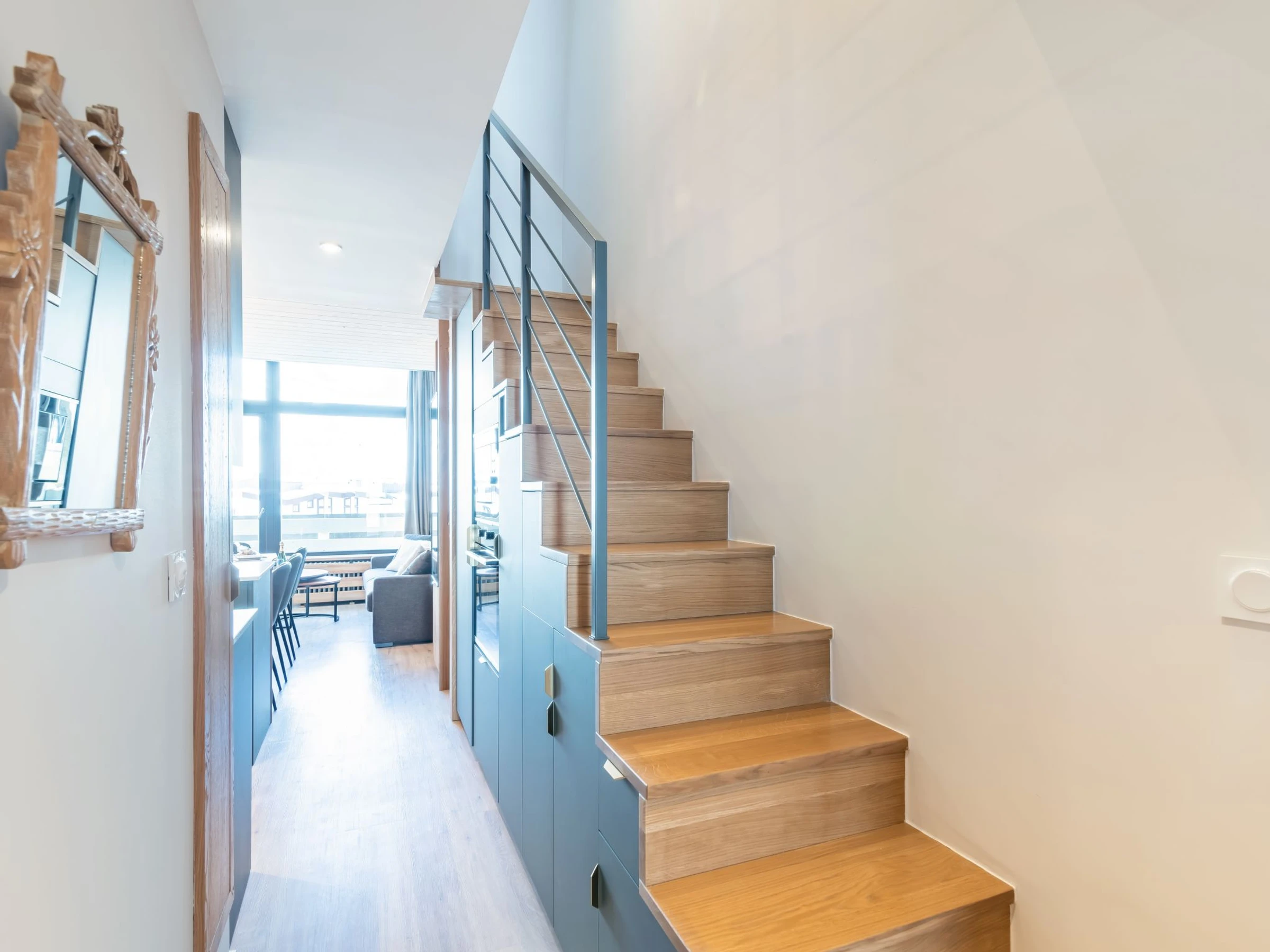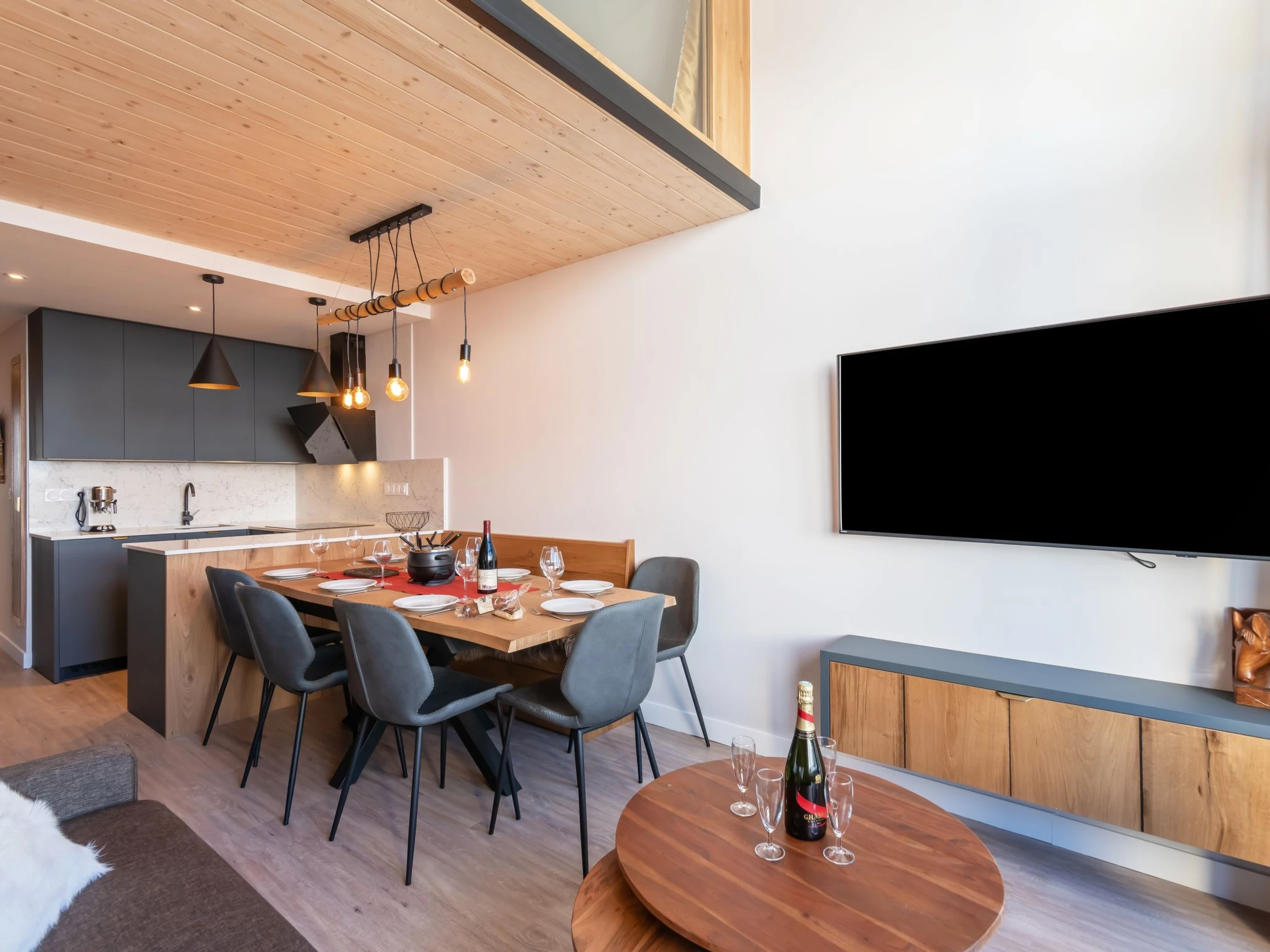 4-room apartment 60 m2 on 2 levels on 4th floor. Fully renovated in 2022, luxurious and stylish furnishings: living/dining room with TV (flat screen). Exit to the balcony, south-west facing position. 1 room with 1 french bed (160 cm, length 200 cm), TV (flat screen). Exit to the balcony, north facing position. Open kitchen (oven, dishwasher, 4 induction hot plates, toaster, kettle, microwave, electric coffee machine, raclette grill, fondue Set (cheese)). Bathroom, sep. WC. Upper floor: 1 large children's room 15 m2, with sloping ceilings, ceiling height 230 - 120 cm with panoramic window, window onto the living room with 2 beds (80 cm, length 190 cm), 1 x 2 bunk beds (80 cm, length 190 cm), TV (flat screen). 1 room with 1 french bed (140 cm, length 190 cm), TV (flat screen). Shower/WC. Marvellous panoramic view of the mountains and the ski run. Facilities: washing machine, iron, hair dryer. Internet (WiFi, free). Please note: non-smokers only. Smoke alarm. UNLOADING AREA AT THE FOOT OF THE BUILDING, SKI IN / SKI OUT, PICTURES WAITING, BOOT DRYER, 4TH AND LAST FLOOR.